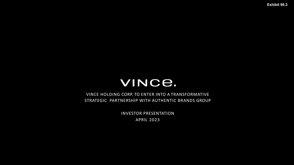 Exhibit 99.3 VINCE HOLDING CORP. TO ENTER INTO A TRANSFORMATIVE STRATEGIC PARTNERSHIP WITH AUTHENTIC BRANDS GROUP INVESTOR PRESENTATION APRIL 2023