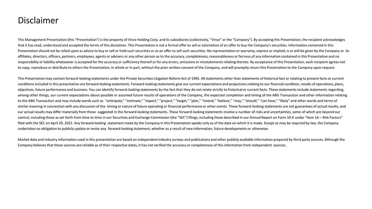 Disclaimer This Management Presentation (this “Presentation”) is the property of Vince Holding Corp. and its subsidiaries (collectively, “Vince” or the “Company”). By accepting this Presentation, the recipient acknowledges that it has read, understood and accepted the terms of this disclaimer. This Presentation is not a formal offer to sell or solicitation of an offer to buy the Company’s securities. Information contained in this Presentation should not be relied upon as advice to buy or sell or hold such securities or as an offer to sell such securities. No representation or warranty, express or implied, is or will be given by the Company or its affiliates, directors, officers, partners, employees, agents or advisers or any other person as to the accuracy, completeness, reasonableness or fairness of any information contained in this Presentation and no responsibility or liability whatsoever is accepted for the accuracy or sufficiency thereof or for any errors, omissions or misstatements relating thereto. By acceptance of this Presentation, each recipient agrees not to copy, reproduce or distribute to others the Presentation, in whole or in part, without the prior written consent of the Company, and will promptly return this Presentation to the Company upon request. This Presentation may contain forward-looking statements under the Private Securities Litigation Reform Act of 1995. All statements other than statements of historical fact or relating to present facts or current conditions included in this presentation are forward-looking statements. Forward-looking statements give our current expectations and projections relating to our financial condition, results of operations, plans, objectives, future performance and business. You can identify forward-looking statements by the fact that they do not relate strictly to historical or current facts. These statements include statements regarding, among other things, our current expectations about possible or assumed future results of operations of the Company, the expected completion and timing of the ABG Transaction and other information relating to the ABG Transaction and may include words such as “anticipate,” “estimate,” “expect,” “project,” “target,” “plan,” “intend,” “believe,” “may,” “should,” “can have,” “likely” and other words and terms of similar meaning in connection with any discussion of the timing or nature of future operating or financial performance or other events. These forward-looking statements are not guarantees of actual results, and our actual results may differ materially from those suggested in the forward-looking statements. These forward-looking statements involve a number of risks and uncertainties, some of which are beyond our control, including those as set forth from time to time in our Securities and Exchange Commission (the “SEC”) filings, including those described in our Annual Report on Form 10-K under “Item 1A – Risk Factors” filed with the SEC on April 29, 2022. Any forward-looking statement made by the Company in this Presentation speaks only as of the date on which it is made. Except as may be required by law, the Company undertakes no obligation to publicly update or revise any forward-looking statement, whether as a result of new information, future developments or otherwise. Market data and industry information used in this presentation are based on independent industry surveys and publications and other publicly available information prepared by third party sources. Although the Company believes that these sources are reliable as of their respective dates, it has not verified the accuracy or completeness of this information from independent sources.