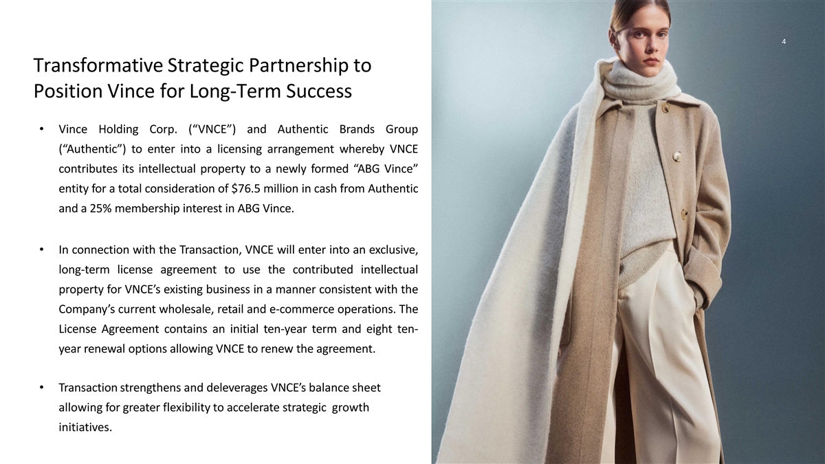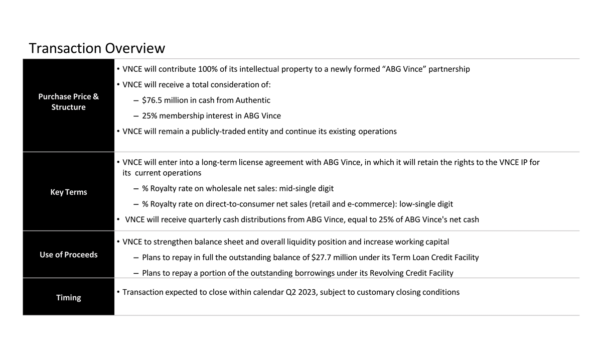 Transaction Overview • VNCE will contribute 100% of its intellectual property to a newly formed “ABG Vince” partnership • VNCE will receive a total consideration of: Purchase Price & – $76.5 million in cash from Authentic Structure – 25% membership interest in ABG Vince • VNCE will remain a publicly-traded entity and continue its existing operations • VNCE will enter into a long-term license agreement with ABG Vince, in which it will retain the rights to the VNCE IP for its current operations – % Royalty rate on wholesale net sales: mid-single digit Key Terms – % Royalty rate on direct-to-consumer net sales (retail and e-commerce): low-single digit • VNCE will receive quarterly cash distributions from ABG Vince, equal to 25% of ABG Vince's net cash • VNCE to strengthen balance sheet and overall liquidity position and increase working capital Use of Proceeds – Plans to repay in full the outstanding balance of $27.7 million under its Term Loan Credit Facility – Plans to repay a portion of the outstanding borrowings under its Revolving Credit Facility • Transaction expected to close within calendar Q2 2023, subject to customary closing conditions Timing