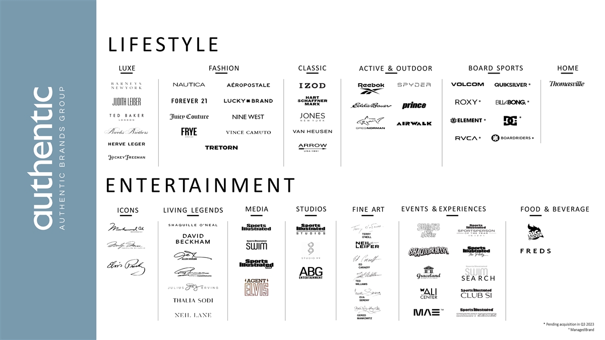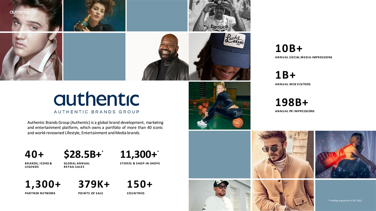* 551M+ S O CI AL M EDI A F OLLOWERS 10B+ AN N U AL S O CIAL M EDI A I MPR ES SIO NS 1B+ AN N U AL WEB VI SI TO RS 198B+ AN N U AL PR I M PR ESSI ONS Authentic Brands Group (Authentic) is a global brand development, marketing and entertainment platform, which owns a portfolio of more than 40 iconic and world-renowned Lifestyle, Entertainment and Media brands. * * 40+ $28.5B+ 11,300+ B R AN DS, I CO NS & GLO B AL AN N UAL S TO R ES & S HO P-IN-SHO PS LEGEN DS R ETAIL S ALES 1,300+ 379K+ 150+ PAR TN ER N ETWOR K PO I N TS OF S ALE CO U N TRI ES * Pending acquisition in Q3 2023