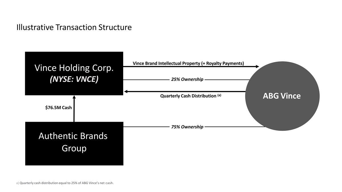 Illustrative Transaction Structure Vince Brand Intellectual Property (+ Royalty Payments) Vince Holding Corp. 25%Ownership (NYSE:VNCE) (a) Quarterly Cash Distribution ABG Vince $76.5M Cash 75%Ownership Authentic Brands Group a) Quarterly cash distribution equal to 25% of ABG Vince’s net cash.
