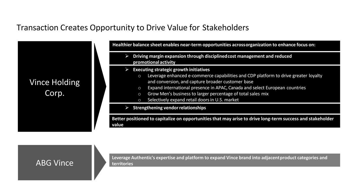 Transaction Creates Opportunity to Drive Value for Stakeholders Healthier balance sheet enables near-term opportunities acrossorganization to enhance focus on: ➢ Driving margin expansion through disciplinedcost management and reduced promotional activity ➢ Executing strategic growth initiatives o Leverage enhanced e-commerce capabilities and CDP platform to drive greater loyalty and conversion, and capture broader customer base Vince Holding o Expand international presence in APAC, Canada and select European countries o Grow Men’s business to larger percentage of total sales mix Corp. o Selectively expand retail doors in U.S. market ➢ Strengthening vendor relationships Better positioned to capitalize on opportunities that may arise to drive long-term success and stakeholder value Leverage Authentic's expertise and platform to expand Vince brand into adjacentproduct categories and territories ABG Vince
