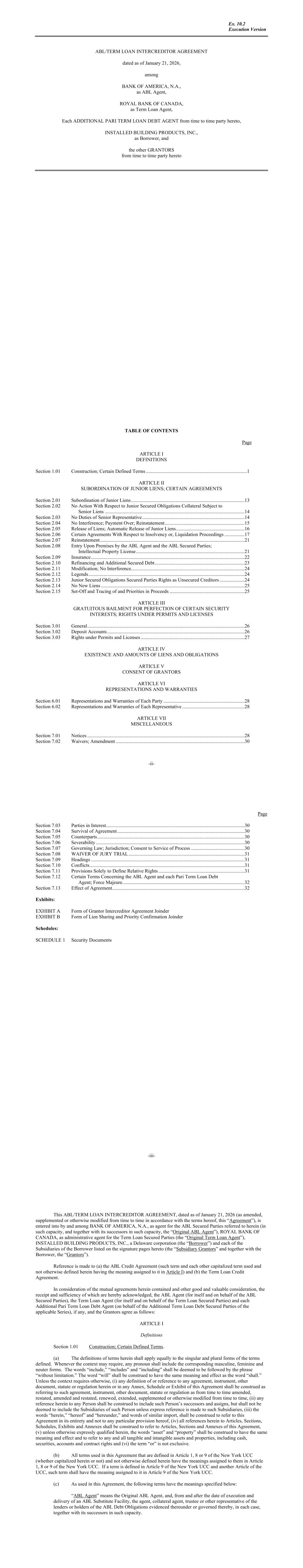 Ex. 10.2 Execution Version ABL/TERM LOAN INTERCREDITOR AGREEMENT dated as of January 21, 2026, among BANK OF AMERICA, N.A., as ABL Agent, ROYAL BANK OF CANADA, as Term Loan Agent, Each ADDITIONAL PARI TERM LOAN DEBT AGENT from time to time party hereto, INSTALLED BUILDING PRODUCTS, INC., as Borrower, and the other GRANTORS from time to time party hereto -ii- TABLE OF CONTENTS Page ARTICLE I DEFINITIONS Section 1.01 Construction; Certain Defined Terms .................................................................................1 ARTICLE II SUBORDINATION OF JUNIOR LIENS; CERTAIN AGREEMENTS Section 2.01 Subordination of Junior Liens ........................................................................................... 13 Section 2.02 No Action With Respect to Junior Secured Obligations Collateral Subject to Senior Liens ................................................................................................................ 14 Section 2.03 No Duties of Senior Representative .................................................................................. 14 Section 2.04 No Interference; Payment Over; Reinstatement ................................................................ 15 Section 2.05 Release of Liens; Automatic Release of Junior Liens ....................................................... 16 Section 2.06 Certain Agreements With Respect to Insolvency or, Liquidation Proceedings ................ 17 Section 2.07 Reinstatement .................................................................................................................... 21 Section 2.08 Entry Upon Premises by the ABL Agent and the ABL Secured Parties; Intellectual Property License ....................................................................................... 21 Section 2.09 Insurance ........................................................................................................................... 22 Section 2.10 Refinancing and Additional Secured Debt ........................................................................ 23 Section 2.11 Modification; No Interference ........................................................................................... 24 Section 2.12 Legends ............................................................................................................................. 24 Section 2.13 Junior Secured Obligations Secured Parties Rights as Unsecured Creditors .................... 24 Section 2.14 No New Liens ................................................................................................................... 25 Section 2.15 Set-Off and Tracing of and Priorities in Proceeds ............................................................ 25 ARTICLE III GRATUITOUS BAILMENT FOR PERFECTION OF CERTAIN SECURITY INTERESTS; RIGHTS UNDER PERMITS AND LICENSES Section 3.01 General .............................................................................................................................. 26 Section 3.02 Deposit Accounts .............................................................................................................. 26 Section 3.03 Rights under Permits and Licenses ................................................................................... 27 ARTICLE IV EXISTENCE AND AMOUNTS OF LIENS AND OBLIGATIONS ARTICLE V CONSENT OF GRANTORS ARTICLE VI REPRESENTATIONS AND WARRANTIES Section 6.01 Representations and Warranties of Each Party ................................................................. 28 Section 6.02 Representations and Warranties of Each Representative .................................................. 28 ARTICLE VII MISCELLANEOUS Section 7.01 Notices .............................................................................................................................. 28 Section 7.02 Waivers; Amendment ....................................................................................................... 30 Page -iii- Section 7.03 Parties in Interest ............................................................................................................... 30 Section 7.04 Survival of Agreement ...................................................................................................... 30 Section 7.05 Counterparts ...................................................................................................................... 30 Section 7.06 Severability ....................................................................................................................... 30 Section 7.07 Governing Law; Jurisdiction; Consent to Service of Process ........................................... 30 Section 7.08 WAIVER OF JURY TRIAL ............................................................................................. 31 Section 7.09 Headings ........................................................................................................................... 31 Section 7.10 Conflicts ............................................................................................................................ 31 Section 7.11 Provisions Solely to Define Relative Rights ..................................................................... 31 Section 7.12 Certain Terms Concerning the ABL Agent and each Pari Term Loan Debt Agent; Force Majeure .................................................................................................. 32 Section 7.13 Effect of Agreement .......................................................................................................... 32 Exhibits: EXHIBIT A Form of Grantor Intercreditor Agreement Joinder EXHIBIT B Form of Lien Sharing and Priority Confirmation Joinder Schedules: SCHEDULE 1 Security Documents This ABL/TERM LOAN INTERCREDITOR AGREEMENT, dated as of January 21, 2026 (as amended, supplemented or otherwise modified from time to time in accordance with the terms hereof, this “Agreement”), is entered into by and amon