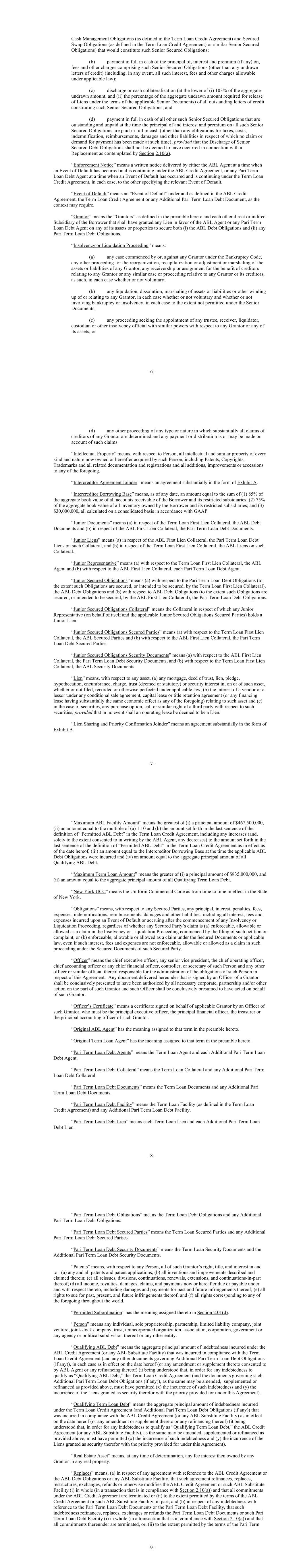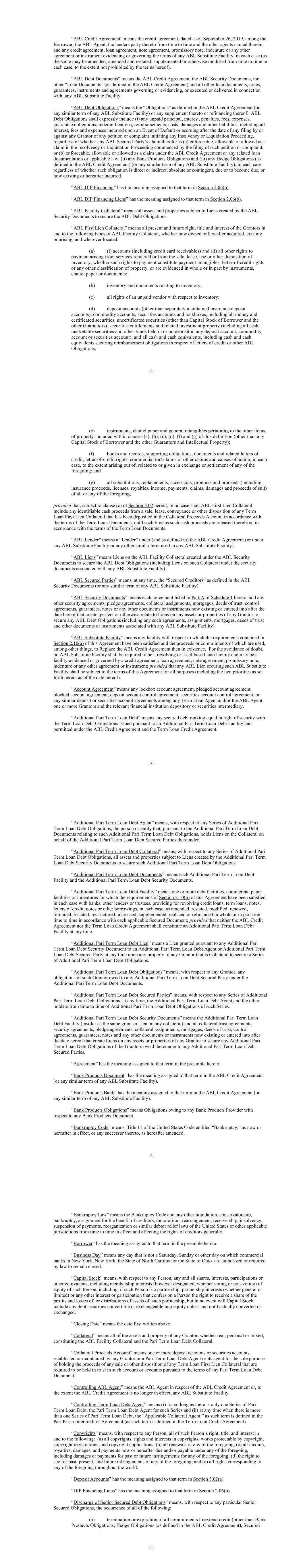 -2- “ABL Credit Agreement” means the credit agreement, dated as of September 26, 2019, among the Borrower, the ABL Agent, the lenders party thereto from time to time and the other agents named therein, and any credit agreement, loan agreement, note agreement, promissory note, indenture or any other agreement or instrument evidencing or governing the terms of any ABL Substitute Facility, in each case (as the same may be amended, amended and restated, supplemented or otherwise modified from time to time in each case, to the extent not prohibited by the terms hereof). “ABL Debt Documents” means the ABL Credit Agreement, the ABL Security Documents, the other “Loan Documents” (as defined in the ABL Credit Agreement) and all other loan documents, notes, guarantees, instruments and agreements governing or evidencing, or executed or delivered in connection with, any ABL Substitute Facility. “ABL Debt Obligations” means the “Obligations” as defined in the ABL Credit Agreement (or any similar term of any ABL Substitute Facility) or any supplement thereto or refinancing thereof. ABL Debt Obligations shall expressly include (i) any unpaid principal, interest, penalties, fees, expenses, guarantee obligations, indemnifications, reimbursements, costs, damages and other liabilities, including all interest, fees and expenses incurred upon an Event of Default or accruing after the date of any filing by or against any Grantor of any petition or complaint initiating any Insolvency or Liquidation Proceeding, regardless of whether any ABL Secured Party’s claim therefor is (a) enforceable, allowable or allowed as a claim in the Insolvency or Liquidation Proceeding commenced by the filing of such petition or complaint, or (b) enforceable, allowable or allowed as a claim under the ABL Credit Agreement or any related loan documentation or applicable law, (ii) any Bank Products Obligations and (iii) any Hedge Obligations (as defined in the ABL Credit Agreement) (or any similar term of any ABL Substitute Facility), in each case regardless of whether such obligation is direct or indirect, absolute or contingent, due or to become due, or now existing or hereafter incurred. “ABL DIP Financing” has the meaning assigned to that term in Section 2.06(b). “ABL DIP Financing Liens” has the meaning assigned to that term in Section 2.06(b). “ABL Facility Collateral” means all assets and properties subject to Liens created by the ABL Security Documents to secure the ABL Debt Obligations. “ABL First Lien Collateral” means all present and future right, title and interest of the Grantors in and to the following types of ABL Facility Collateral, whether now owned or hereafter acquired, existing or arising, and wherever located: (a) (i) accounts (including credit card receivables) and (ii) all other rights to payment arising from services rendered or from the sale, lease, use or other disposition of inventory, whether such rights to payment constitute payment intangibles, letter-of-credit rights or any other classification of property, or are evidenced in whole or in part by instruments, chattel paper or documents; (b) inventory and documents relating to inventory; (c) all rights of an unpaid vendor with respect to inventory; (d) deposit accounts (other than separately maintained insurance deposit accounts), commodity accounts, securities accounts and lockboxes, including all money and certificated securities, uncertificated securities (other than Capital Stock of Borrower and the other Guarantors), securities entitlements and related investment property (including all cash, marketable securities and other funds held in or on deposit in any deposit account, commodity account or securities account), and all cash and cash equivalents, including cash and cash equivalents securing reimbursement obligations in respect of letters of credit or other ABL Obligations; -3- (e) instruments, chattel paper and general intangibles pertaining to the other items of property included within clauses (a), (b), (c), (d), (f) and (g) of this definition (other than any Capital Stock of Borrower and the other Guarantors and Intellectual Property); (f) books and records, supporting obligations, documents and related letters of credit, letter-of-credit rights, commercial tort claims or other claims and causes of action, in each case, to the extent arising out of, related to or given in exchange or settlement of any of the foregoing; and (g) all substitutions, replacements, accessions, products and proceeds (including insurance proceeds, licenses, royalties, income, payments, claims, damages and proceeds of suit) of all or any of the foregoing; provided that, subject to clause (c) of Section 3.02 hereof, in no case shall ABL First Lien Collateral include any identifiable cash proceeds from a sale, lease, conveyance or other disposition of any Term Loan First Lien Collateral that has been deposited in the Collateral Proceeds Account in accordance with the terms of the Term Loan Documents, until such time as such cash proceeds are released therefrom in accordance with the terms of the Term Loan Documents. “ABL Lender” means a “Lender” under (and as defined in) the ABL Credit Agreement (or under any ABL Substitute Facility or any other similar term used in any ABL Substitute Facility). “ABL Liens” means Liens on the ABL Facility Collateral created under the ABL Security Documents to secure the ABL Debt Obligations (including Liens on such Collateral under the security documents associated with any ABL Substitute Facility). “ABL Secured Parties” means, at any time, the “Secured Creditors” as defined in the ABL Security Documents (or any similar term of any ABL Substitute Facility). “ABL Security Documents” means each agreement listed in Part A of Schedule 1 hereto, and any other security agreements, pledge agreements, collateral assignments, mortgages, deeds of trust, control agreements, guarantees, 