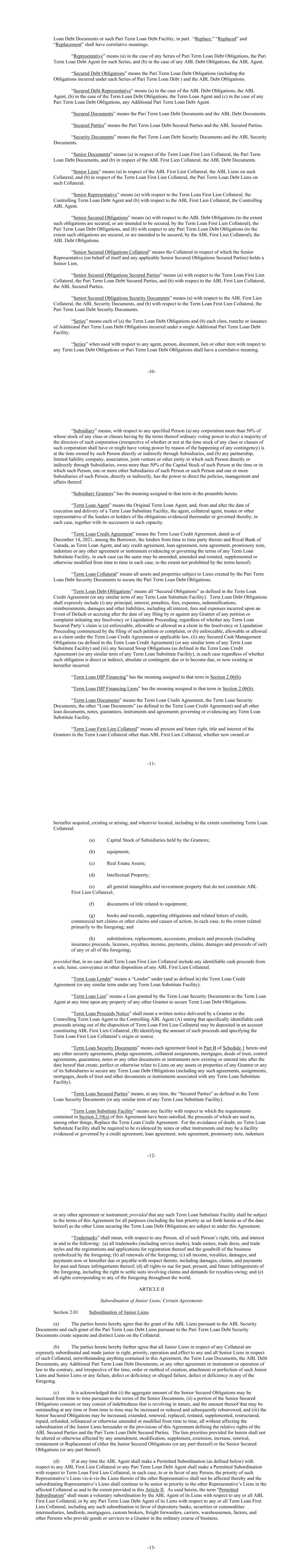 -10- Loan Debt Documents or such Pari Term Loan Debt Facility, in part. “Replace,” “Replaced” and “Replacement” shall have correlative meanings. “Representative” means (a) in the case of any Series of Pari Term Loan Debt Obligations, the Pari Term Loan Debt Agent for such Series, and (b) in the case of any ABL Debt Obligations, the ABL Agent. “Secured Debt Obligations” means the Pari Term Loan Debt Obligations (including the Obligations incurred under each Series of Pari Term Loan Debt ) and the ABL Debt Obligations. “Secured Debt Representative” means (a) in the case of the ABL Debt Obligations, the ABL Agent, (b) in the case of the Term Loan Debt Obligations, the Term Loan Agent and (c) in the case of any Pari Term Loan Debt Obligations, any Additional Pari Term Loan Debt Agent. “Secured Documents” means the Pari Term Loan Debt Documents and the ABL Debt Documents. “Secured Parties” means the Pari Term Loan Debt Secured Parties and the ABL Secured Parties. “Security Documents” means the Pari Term Loan Debt Security Documents and the ABL Security Documents. “Senior Documents” means (a) in respect of the Term Loan First Lien Collateral, the Pari Term Loan Debt Documents, and (b) in respect of the ABL First Lien Collateral, the ABL Debt Documents. “Senior Liens” means (a) in respect of the ABL First Lien Collateral, the ABL Liens on such Collateral, and (b) in respect of the Term Loan First Lien Collateral, the Pari Term Loan Debt Liens on such Collateral. “Senior Representative” means (a) with respect to the Term Loan First Lien Collateral, the Controlling Term Loan Debt Agent and (b) with respect to the ABL First Lien Collateral, the Controlling ABL Agent. “Senior Secured Obligations” means (a) with respect to the ABL Debt Obligations (to the extent such obligations are secured, or are intended to be secured, by the Term Loan First Lien Collateral), the Pari Term Loan Debt Obligations, and (b) with respect to any Pari Term Loan Debt Obligations (to the extent such obligations are secured, or are intended to be secured, by the ABL First Lien Collateral), the ABL Debt Obligations. “Senior Secured Obligations Collateral” means the Collateral in respect of which the Senior Representative (on behalf of itself and any applicable Senior Secured Obligations Secured Parties) holds a Senior Lien. “Senior Secured Obligations Secured Parties” means (a) with respect to the Term Loan First Lien Collateral, the Pari Term Loan Debt Secured Parties, and (b) with respect to the ABL First Lien Collateral, the ABL Secured Parties. “Senior Secured Obligations Security Documents” means (a) with respect to the ABL First Lien Collateral, the ABL Security Documents, and (b) with respect to the Term Loan First Lien Collateral, the Pari Term Loan Debt Security Documents. “Series” means each of (a) the Term Loan Debt Obligations and (b) each class, tranche or issuance of Additional Pari Term Loan Debt Obligations incurred under a single Additional Pari Term Loan Debt Facility. “Series” when used with respect to any agent, person, document, lien or other item with respect to any Term Loan Debt Obligations or Pari Term Loan Debt Obligations shall have a correlative meaning. -11- “Subsidiary” means, with respect to any specified Person (a) any corporation more than 50% of whose stock of any class or classes having by the terms thereof ordinary voting power to elect a majority of the directors of such corporation (irrespective of whether or not at the time stock of any class or classes of such corporation shall have or might have voting power by reason of the happening of any contingency) is at the time owned by such Person directly or indirectly through Subsidiaries, and (b) any partnership, limited liability company, association, joint venture or other entity in which such Person directly or indirectly through Subsidiaries, owns more than 50% of the Capital Stock of such Person at the time or in which such Person, one or more other Subsidiaries of such Person or such Person and one or more Subsidiaries of such Person, directly or indirectly, has the power to direct the policies, management and affairs thereof. “Subsidiary Grantors” has the meaning assigned to that term in the preamble hereto. “Term Loan Agent” means the Original Term Loan Agent, and, from and after the date of execution and delivery of a Term Loan Substitute Facility, the agent, collateral agent, trustee or other representative of the lenders or holders of the obligations evidenced thereunder or governed thereby, in each case, together with its successors in such capacity. “Term Loan Credit Agreement” means the Term Loan Credit Agreement, dated as of December 14, 2021, among the Borrower, the lenders from time to time party thereto and Royal Bank of Canada, as Term Loan Agent, and any credit agreement, loan agreement, note agreement, promissory note, indenture or any other agreement or instrument evidencing or governing the terms of any Term Loan Substitute Facility, in each case (as the same may be amended, amended and restated, supplemented or otherwise modified from time to time in each case, to the extent not prohibited by the terms hereof). “Term Loan Collateral” means all assets and properties subject to Liens created by the Pari Term Loan Debt Security Documents to secure the Pari Term Loan Debt Obligations. “Term Loan Debt Obligations” means all “Secured Obligations” as defined in the Term Loan Credit Agreement (or any similar term of any Term Loan Substitute Facility). Term Loan Debt Obligations shall expressly include (i) any principal, interest, penalties, fees, expenses, indemnifications, reimbursements, damages and other liabilities, including all interest, fees and expenses incurred upon an Event of Default or accruing after the date of any filing by or against any Grantor of any petition or complaint initiating any Insolvency or Liquida