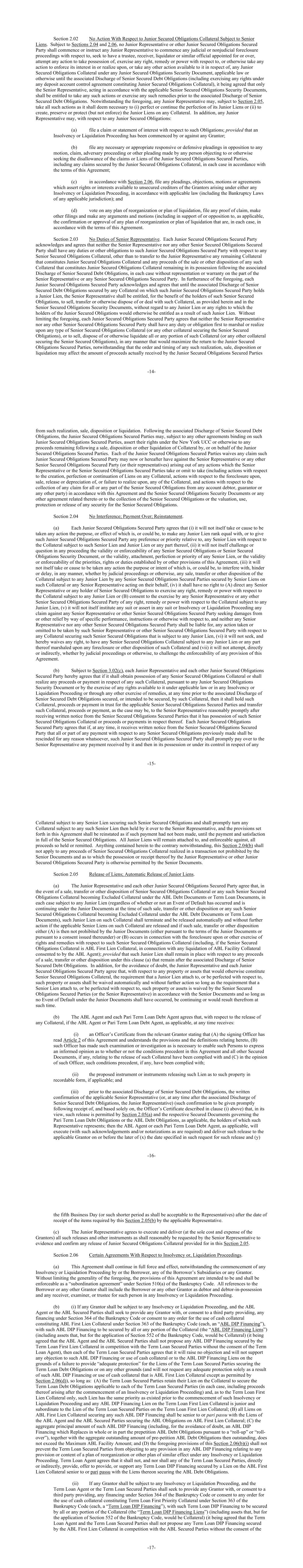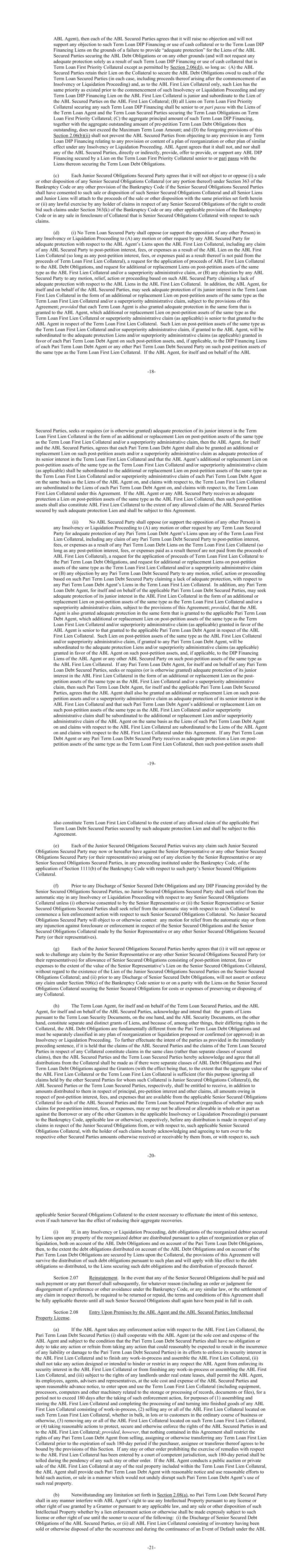 -18- ABL Agent), then each of the ABL Secured Parties agrees that it will raise no objection and will not support any objection to such Term Loan DIP Financing or use of cash collateral or to the Term Loan DIP Financing Liens on the grounds of a failure to provide “adequate protection” for the Liens of the ABL Secured Parties securing the ABL Debt Obligations or on any other grounds (and will not request any adequate protection solely as a result of such Term Loan DIP Financing or use of cash collateral that is Term Loan First Priority Collateral except as permitted by Section 2.06(d)), so long as: (A) the ABL Secured Parties retain their Lien on the Collateral to secure the ABL Debt Obligations owed to each of the Term Loan Secured Parties (in each case, including proceeds thereof arising after the commencement of an Insolvency or Liquidation Proceeding) and, as to the ABL First Lien Collateral only, such Lien has the same priority as existed prior to the commencement of such Insolvency or Liquidation Proceeding and any Term Loan DIP Financing Lien on the ABL First Lien Collateral is junior and subordinate to the Lien of the ABL Secured Parties on the ABL First Lien Collateral; (B) all Liens on Term Loan First Priority Collateral securing any such Term Loan DIP Financing shall be senior to or pari passu with the Liens of the Term Loan Agent and the Term Loan Secured Parties securing the Term Loan Obligations on Term Loan First Priority Collateral; (C) the aggregate principal amount of such Term Loan DIP Financing, together with the aggregate outstanding amount of pre-petition Term Loan Debt Obligations then outstanding, does not exceed the Maximum Term Loan Amount; and (D) the foregoing provisions of this Section 2.06(b)(ii) shall not prevent the ABL Secured Parties from objecting to any provision in any Term Loan DIP Financing relating to any provision or content of a plan of reorganization or other plan of similar effect under any Insolvency or Liquidation Proceeding. ABL Agent agrees that it shall not, and nor shall any of the ABL Secured Parties, directly or indirectly, provide, offer to provide, or support any ABL DIP Financing secured by a Lien on the Term Loan First Priority Collateral senior to or pari passu with the Liens thereon securing the Term Loan Debt Obligations. (c) Each Junior Secured Obligations Secured Party agrees that it will not object to or oppose (i) a sale or other disposition of any Senior Secured Obligations Collateral (or any portion thereof) under Section 363 of the Bankruptcy Code or any other provision of the Bankruptcy Code if the Senior Secured Obligations Secured Parties shall have consented to such sale or disposition of such Senior Secured Obligations Collateral and all Senior Liens and Junior Liens will attach to the proceeds of the sale or other disposition with the same priorities set forth herein or (ii) any lawful exercise by any holder of claims in respect of any Senior Secured Obligations of the right to credit bid such claims under Section 363(k) of the Bankruptcy Code or any other applicable provision of the Bankruptcy Code or in any sale in foreclosure of Collateral that is Senior Secured Obligations Collateral with respect to such claims. (d) (i) No Term Loan Secured Party shall oppose (or support the opposition of any other Person) in any Insolvency or Liquidation Proceeding to (A) any motion or other request by any ABL Secured Party for adequate protection with respect to the ABL Agent’s Liens upon the ABL First Lien Collateral, including any claim of any ABL Secured Party to post-petition interest, fees, or expenses as a result of the ABL Lien on the ABL First Lien Collateral (so long as any post-petition interest, fees, or expenses paid as a result thereof is not paid from the proceeds of Term Loan First Lien Collateral), a request for the application of proceeds of ABL First Lien Collateral to the ABL Debt Obligations, and request for additional or replacement Liens on post-petition assets of the same type as the ABL First Lien Collateral and/or a superpriority administrative claim, or (B) any objection by any ABL Secured Party to any motion, relief, action or proceeding based on such ABL Secured Party claiming a lack of adequate protection with respect to the ABL Liens in the ABL First Lien Collateral. In addition, the ABL Agent, for itself and on behalf of the ABL Secured Parties, may seek adequate protection of its junior interest in the Term Loan First Lien Collateral in the form of an additional or replacement Lien on post-petition assets of the same type as the Term Loan First Lien Collateral and/or a superpriority administrative claim, subject to the provisions of this Agreement; provided that each Term Loan Agent is also granted adequate protection in the same form that is granted to the ABL Agent, which additional or replacement Lien on post-petition assets of the same type as the Term Loan First Lien Collateral or superpriority administrative claim (as applicable) is senior to that granted to the ABL Agent in respect of the Term Loan First Lien Collateral. Such Lien on post-petition assets of the same type as the Term Loan First Lien Collateral and/or superpriority administrative claim, if granted to the ABL Agent, will be subordinated to the adequate protection Liens and/or superpriority administrative claims (as applicable) granted in favor of each Pari Term Loan Debt Agent on such post-petition assets, and, if applicable, to the DIP Financing Liens of each Pari Term Loan Debt Agent or any other Pari Term Loan Debt Secured Party on such post-petition assets of the same type as the Term Loan First Lien Collateral. If the ABL Agent, for itself and on behalf of the ABL -19- Secured Parties, seeks or requires (or is otherwise granted) adequate protection of its junior interest in the Term Loan First Lien Collateral in the form of an additional or replacement Lien on post-petition assets of the same type as the Term Loan 