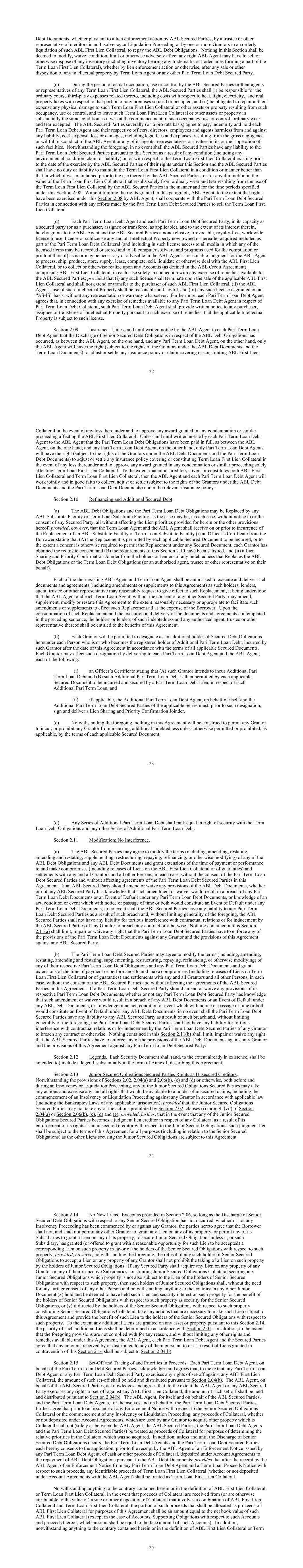 -22- Debt Documents, whether pursuant to a lien enforcement action by ABL Secured Parties, by a trustee or other representative of creditors in an Insolvency or Liquidation Proceeding or by one or more Grantors in an orderly liquidation of such ABL First Lien Collateral, to repay the ABL Debt Obligations. Nothing in this Section shall be deemed to modify, waive, condition, limit or otherwise adversely affect any right ABL Agent may have to sell or otherwise dispose of any inventory (including inventory bearing any trademarks or tradenames forming a part of the Term Loan First Lien Collateral), whether by lien enforcement action or otherwise, after any sale or other disposition of any intellectual property by Term Loan Agent or any other Pari Term Loan Debt Secured Party. (c) During the period of actual occupation, use or control by the ABL Secured Parties or their agents or representatives of any Term Loan First Lien Collateral, the ABL Secured Parties shall (i) be responsible for the ordinary course third-party expenses related thereto, including costs with respect to heat, light, electricity, and real property taxes with respect to that portion of any premises so used or occupied, and (ii) be obligated to repair at their expense any physical damage to such Term Loan First Lien Collateral or other assets or property resulting from such occupancy, use or control, and to leave such Term Loan First Lien Collateral or other assets or property in substantially the same condition as it was at the commencement of such occupancy, use or control, ordinary wear and tear excepted. The ABL Secured Parties severally (on a pro rata basis) agree to pay, indemnify and hold each Pari Term Loan Debt Agent and their respective officers, directors, employees and agents harmless from and against any liability, cost, expense, loss or damages, including legal fees and expenses, resulting from the gross negligence or willful misconduct of the ABL Agent or any of its agents, representatives or invitees in its or their operation of such facilities. Notwithstanding the foregoing, in no event shall the ABL Secured Parties have any liability to the Pari Term Loan Debt Secured Parties pursuant to this Section as a result of any condition (including any environmental condition, claim or liability) on or with respect to the Term Loan First Lien Collateral existing prior to the date of the exercise by the ABL Secured Parties of their rights under this Section and the ABL Secured Parties shall have no duty or liability to maintain the Term Loan First Lien Collateral in a condition or manner better than that in which it was maintained prior to the use thereof by the ABL Secured Parties, or for any diminution in the value of the Term Loan First Lien Collateral that results solely from ordinary wear and tear resulting from the use of the Term Loan First Lien Collateral by the ABL Secured Parties in the manner and for the time periods specified under this Section 2.08. Without limiting the rights granted in this paragraph, ABL Agent, to the extent that rights have been exercised under this Section 2.08 by ABL Agent, shall cooperate with the Pari Term Loan Debt Secured Parties in connection with any efforts made by the Pari Term Loan Debt Secured Parties to sell the Term Loan First Lien Collateral. (d) Each Pari Term Loan Debt Agent and each Pari Term Loan Debt Secured Party, in its capacity as a secured party (or as a purchaser, assignee or transferee, as applicable), and to the extent of its interest therein, hereby grants to the ABL Agent and the ABL Secured Parties a nonexclusive, irrevocable, royalty-free, worldwide license to use, license or sublicense any and all Intellectual Property now owned or hereafter acquired included as part of the Pari Term Loan Debt Collateral (and including in such license access to all media in which any of the licensed items may be recorded or stored and to all computer software and programs used for the compilation or printout thereof) as is or may be necessary or advisable in the ABL Agent’s reasonable judgment for the ABL Agent to process, ship, produce, store, supply, lease, complete, sell, liquidate or otherwise deal with the ABL First Lien Collateral, or to collect or otherwise realize upon any Accounts (as defined in the ABL Credit Agreement) comprising ABL First Lien Collateral, in each case solely in connection with any exercise of remedies available to the ABL Secured Parties; provided that (i) any such license shall terminate upon the sale of the applicable ABL First Lien Collateral and shall not extend or transfer to the purchaser of such ABL First Lien Collateral, (ii) the ABL Agent’s use of such Intellectual Property shall be reasonable and lawful, and (iii) any such license is granted on an “AS-IS” basis, without any representation or warranty whatsoever. Furthermore, each Pari Term Loan Debt Agent agrees that, in connection with any exercise of remedies available to any Pari Term Loan Debt Agent in respect of Pari Term Loan Debt Collateral, such Pari Term Loan Debt Agent shall provide written notice to any purchaser, assignee or transferee of Intellectual Property pursuant to such exercise of remedies, that the applicable Intellectual Property is subject to such license. Section 2.09 Insurance. Unless and until written notice by the ABL Agent to each Pari Term Loan Debt Agent that the Discharge of Senior Secured Debt Obligations in respect of the ABL Debt Obligations has occurred, as between the ABL Agent, on the one hand, and any Pari Term Loan Debt Agent, on the other hand, only the ABL Agent will have the right (subject to the rights of the Grantors under the ABL Debt Documents and the Term Loan Documents) to adjust or settle any insurance policy or claim covering or constituting ABL First Lien -23- Collateral in the event of any loss thereunder and to approve any award granted in any condemnation or similar proceeding affecting the ABL First Lien Collateral. Un