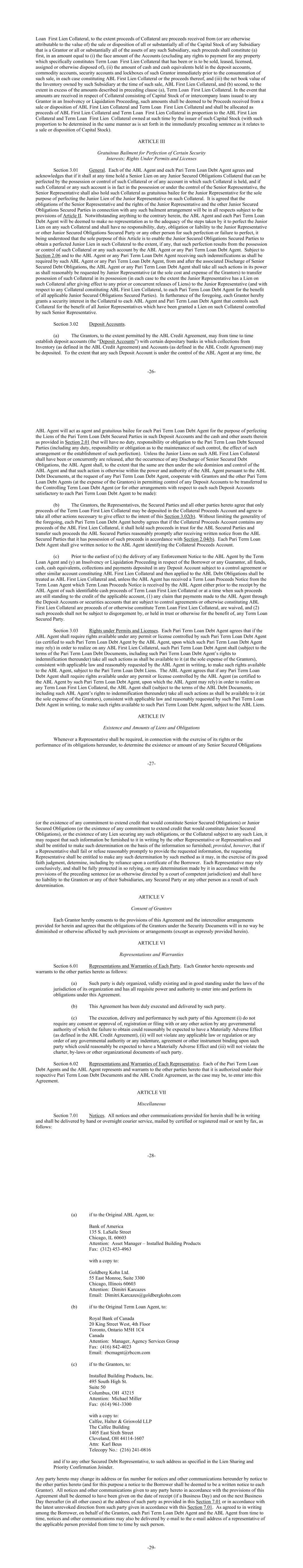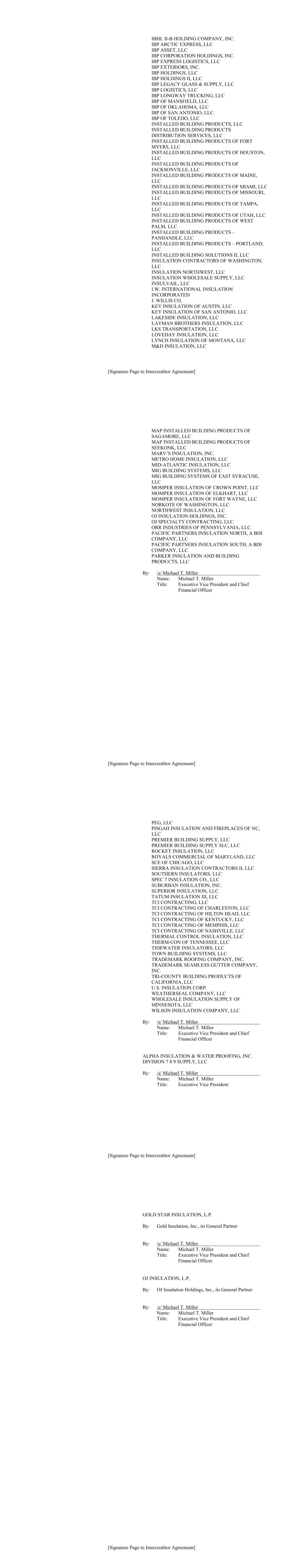 [Signature Page to Intercreditor Agreement] IBHL II-B HOLDING COMPANY, INC. IBP ARCTIC EXPRESS, LLC IBP ASSET, LLC IBP CORPORATION HOLDINGS, INC. IBP EXPRESS LOGISTICS, LLC IBP EXTERIORS, INC. IBP HOLDINGS, LLC IBP HOLDINGS II, LLC IBP LEGACY GLASS & SUPPLY, LLC IBP LOGISTICS, LLC IBP LONGWAY TRUCKING, LLC IBP OF MANSFIELD, LLC IBP OF OKLAHOMA, LLC IBP OF SAN ANTONIO, LLC IBP OF TOLEDO, LLC INSTALLED BUILDING PRODUCTS, LLC INSTALLED BUILDING PRODUCTS DISTRIBUTION SERVICES, LLC INSTALLED BUILDING PRODUCTS OF FORT MYERS, LLC INSTALLED BUILDING PRODUCTS OF HOUSTON, LLC INSTALLED BUILDING PRODUCTS OF JACKSONVILLE, LLC INSTALLED BUILDING PRODUCTS OF MAINE, LLC INSTALLED BUILDING PRODUCTS OF MIAMI, LLC INSTALLED BUILDING PRODUCTS OF MISSOURI, LLC INSTALLED BUILDING PRODUCTS OF TAMPA, LLC INSTALLED BUILDING PRODUCTS OF UTAH, LLC INSTALLED BUILDING PRODUCTS OF WEST PALM, LLC INSTALLED BUILDING PRODUCTS – PANHANDLE, LLC INSTALLED BUILDING PRODUCTS – PORTLAND, LLC INSTALLED BUILDING SOLUTIONS II, LLC INSULATION CONTRACTORS OF WASHINGTON, LLC INSULATION NORTHWEST, LLC INSULATION WHOLESALE SUPPLY, LLC INSULVAIL, LLC I.W. INTERNATIONAL INSULATION INCORPORATED J. WILLIS CO. KEY INSULATION OF AUSTIN, LLC KEY INSULATION OF SAN ANTONIO, LLC LAKESIDE INSULATION, LLC LAYMAN BROTHERS INSULATION, LLC LKS TRANSPORTATION, LLC LOVEDAY INSULATION, LLC LYNCH INSULATION OF MONTANA, LLC M&D INSULATION, LLC [Signature Page to Intercreditor Agreement] MAP INSTALLED BUILDING PRODUCTS OF SAGAMORE, LLC MAP INSTALLED BUILDING PRODUCTS OF SEEKONK, LLC MARV’S INSULATION, INC. METRO HOME INSULATION, LLC MID-ATLANTIC INSULATION, LLC MIG BUILDING SYSTEMS, LLC MIG BUILDING SYSTEMS OF EAST SYRACUSE, LLC MOMPER INSULATION OF CROWN POINT, LLC MOMPER INSULATION OF ELKHART, LLC MOMPER INSULATION OF FORT WAYNE, LLC NORKOTE OF WASHINGTON, LLC NORTHWEST INSULATION, LLC OJ INSULATION HOLDINGS, INC. OJ SPECIALTY CONTRACTING, LLC ORR INDUSTRIES OF PENNSYLVANIA, LLC PACIFIC PARTNERS INSULATION NORTH, A BDI COMPANY, LLC PACIFIC PARTNERS INSULATION SOUTH, A BDI COMPANY, LLC PARKER INSULATION AND BUILDING PRODUCTS, LLC By: /s/ Michael T. Miller Name: Michael T. Miller Title: Executive Vice President and Chief Financial Officer [Signature Page to Intercreditor Agreement] PEG, LLC PISGAH INSULATION AND FIREPLACES OF NC, LLC PREMIER BUILDING SUPPLY, LLC PREMIER BUILDING SUPPLY SLC, LLC ROCKET INSULATION, LLC ROYALS COMMERCIAL OF MARYLAND, LLC SCE OF CHICAGO, LLC SIERRA INSULATION CONTRACTORS II, LLC SOUTHERN INSULATORS, LLC SPEC 7 INSULATION CO., LLC SUBURBAN INSULATION, INC. SUPERIOR INSULATION, LLC TATUM INSULATION III, LLC TCI CONTRACTING, LLC TCI CONTRACTING OF CHARLESTON, LLC TCI CONTRACTING OF HILTON HEAD, LLC TCI CONTRACTING OF KENTUCKY, LLC TCI CONTRACTING OF MEMPHIS, LLC TCI CONTRACTING OF NASHVILLE, LLC THERMAL CONTROL INSULATION, LLC THERM-CON OF TENNESSEE, LLC TIDEWATER INSULATORS, LLC TOWN BUILDING SYSTEMS, LLC TRADEMARK ROOFING COMPANY, INC. TRADEMARK SEAMLESS GUTTER COMPANY, INC. TRI-COUNTY BUILDING PRODUCTS OF CALIFORNIA, LLC U.S. INSULATION CORP. WEATHERSEAL COMPANY, LLC WHOLESALE INSULATION SUPPLY OF MINNESOTA, LLC WILSON INSULATION COMPANY, LLC By: /s/ Michael T. Miller Name: Michael T. Miller Title: Executive Vice President and Chief Financial Officer ALPHA INSULATION & WATER PROOFING, INC. DIVISION 7 8 9 SUPPLY, LLC By: /s/ Michael T. Miller Name: Michael T. Miller Title: Executive Vice President [Signature Page to Intercreditor Agreement] GOLD STAR INSULATION, L.P. By: Gold Insulation, Inc., its General Partner By: /s/ Michael T. Miller Name: Michael T. Miller Title: Executive Vice President and Chief Financial Officer OJ INSULATION, L.P. By: OJ Insulation Holdings, Inc., its General Partner By: /s/ Michael T. Miller Name: Michael T. Miller Title: Executive Vice President and Chief Financial Officer