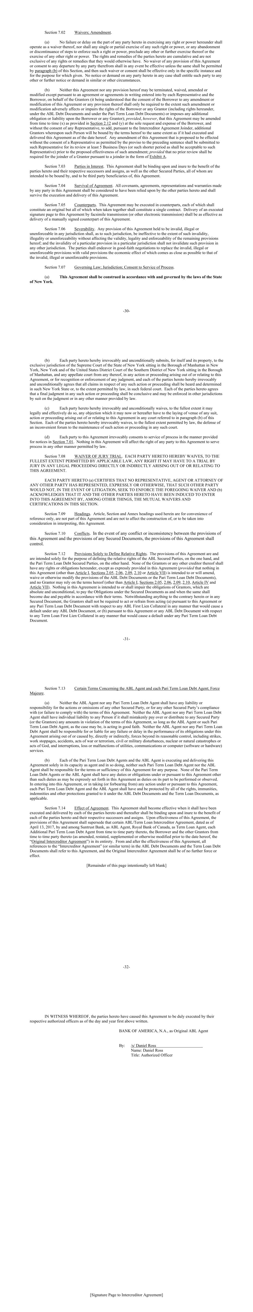 -30- Section 7.02 Waivers; Amendment. (a) No failure or delay on the part of any party hereto in exercising any right or power hereunder shall operate as a waiver thereof, nor shall any single or partial exercise of any such right or power, or any abandonment or discontinuance of steps to enforce such a right or power, preclude any other or further exercise thereof or the exercise of any other right or power. The rights and remedies of the parties hereto are cumulative and are not exclusive of any rights or remedies that they would otherwise have. No waiver of any provision of this Agreement or consent to any departure by any party therefrom shall in any event be effective unless the same shall be permitted by paragraph (b) of this Section, and then such waiver or consent shall be effective only in the specific instance and for the purpose for which given. No notice or demand on any party hereto in any case shall entitle such party to any other or further notice or demand in similar or other circumstances. (b) Neither this Agreement nor any provision hereof may be terminated, waived, amended or modified except pursuant to an agreement or agreements in writing entered into by each Representative and the Borrower, on behalf of the Grantors (it being understood that the consent of the Borrower to any amendment or modification of this Agreement or any provision thereof shall only be required to the extent such amendment or modification adversely affects or impairs the rights of the Borrower or any Grantor (including rights hereunder, under the ABL Debt Documents and under the Pari Term Loan Debt Documents) or imposes any additional obligation or liability upon the Borrower or any Grantor); provided, however, that this Agreement may be amended from time to time (x) as provided in Section 2.12 and (y) at the sole request and expense of the Borrower, and without the consent of any Representative, to add, pursuant to the Intercreditor Agreement Joinder, additional Grantors whereupon such Person will be bound by the terms hereof to the same extent as if it had executed and delivered this Agreement as of the date hereof. Any amendment of this Agreement that is proposed to be effected without the consent of a Representative as permitted by the proviso to the preceding sentence shall be submitted to such Representative for its review at least 5 Business Days (or such shorter period as shall be acceptable to such Representative) prior to the proposed effectiveness of such amendment; provided that no prior review shall be required for the joinder of a Grantor pursuant to a joinder in the form of Exhibit A. Section 7.03 Parties in Interest. This Agreement shall be binding upon and inure to the benefit of the parties hereto and their respective successors and assigns, as well as the other Secured Parties, all of whom are intended to be bound by, and to be third party beneficiaries of, this Agreement. Section 7.04 Survival of Agreement. All covenants, agreements, representations and warranties made by any party in this Agreement shall be considered to have been relied upon by the other parties hereto and shall survive the execution and delivery of this Agreement. Section 7.05 Counterparts. This Agreement may be executed in counterparts, each of which shall constitute an original but all of which when taken together shall constitute a single contract. Delivery of an executed signature page to this Agreement by facsimile transmission (or other electronic transmission) shall be as effective as delivery of a manually signed counterpart of this Agreement. Section 7.06 Severability. Any provision of this Agreement held to be invalid, illegal or unenforceable in any jurisdiction shall, as to such jurisdiction, be ineffective to the extent of such invalidity, illegality or unenforceability without affecting the validity, legality and enforceability of the remaining provisions hereof; and the invalidity of a particular provision in a particular jurisdiction shall not invalidate such provision in any other jurisdiction. The parties shall endeavor in good-faith negotiations to replace the invalid, illegal or unenforceable provisions with valid provisions the economic effect of which comes as close as possible to that of the invalid, illegal or unenforceable provisions. Section 7.07 Governing Law; Jurisdiction; Consent to Service of Process. (a) This Agreement shall be construed in accordance with and governed by the laws of the State of New York. -31- (b) Each party hereto hereby irrevocably and unconditionally submits, for itself and its property, to the exclusive jurisdiction of the Supreme Court of the State of New York sitting in the Borough of Manhattan in New York, New York and of the United States District Court of the Southern District of New York sitting in the Borough of Manhattan, and any appellate court from any thereof, in any action or proceeding arising out of or relating to this Agreement, or for recognition or enforcement of any judgment, and each of the parties hereto hereby irrevocably and unconditionally agrees that all claims in respect of any such action or proceeding shall be heard and determined in such New York State or, to the extent permitted by law, in such federal court. Each of the parties hereto agrees that a final judgment in any such action or proceeding shall be conclusive and may be enforced in other jurisdictions by suit on the judgment or in any other manner provided by law. (c) Each party hereto hereby irrevocably and unconditionally waives, to the fullest extent it may legally and effectively do so, any objection which it may now or hereafter have to the laying of venue of any suit, action or proceeding arising out of or relating to this Agreement in any court referred to in paragraph (b) of this Section. Each of the parties hereto hereby irrevocably waives, to the fullest extent permitted by law, the defense of an inconvenient forum to the maintenance of such action or procee