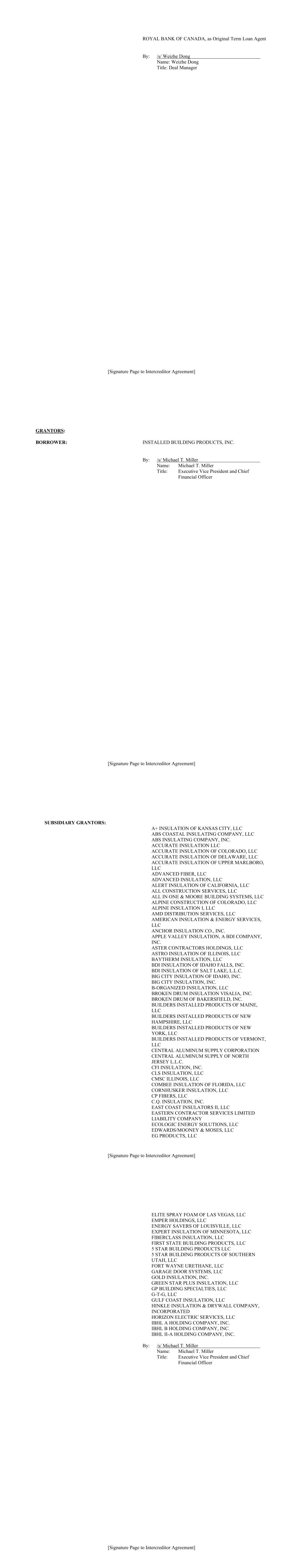 [Signature Page to Intercreditor Agreement] ROYAL BANK OF CANADA, as Original Term Loan Agent By: /s/ Weizhe Dong Name: Weizhe Dong Title: Deal Manager [Signature Page to Intercreditor Agreement] GRANTORS: BORROWER: INSTALLED BUILDING PRODUCTS, INC. By: /s/ Michael T. Miller Name: Michael T. Miller Title: Executive Vice President and Chief Financial Officer [Signature Page to Intercreditor Agreement] SUBSIDIARY GRANTORS: A+ INSULATION OF KANSAS CITY, LLC ABS COASTAL INSULATING COMPANY, LLC ABS INSULATING COMPANY, INC. ACCURATE INSULATION LLC ACCURATE INSULATION OF COLORADO, LLC ACCURATE INSULATION OF DELAWARE, LLC ACCURATE INSULATION OF UPPER MARLBORO, LLC ADVANCED FIBER, LLC ADVANCED INSULATION, LLC ALERT INSULATION OF CALIFORNIA, LLC ALL CONSTRUCTION SERVICES, LLC ALL IN ONE & MOORE BUILDING SYSTEMS, LLC ALPINE CONSTRUCTION OF COLORADO, LLC ALPINE INSULATION I, LLC AMD DISTRIBUTION SERVICES, LLC AMERICAN INSULATION & ENERGY SERVICES, LLC ANCHOR INSULATION CO., INC. APPLE VALLEY INSULATION, A BDI COMPANY, INC. ASTER CONTRACTORS HOLDINGS, LLC ASTRO INSULATION OF ILLINOIS, LLC BAYTHERM INSULATION, LLC BDI INSULATION OF IDAHO FALLS, INC. BDI INSULATION OF SALT LAKE, L.L.C. BIG CITY INSULATION OF IDAHO, INC. BIG CITY INSULATION, INC. B-ORGANIZED INSULATION, LLC BROKEN DRUM INSULATION VISALIA, INC. BROKEN DRUM OF BAKERSFIELD, INC. BUILDERS INSTALLED PRODUCTS OF MAINE, LLC BUILDERS INSTALLED PRODUCTS OF NEW HAMPSHIRE, LLC BUILDERS INSTALLED PRODUCTS OF NEW YORK, LLC BUILDERS INSTALLED PRODUCTS OF VERMONT, LLC CENTRAL ALUMINUM SUPPLY CORPORATION CENTRAL ALUMINUM SUPPLY OF NORTH JERSEY L.L.C. CFI INSULATION, INC. CLS INSULATION, LLC CMSC ILLINOIS, LLC COMBEE INSULATION OF FLORIDA, LLC CORNHUSKER INSULATION, LLC CP FIBERS, LLC C.Q. INSULATION, INC. EAST COAST INSULATORS II, LLC EASTERN CONTRACTOR SERVICES LIMITED LIABILITY COMPANY ECOLOGIC ENERGY SOLUTIONS, LLC EDWARDS/MOONEY & MOSES, LLC EG PRODUCTS, LLC [Signature Page to Intercreditor Agreement] ELITE SPRAY FOAM OF LAS VEGAS, LLC EMPER HOLDINGS, LLC ENERGY SAVERS OF LOUISVILLE, LLC EXPERT INSULATION OF MINNESOTA, LLC FIBERCLASS INSULATION, LLC FIRST STATE BUILDING PRODUCTS, LLC 5 STAR BUILDING PRODUCTS LLC 5 STAR BUILDING PRODUCTS OF SOUTHERN UTAH, LLC FORT WAYNE URETHANE, LLC GARAGE DOOR SYSTEMS, LLC GOLD INSULATION, INC. GREEN STAR PLUS INSULATION, LLC GP BUILDING SPECIALTIES, LLC G-T-G, LLC GULF COAST INSULATION, LLC HINKLE INSULATION & DRYWALL COMPANY, INCORPORATED HORIZON ELECTRIC SERVICES, LLC IBHL A HOLDING COMPANY, INC. IBHL B HOLDING COMPANY, INC. IBHL II-A HOLDING COMPANY, INC. By: /s/ Michael T. Miller Name: Michael T. Miller Title: Executive Vice President and Chief Financial Officer