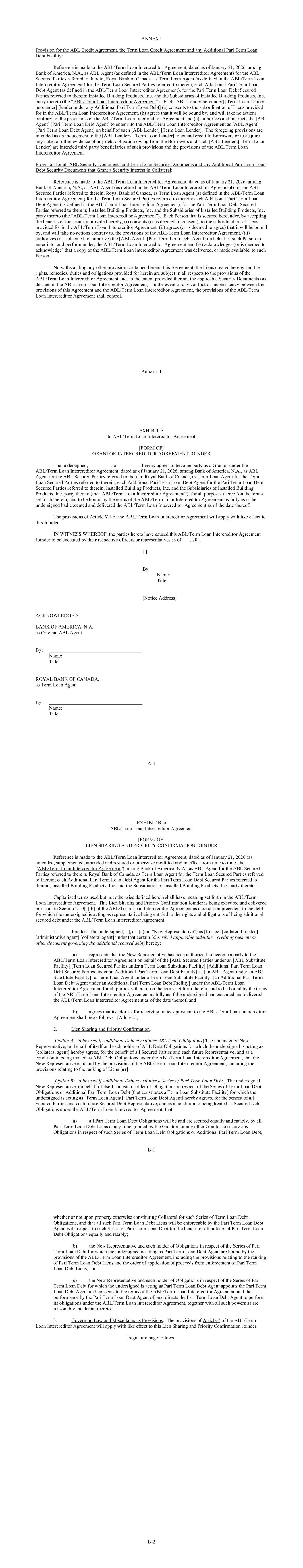 Annex I-1 ANNEX I Provision for the ABL Credit Agreement, the Term Loan Credit Agreement and any Additional Pari Term Loan Debt Facility: Reference is made to the ABL/Term Loan Intercreditor Agreement, dated as of January 21, 2026, among Bank of America, N.A., as ABL Agent (as defined in the ABL/Term Loan Intercreditor Agreement) for the ABL Secured Parties referred to therein; Royal Bank of Canada, as Term Loan Agent (as defined in the ABL/Term Loan Intercreditor Agreement) for the Term Loan Secured Parties referred to therein; each Additional Pari Term Loan Debt Agent (as defined in the ABL/Term Loan Intercreditor Agreement), for the Pari Term Loan Debt Secured Parties referred to therein; Installed Building Products, Inc. and the Subsidiaries of Installed Building Products, Inc. party thereto (the “ABL/Term Loan Intercreditor Agreement”). Each [ABL Lender hereunder] [Term Loan Lender hereunder] [lender under any Additional Pari Term Loan Debt] (a) consents to the subordination of Liens provided for in the ABL/Term Loan Intercreditor Agreement, (b) agrees that it will be bound by, and will take no actions contrary to, the provisions of the ABL/Term Loan Intercreditor Agreement and (c) authorizes and instructs the [ABL Agent] [Pari Term Loan Debt Agent] to enter into the ABL/Term Loan Intercreditor Agreement as [ABL Agent] [Pari Term Loan Debt Agent] on behalf of such [ABL Lender] [Term Loan Lender]. The foregoing provisions are intended as an inducement to the [ABL Lenders] [Term Loan Lender] to extend credit to Borrowers or to acquire any notes or other evidence of any debt obligation owing from the Borrowers and such [ABL Lenders] [Term Loan Lender] are intended third party beneficiaries of such provisions and the provisions of the ABL/Term Loan Intercreditor Agreement. Provision for all ABL Security Documents and Term Loan Security Documents and any Additional Pari Term Loan Debt Security Documents that Grant a Security Interest in Collateral: Reference is made to the ABL/Term Loan Intercreditor Agreement, dated as of January 21, 2026, among Bank of America, N.A., as ABL Agent (as defined in the ABL/Term Loan Intercreditor Agreement) for the ABL Secured Parties referred to therein; Royal Bank of Canada, as Term Loan Agent (as defined in the ABL/Term Loan Intercreditor Agreement) for the Term Loan Secured Parties referred to therein; each Additional Pari Term Loan Debt Agent (as defined in the ABL/Term Loan Intercreditor Agreement), for the Pari Term Loan Debt Secured Parties referred to therein; Installed Building Products, Inc. and the Subsidiaries of Installed Building Products, Inc. party thereto (the “ABL/Term Loan Intercreditor Agreement”). Each Person that is secured hereunder, by accepting the benefits of the security provided hereby, (i) consents (or is deemed to consent), to the subordination of Liens provided for in the ABL/Term Loan Intercreditor Agreement, (ii) agrees (or is deemed to agree) that it will be bound by, and will take no actions contrary to, the provisions of the ABL/Term Loan Intercreditor Agreement, (iii) authorizes (or is deemed to authorize) the [ABL Agent] [Pari Term Loan Debt Agent] on behalf of such Person to enter into, and perform under, the ABL/Term Loan Intercreditor Agreement and (iv) acknowledges (or is deemed to acknowledge) that a copy of the ABL/Term Loan Intercreditor Agreement was delivered, or made available, to such Person. Notwithstanding any other provision contained herein, this Agreement, the Liens created hereby and the rights, remedies, duties and obligations provided for herein are subject in all respects to the provisions of the ABL/Term Loan Intercreditor Agreement and, to the extent provided therein, the applicable Security Documents (as defined in the ABL/Term Loan Intercreditor Agreement). In the event of any conflict or inconsistency between the provisions of this Agreement and the ABL/Term Loan Intercreditor Agreement, the provisions of the ABL/Term Loan Intercreditor Agreement shall control. A-1 EXHIBIT A to ABL/Term Loan Intercreditor Agreement [FORM OF] GRANTOR INTERCREDITOR AGREEMENT JOINDER The undersigned, , a , hereby agrees to become party as a Grantor under the ABL/Term Loan Intercreditor Agreement, dated as of January 21, 2026, among Bank of America, N.A., as ABL Agent for the ABL Secured Parties referred to therein; Royal Bank of Canada, as Term Loan Agent for the Term Loan Secured Parties referred to therein; each Additional Pari Term Loan Debt Agent for the Pari Term Loan Debt Secured Parties referred to therein; Installed Building Products, Inc. and the Subsidiaries of Installed Building Products, Inc. party thereto (the “ABL/Term Loan Intercreditor Agreement”); for all purposes thereof on the terms set forth therein, and to be bound by the terms of the ABL/Term Loan Intercreditor Agreement as fully as if the undersigned had executed and delivered the ABL/Term Loan Intercreditor Agreement as of the date thereof. The provisions of Article VII of the ABL/Term Loan Intercreditor Agreement will apply with like effect to this Joinder. IN WITNESS WHEREOF, the parties hereto have caused this ABL/Term Loan Intercreditor Agreement Joinder to be executed by their respective officers or representatives as of , 20 . [ ] By: Name: Title: [Notice Address] ACKNOWLEDGED: BANK OF AMERICA, N.A., as Original ABL Agent By: Name: Title: ROYAL BANK OF CANADA, as Term Loan Agent By: Name: Title: B-1 EXHIBIT B to ABL/Term Loan Intercreditor Agreement [FORM- OF] LIEN SHARING AND PRIORITY CONFIRMATION JOINDER Reference is made to the ABL/Term Loan Intercreditor Agreement, dated as of January 21, 2026 (as amended, supplemented, amended and restated or otherwise modified and in effect from time to time, the “ABL/Term Loan Intercreditor Agreement”) among Bank of America, N.A., as ABL Agent for the ABL Secured Parties referred to therein; Royal Bank of Canada, as Term Loan Agent for the Term Loan Secured Parties referred to 