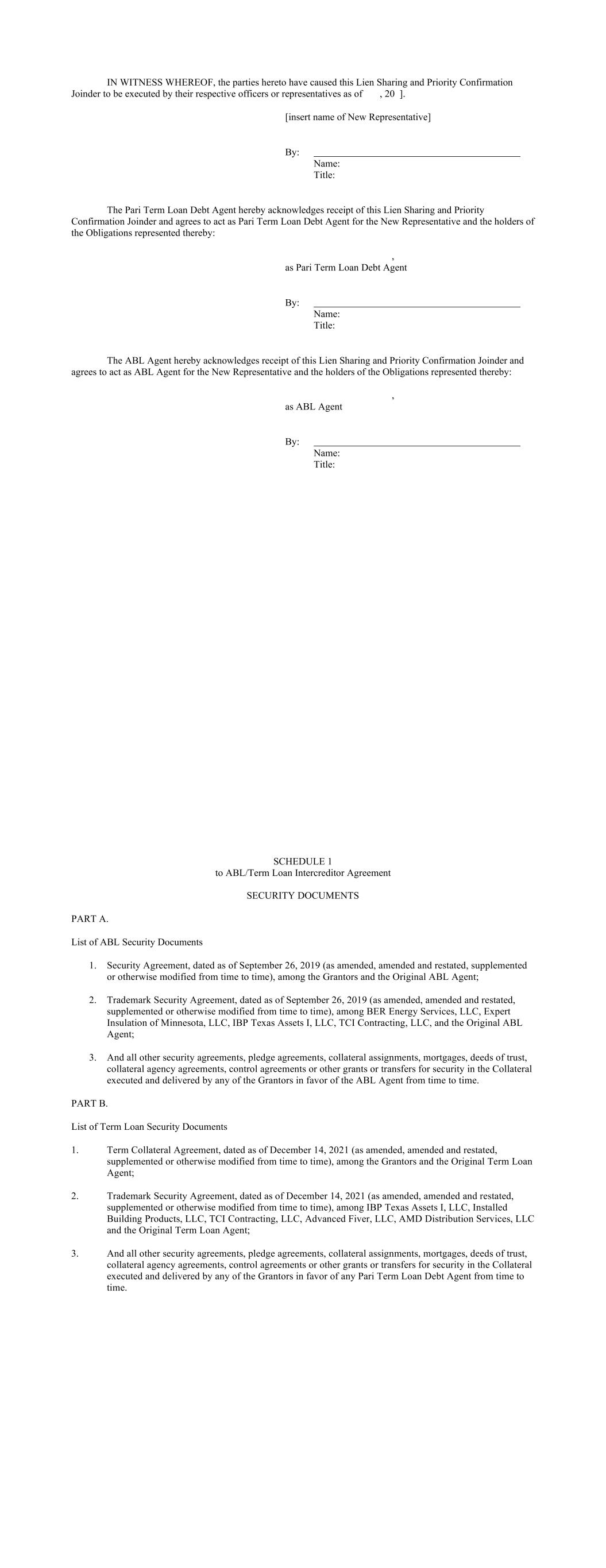 IN WITNESS WHEREOF, the parties hereto have caused this Lien Sharing and Priority Confirmation Joinder to be executed by their respective officers or representatives as of , 20 ]. [insert name of New Representative] By: Name: Title: The Pari Term Loan Debt Agent hereby acknowledges receipt of this Lien Sharing and Priority Confirmation Joinder and agrees to act as Pari Term Loan Debt Agent for the New Representative and the holders of the Obligations represented thereby: , as Pari Term Loan Debt Agent By: Name: Title: The ABL Agent hereby acknowledges receipt of this Lien Sharing and Priority Confirmation Joinder and agrees to act as ABL Agent for the New Representative and the holders of the Obligations represented thereby: , as ABL Agent By: Name: Title: SCHEDULE 1 to ABL/Term Loan Intercreditor Agreement SECURITY DOCUMENTS PART A. List of ABL Security Documents 1. Security Agreement, dated as of September 26, 2019 (as amended, amended and restated, supplemented or otherwise modified from time to time), among the Grantors and the Original ABL Agent; 2. Trademark Security Agreement, dated as of September 26, 2019 (as amended, amended and restated, supplemented or otherwise modified from time to time), among BER Energy Services, LLC, Expert Insulation of Minnesota, LLC, IBP Texas Assets I, LLC, TCI Contracting, LLC, and the Original ABL Agent; 3. And all other security agreements, pledge agreements, collateral assignments, mortgages, deeds of trust, collateral agency agreements, control agreements or other grants or transfers for security in the Collateral executed and delivered by any of the Grantors in favor of the ABL Agent from time to time. PART B. List of Term Loan Security Documents 1. Term Collateral Agreement, dated as of December 14, 2021 (as amended, amended and restated, supplemented or otherwise modified from time to time), among the Grantors and the Original Term Loan Agent; 2. Trademark Security Agreement, dated as of December 14, 2021 (as amended, amended and restated, supplemented or otherwise modified from time to time), among IBP Texas Assets I, LLC, Installed Building Products, LLC, TCI Contracting, LLC, Advanced Fiver, LLC, AMD Distribution Services, LLC and the Original Term Loan Agent; 3. And all other security agreements, pledge agreements, collateral assignments, mortgages, deeds of trust, collateral agency agreements, control agreements or other grants or transfers for security in the Collateral executed and delivered by any of the Grantors in favor of any Pari Term Loan Debt Agent from time to time.