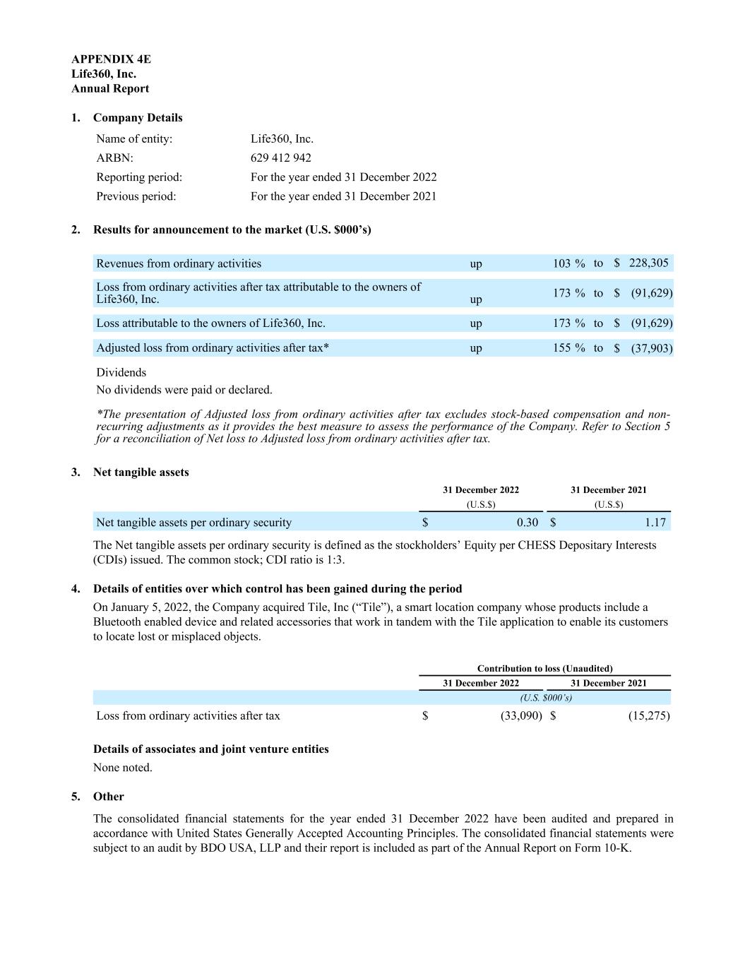 APPENDIX 4E Life360, Inc. Annual Report 1. Company Details Name of entity: Life360, Inc. ARBN: 629 412 942 Reporting period: For the year ended 31 December 2022 Previous period: For the year ended 31 December 2021 2. Results for announcement to the market (U.S. $000’s) Revenues from ordinary activities up 103 % to $ 228,305 Loss from ordinary activities after tax attributable to the owners of Life360, Inc. up 173 % to $ (91,629) Loss attributable to the owners of Life360, Inc. up 173 % to $ (91,629) Adjusted loss from ordinary activities after tax* up 155 % to $ (37,903) Dividends No dividends were paid or declared. *The presentation of Adjusted loss from ordinary activities after tax excludes stock-based compensation and non- recurring adjustments as it provides the best measure to assess the performance of the Company. Refer to Section 5 for a reconciliation of Net loss to Adjusted loss from ordinary activities after tax. 3. Net tangible assets 31 December 2022 31 December 2021 (U.S.$) (U.S.$) Net tangible assets per ordinary security $ 0.30 $ 1.17 The Net tangible assets per ordinary security is defined as the stockholders’ Equity per CHESS Depositary Interests (CDIs) issued. The common stock; CDI ratio is 1:3. 4. Details of entities over which control has been gained during the period On January 5, 2022, the Company acquired Tile, Inc (“Tile”), a smart location company whose products include a Bluetooth enabled device and related accessories that work in tandem with the Tile application to enable its customers to locate lost or misplaced objects. Contribution to loss (Unaudited) 31 December 2022 31 December 2021 (U.S. $000’s) Loss from ordinary activities after tax $ (33,090) $ (15,275) Details of associates and joint venture entities None noted. 5. Other The consolidated financial statements for the year ended 31 December 2022 have been audited and prepared in accordance with United States Generally Accepted Accounting Principles. The consolidated financial statements were subject to an audit by BDO USA, LLP and their report is included as part of the Annual Report on Form 10-K.