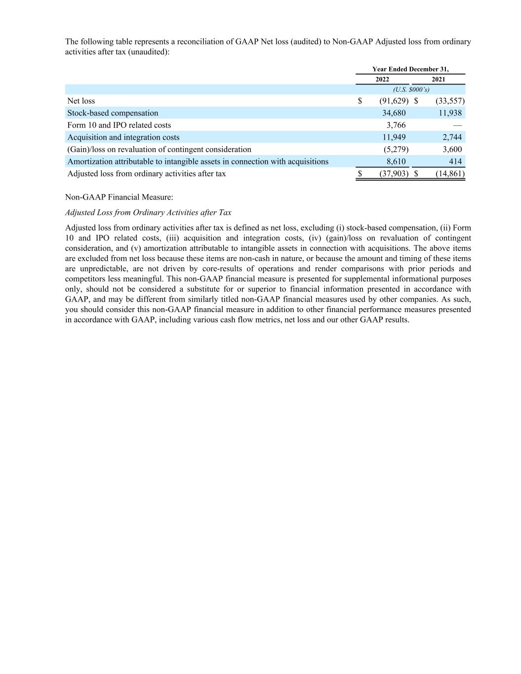 The following table represents a reconciliation of GAAP Net loss (audited) to Non-GAAP Adjusted loss from ordinary activities after tax (unaudited): Year Ended December 31, 2022 2021 (U.S. $000’s) Net loss $ (91,629) $ (33,557) Stock-based compensation 34,680 11,938 Form 10 and IPO related costs 3,766 — Acquisition and integration costs 11,949 2,744 (Gain)/loss on revaluation of contingent consideration (5,279) 3,600 Amortization attributable to intangible assets in connection with acquisitions 8,610 414 Adjusted loss from ordinary activities after tax $ (37,903) $ (14,861) Non-GAAP Financial Measure: Adjusted Loss from Ordinary Activities after Tax Adjusted loss from ordinary activities after tax is defined as net loss, excluding (i) stock-based compensation, (ii) Form 10 and IPO related costs, (iii) acquisition and integration costs, (iv) (gain)/loss on revaluation of contingent consideration, and (v) amortization attributable to intangible assets in connection with acquisitions. The above items are excluded from net loss because these items are non-cash in nature, or because the amount and timing of these items are unpredictable, are not driven by core-results of operations and render comparisons with prior periods and competitors less meaningful. This non-GAAP financial measure is presented for supplemental informational purposes only, should not be considered a substitute for or superior to financial information presented in accordance with GAAP, and may be different from similarly titled non-GAAP financial measures used by other companies. As such, you should consider this non-GAAP financial measure in addition to other financial performance measures presented in accordance with GAAP, including various cash flow metrics, net loss and our other GAAP results.