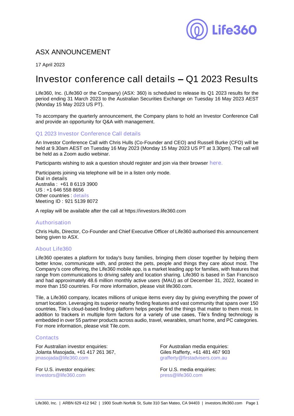 Life360, Inc. | ARBN 629 412 942 | 1900 South Norfolk St, Suite 310 San Mateo, CA 94403 | investors.life360.com Page 1 ASX ANNOUNCEMENT 17 April 2023 Investor conference call details – Q1 2023 Results Life360, Inc. (Life360 or the Company) (ASX: 360) is scheduled to release its Q1 2023 results for the period ending 31 March 2023 to the Australian Securities Exchange on Tuesday 16 May 2023 AEST (Monday 15 May 2023 US PT). To accompany the quarterly announcement, the Company plans to hold an Investor Conference Call and provide an opportunity for Q&A with management. Q1 2023 Investor Conference Call details An Investor Conference Call with Chris Hulls (Co-Founder and CEO) and Russell Burke (CFO) will be held at 9.30am AEST on Tuesday 16 May 2023 (Monday 15 May 2023 US PT at 3.30pm). The call will be held as a Zoom audio webinar. Participants wishing to ask a question should register and join via their browser here. Participants joining via telephone will be in a listen only mode. Dial in details Australia : +61 8 6119 3900 US : +1 646 558 8656 Other countries : details Meeting ID : 921 5139 8072 A replay will be available after the call at https://investors.life360.com Authorisation Chris Hulls, Director, Co-Founder and Chief Executive Officer of Life360 authorised this announcement being given to ASX. About Life360 Life360 operates a platform for today's busy families, bringing them closer together by helping them better know, communicate with, and protect the pets, people and things they care about most. The Company's core offering, the Life360 mobile app, is a market leading app for families, with features that range from communications to driving safety and location sharing. Life360 is based in San Francisco and had approximately 48.6 million monthly active users (MAU) as of December 31, 2022, located in more than 150 countries. For more information, please visit life360.com. Tile, a Life360 company, locates millions of unique items every day by giving everything the power of smart location. Leveraging its superior nearby finding features and vast community that spans over 150 countries, Tile’s cloud-based finding platform helps people find the things that matter to them most. In addition to trackers in multiple form factors for a variety of use cases, Tile’s finding technology is embedded in over 55 partner products across audio, travel, wearables, smart home, and PC categories. For more information, please visit Tile.com. Contacts For Australian investor enquiries: For Australian media enquiries: Jolanta Masojada, +61 417 261 367, Giles Rafferty, +61 481 467 903 jmasojada@life360.com grafferty@firstadvisers.com.au For U.S. investor enquiries: For U.S. media enquiries: investors@life360.com press@life360.com