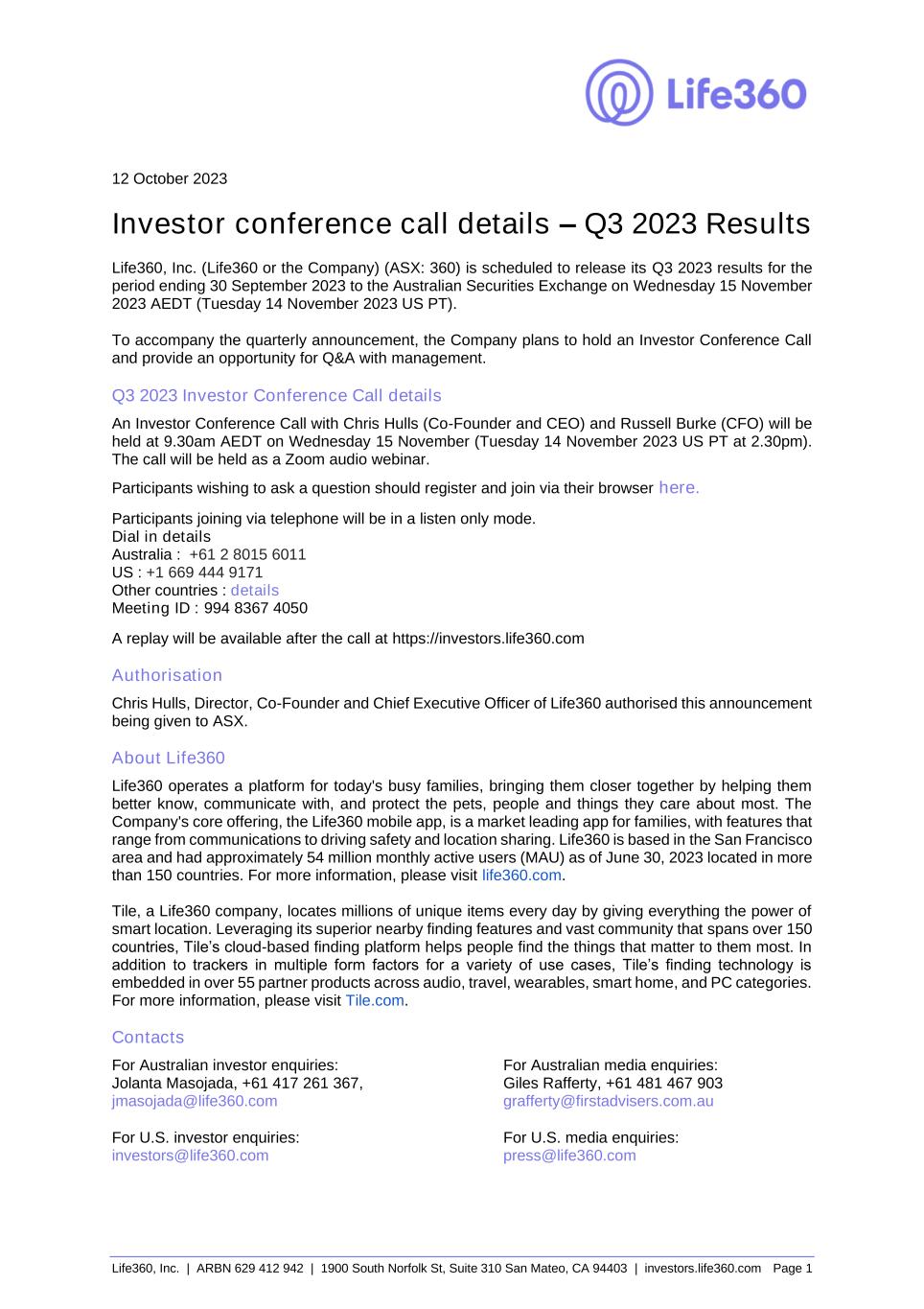 Life360, Inc. | ARBN 629 412 942 | 1900 South Norfolk St, Suite 310 San Mateo, CA 94403 | investors.life360.com Page 1 12 October 2023 Investor conference call details – Q3 2023 Results Life360, Inc. (Life360 or the Company) (ASX: 360) is scheduled to release its Q3 2023 results for the period ending 30 September 2023 to the Australian Securities Exchange on Wednesday 15 November 2023 AEDT (Tuesday 14 November 2023 US PT). To accompany the quarterly announcement, the Company plans to hold an Investor Conference Call and provide an opportunity for Q&A with management. Q3 2023 Investor Conference Call details An Investor Conference Call with Chris Hulls (Co-Founder and CEO) and Russell Burke (CFO) will be held at 9.30am AEDT on Wednesday 15 November (Tuesday 14 November 2023 US PT at 2.30pm). The call will be held as a Zoom audio webinar. Participants wishing to ask a question should register and join via their browser here. Participants joining via telephone will be in a listen only mode. Dial in details Australia : +61 2 8015 6011 US : +1 669 444 9171 Other countries : details Meeting ID : 994 8367 4050 A replay will be available after the call at https://investors.life360.com Authorisation Chris Hulls, Director, Co-Founder and Chief Executive Officer of Life360 authorised this announcement being given to ASX. About Life360 Life360 operates a platform for today's busy families, bringing them closer together by helping them better know, communicate with, and protect the pets, people and things they care about most. The Company's core offering, the Life360 mobile app, is a market leading app for families, with features that range from communications to driving safety and location sharing. Life360 is based in the San Francisco area and had approximately 54 million monthly active users (MAU) as of June 30, 2023 located in more than 150 countries. For more information, please visit life360.com. Tile, a Life360 company, locates millions of unique items every day by giving everything the power of smart location. Leveraging its superior nearby finding features and vast community that spans over 150 countries, Tile’s cloud-based finding platform helps people find the things that matter to them most. In addition to trackers in multiple form factors for a variety of use cases, Tile’s finding technology is embedded in over 55 partner products across audio, travel, wearables, smart home, and PC categories. For more information, please visit Tile.com. Contacts For Australian investor enquiries: For Australian media enquiries: Jolanta Masojada, +61 417 261 367, Giles Rafferty, +61 481 467 903 jmasojada@life360.com grafferty@firstadvisers.com.au For U.S. investor enquiries: For U.S. media enquiries: investors@life360.com press@life360.com