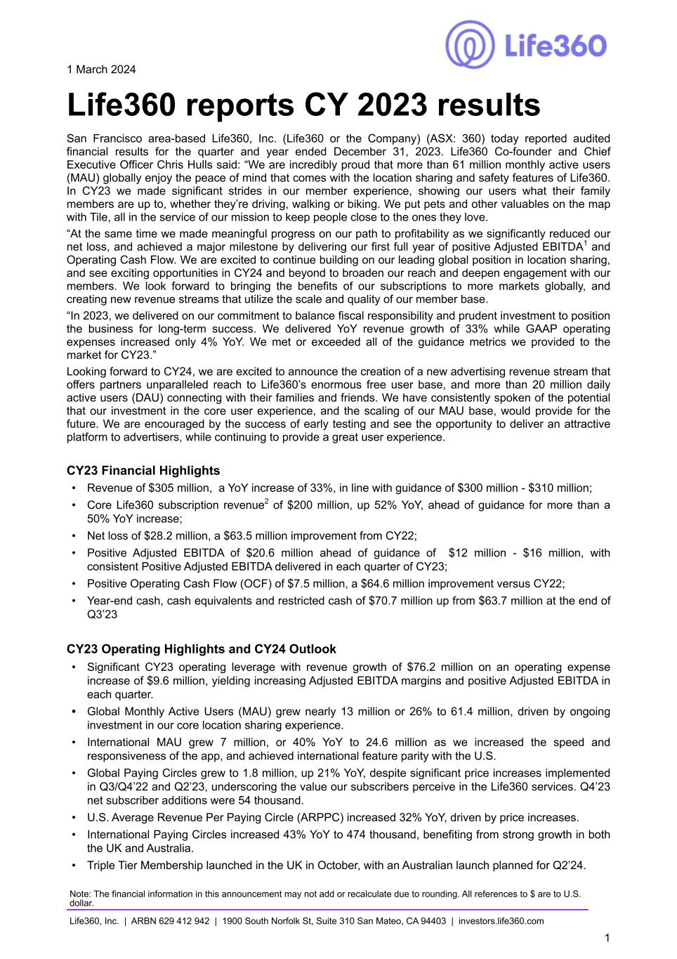 1 March 2024 Life360 reports CY 2023 results San Francisco area-based Life360, Inc. (Life360 or the Company) (ASX: 360) today reported audited financial results for the quarter and year ended December 31, 2023. Life360 Co-founder and Chief Executive Officer Chris Hulls said: “We are incredibly proud that more than 61 million monthly active users (MAU) globally enjoy the peace of mind that comes with the location sharing and safety features of Life360. In CY23 we made significant strides in our member experience, showing our users what their family members are up to, whether they’re driving, walking or biking. We put pets and other valuables on the map with Tile, all in the service of our mission to keep people close to the ones they love. “At the same time we made meaningful progress on our path to profitability as we significantly reduced our net loss, and achieved a major milestone by delivering our first full year of positive Adjusted EBITDA1 and Operating Cash Flow. We are excited to continue building on our leading global position in location sharing, and see exciting opportunities in CY24 and beyond to broaden our reach and deepen engagement with our members. We look forward to bringing the benefits of our subscriptions to more markets globally, and creating new revenue streams that utilize the scale and quality of our member base. “In 2023, we delivered on our commitment to balance fiscal responsibility and prudent investment to position the business for long-term success. We delivered YoY revenue growth of 33% while GAAP operating expenses increased only 4% YoY. We met or exceeded all of the guidance metrics we provided to the market for CY23.” Looking forward to CY24, we are excited to announce the creation of a new advertising revenue stream that offers partners unparalleled reach to Life360’s enormous free user base, and more than 20 million daily active users (DAU) connecting with their families and friends. We have consistently spoken of the potential that our investment in the core user experience, and the scaling of our MAU base, would provide for the future. We are encouraged by the success of early testing and see the opportunity to deliver an attractive platform to advertisers, while continuing to provide a great user experience. CY23 Financial Highlights • Revenue of $305 million, a YoY increase of 33%, in line with guidance of $300 million - $310 million; • Core Life360 subscription revenue2 of $200 million, up 52% YoY, ahead of guidance for more than a 50% YoY increase; • Net loss of $28.2 million, a $63.5 million improvement from CY22; • Positive Adjusted EBITDA of $20.6 million ahead of guidance of $12 million - $16 million, with consistent Positive Adjusted EBITDA delivered in each quarter of CY23; • Positive Operating Cash Flow (OCF) of $7.5 million, a $64.6 million improvement versus CY22; • Year-end cash, cash equivalents and restricted cash of $70.7 million up from $63.7 million at the end of Q3’23 CY23 Operating Highlights and CY24 Outlook • Significant CY23 operating leverage with revenue growth of $76.2 million on an operating expense increase of $9.6 million, yielding increasing Adjusted EBITDA margins and positive Adjusted EBITDA in each quarter. • Global Monthly Active Users (MAU) grew nearly 13 million or 26% to 61.4 million, driven by ongoing investment in our core location sharing experience. • International MAU grew 7 million, or 40% YoY to 24.6 million as we increased the speed and responsiveness of the app, and achieved international feature parity with the U.S. • Global Paying Circles grew to 1.8 million, up 21% YoY, despite significant price increases implemented in Q3/Q4’22 and Q2’23, underscoring the value our subscribers perceive in the Life360 services. Q4’23 net subscriber additions were 54 thousand. • U.S. Average Revenue Per Paying Circle (ARPPC) increased 32% YoY, driven by price increases. • International Paying Circles increased 43% YoY to 474 thousand, benefiting from strong growth in both the UK and Australia. • Triple Tier Membership launched in the UK in October, with an Australian launch planned for Q2’24. Note: The financial information in this announcement may not add or recalculate due to rounding. All references to $ are to U.S. dollar. Life360, Inc. | ARBN 629 412 942 | 1900 South Norfolk St, Suite 310 San Mateo, CA 94403 | investors.life360.com 1