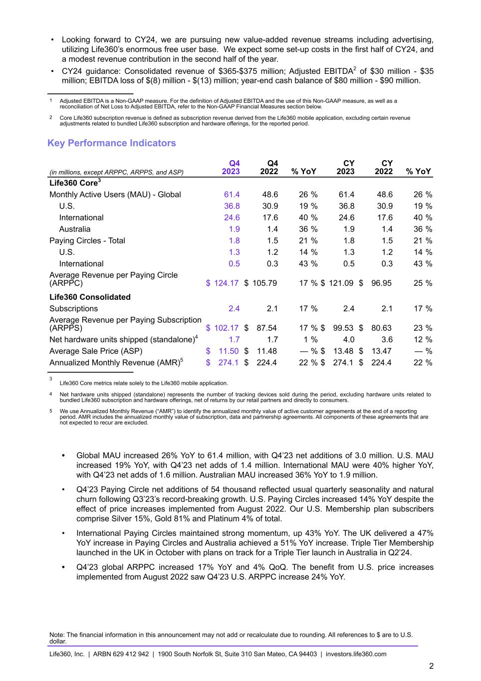 • Looking forward to CY24, we are pursuing new value-added revenue streams including advertising, utilizing Life360’s enormous free user base. We expect some set-up costs in the first half of CY24, and a modest revenue contribution in the second half of the year. • CY24 guidance: Consolidated revenue of $365-$375 million; Adjusted EBITDA2 of $30 million - $35 million; EBITDA loss of $(8) million - $(13) million; year-end cash balance of $80 million - $90 million. 1 Adjusted EBITDA is a Non-GAAP measure. For the definition of Adjusted EBITDA and the use of this Non-GAAP measure, as well as a reconciliation of Net Loss to Adjusted EBITDA, refer to the Non-GAAP Financial Measures section below. 2 Core Life360 subscription revenue is defined as subscription revenue derived from the Life360 mobile application, excluding certain revenue adjustments related to bundled Life360 subscription and hardware offerings, for the reported period. Key Performance Indicators (in millions, except ARPPC, ARPPS, and ASP) Q4 2023 Q4 2022 % YoY CY 2023 CY 2022 % YoY Life360 Core3 Monthly Active Users (MAU) - Global 61.4 48.6 26 % 61.4 48.6 26 % U.S. 36.8 30.9 19 % 36.8 30.9 19 % International 24.6 17.6 40 % 24.6 17.6 40 % Australia 1.9 1.4 36 % 1.9 1.4 36 % Paying Circles - Total 1.8 1.5 21 % 1.8 1.5 21 % U.S. 1.3 1.2 14 % 1.3 1.2 14 % International 0.5 0.3 43 % 0.5 0.3 43 % Average Revenue per Paying Circle (ARPPC) $ 124.17 $ 105.79 17 % $ 121.09 $ 96.95 25 % Life360 Consolidated Subscriptions 2.4 2.1 17 % 2.4 2.1 17 % Average Revenue per Paying Subscription (ARPPS) $ 102.17 $ 87.54 17 % $ 99.53 $ 80.63 23 % Net hardware units shipped (standalone)4 1.7 1.7 1 % 4.0 3.6 12 % Average Sale Price (ASP) $ 11.50 $ 11.48 — % $ 13.48 $ 13.47 — % Annualized Monthly Revenue (AMR)5 $ 274.1 $ 224.4 22 % $ 274.1 $ 224.4 22 % 3 Life360 Core metrics relate solely to the Life360 mobile application. 4 Net hardware units shipped (standalone) represents the number of tracking devices sold during the period, excluding hardware units related to bundled Life360 subscription and hardware offerings, net of returns by our retail partners and directly to consumers. 5 We use Annualized Monthly Revenue (“AMR”) to identify the annualized monthly value of active customer agreements at the end of a reporting period. AMR includes the annualized monthly value of subscription, data and partnership agreements. All components of these agreements that are not expected to recur are excluded. • Global MAU increased 26% YoY to 61.4 million, with Q4’23 net additions of 3.0 million. U.S. MAU increased 19% YoY, with Q4’23 net adds of 1.4 million. International MAU were 40% higher YoY, with Q4’23 net adds of 1.6 million. Australian MAU increased 36% YoY to 1.9 million. • Q4’23 Paying Circle net additions of 54 thousand reflected usual quarterly seasonality and natural churn following Q3’23’s record-breaking growth. U.S. Paying Circles increased 14% YoY despite the effect of price increases implemented from August 2022. Our U.S. Membership plan subscribers comprise Silver 15%, Gold 81% and Platinum 4% of total. • International Paying Circles maintained strong momentum, up 43% YoY. The UK delivered a 47% YoY increase in Paying Circles and Australia achieved a 51% YoY increase. Triple Tier Membership launched in the UK in October with plans on track for a Triple Tier launch in Australia in Q2’24. • Q4’23 global ARPPC increased 17% YoY and 4% QoQ. The benefit from U.S. price increases implemented from August 2022 saw Q4’23 U.S. ARPPC increase 24% YoY. Note: The financial information in this announcement may not add or recalculate due to rounding. All references to $ are to U.S. dollar. Life360, Inc. | ARBN 629 412 942 | 1900 South Norfolk St, Suite 310 San Mateo, CA 94403 | investors.life360.com 2