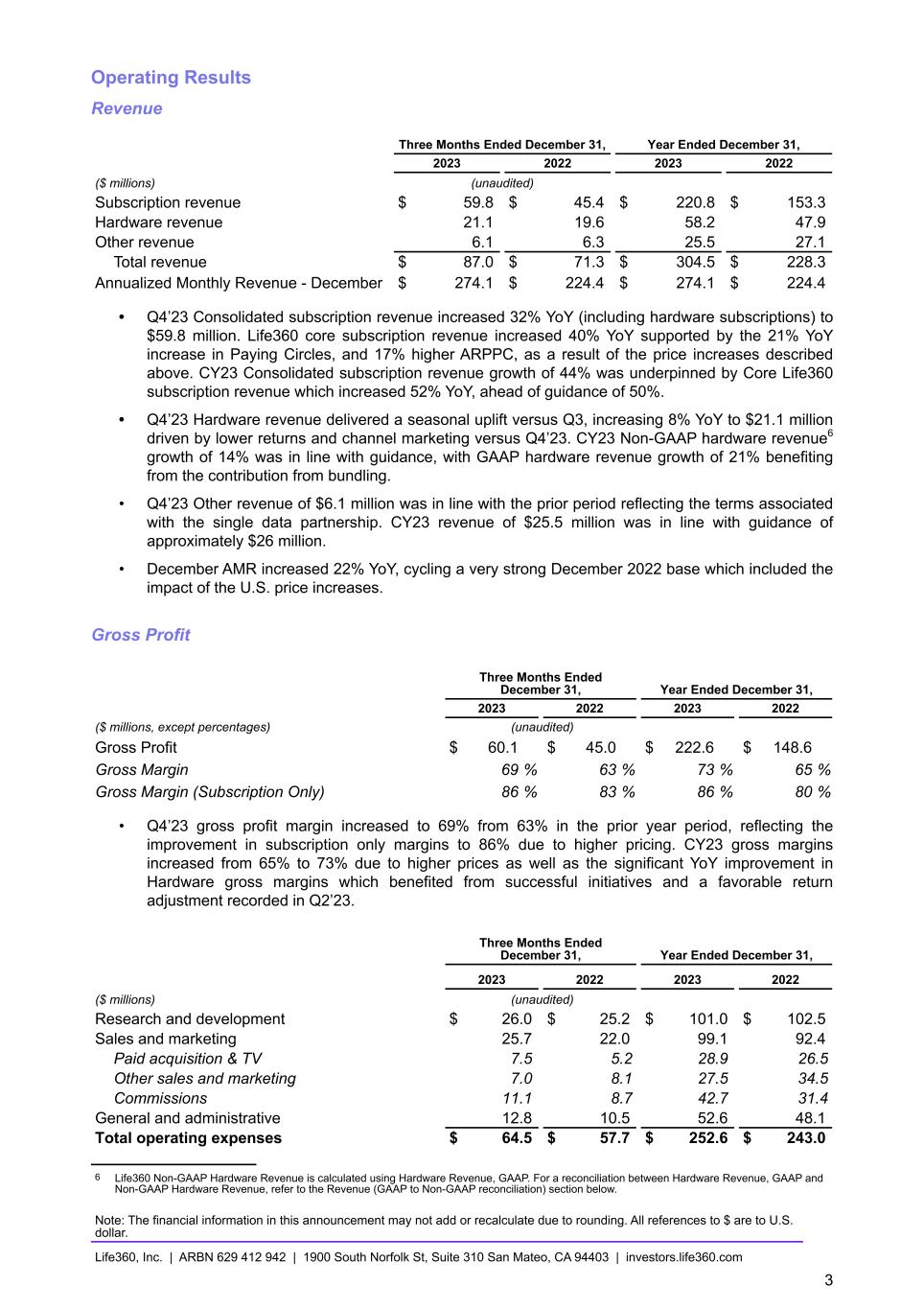 Operating Results Revenue Three Months Ended December 31, Year Ended December 31, 2023 2022 2023 2022 ($ millions) (unaudited) Subscription revenue $ 59.8 $ 45.4 $ 220.8 $ 153.3 Hardware revenue 21.1 19.6 58.2 47.9 Other revenue 6.1 6.3 25.5 27.1 Total revenue $ 87.0 $ 71.3 $ 304.5 $ 228.3 Annualized Monthly Revenue - December $ 274.1 $ 224.4 $ 274.1 $ 224.4 • Q4’23 Consolidated subscription revenue increased 32% YoY (including hardware subscriptions) to $59.8 million. Life360 core subscription revenue increased 40% YoY supported by the 21% YoY increase in Paying Circles, and 17% higher ARPPC, as a result of the price increases described above. CY23 Consolidated subscription revenue growth of 44% was underpinned by Core Life360 subscription revenue which increased 52% YoY, ahead of guidance of 50%. • Q4’23 Hardware revenue delivered a seasonal uplift versus Q3, increasing 8% YoY to $21.1 million driven by lower returns and channel marketing versus Q4’23. CY23 Non-GAAP hardware revenue6 growth of 14% was in line with guidance, with GAAP hardware revenue growth of 21% benefiting from the contribution from bundling. • Q4’23 Other revenue of $6.1 million was in line with the prior period reflecting the terms associated with the single data partnership. CY23 revenue of $25.5 million was in line with guidance of approximately $26 million. • December AMR increased 22% YoY, cycling a very strong December 2022 base which included the impact of the U.S. price increases. Gross Profit Three Months Ended December 31, Year Ended December 31, 2023 2022 2023 2022 ($ millions, except percentages) (unaudited) Gross Profit $ 60.1 $ 45.0 $ 222.6 $ 148.6 Gross Margin 69 % 63 % 73 % 65 % Gross Margin (Subscription Only) 86 % 83 % 86 % 80 % • Q4’23 gross profit margin increased to 69% from 63% in the prior year period, reflecting the improvement in subscription only margins to 86% due to higher pricing. CY23 gross margins increased from 65% to 73% due to higher prices as well as the significant YoY improvement in Hardware gross margins which benefited from successful initiatives and a favorable return adjustment recorded in Q2’23. Three Months Ended December 31, Year Ended December 31, 2023 2022 2023 2022 ($ millions) (unaudited) Research and development $ 26.0 $ 25.2 $ 101.0 $ 102.5 Sales and marketing 25.7 22.0 99.1 92.4 Paid acquisition & TV 7.5 5.2 28.9 26.5 Other sales and marketing 7.0 8.1 27.5 34.5 Commissions 11.1 8.7 42.7 31.4 General and administrative 12.8 10.5 52.6 48.1 Total operating expenses $ 64.5 $ 57.7 $ 252.6 $ 243.0 6 Life360 Non-GAAP Hardware Revenue is calculated using Hardware Revenue, GAAP. For a reconciliation between Hardware Revenue, GAAP and Non-GAAP Hardware Revenue, refer to the Revenue (GAAP to Non-GAAP reconciliation) section below. Note: The financial information in this announcement may not add or recalculate due to rounding. All references to $ are to U.S. dollar. Life360, Inc. | ARBN 629 412 942 | 1900 South Norfolk St, Suite 310 San Mateo, CA 94403 | investors.life360.com 3