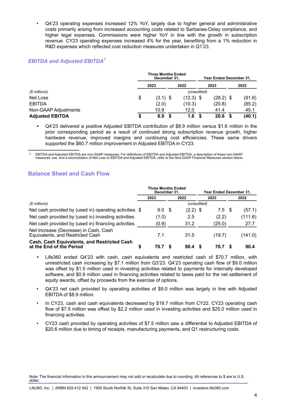• Q4’23 operating expenses increased 12% YoY, largely due to higher general and administrative costs primarily arising from increased accounting costs related to Sarbanes-Oxley compliance, and higher legal expenses. Commissions were higher YoY in line with the growth in subscription revenue. CY23 operating expenses increased 4% for the year, benefiting from a 1% reduction in R&D expenses which reflected cost reduction measures undertaken in Q1’23. EBITDA and Adjusted EBITDA7 Three Months Ended December 31, Year Ended December 31, 2023 2022 2023 2022 ($ millions) (unaudited) Net Loss $ (3.1) $ (12.3) $ (28.2) $ (91.6) EBITDA (2.0) (10.3) (20.8) (85.2) Non-GAAP Adjustments 10.9 12.0 41.4 45.1 Adjusted EBITDA $ 8.9 $ 1.6 $ 20.6 $ (40.1) • Q4’23 delivered a positive Adjusted EBITDA contribution of $8.9 million versus $1.6 million in the prior corresponding period as a result of continued strong subscription revenue growth, higher hardware revenue, improved margins and continuing cost efficiencies. These same drivers supported the $60.7 million improvement in Adjusted EBITDA in CY23. 7 EBITDA and Adjusted EBITDA are non-GAAP measures. For definitions of EBITDA and Adjusted EBITDA, a description of these non-GAAP measures’ use, and a reconciliation of Net Loss to EBITDA and Adjusted EBITDA, refer to the Non-GAAP Financial Measures section below. Balance Sheet and Cash Flow Three Months Ended December 31, Year Ended December 31, 2023 2022 2023 2022 ($ millions) (unaudited) Net cash provided by (used in) operating activities $ 9.0 $ (2.2) $ 7.5 $ (57.1) Net cash provided by (used in) investing activities (1.0) 2.5 (2.2) (111.6) Net cash provided by (used in) financing activities (0.9) 31.2 (25.0) 27.7 Net Increase (Decrease) in Cash, Cash Equivalents, and Restricted Cash 7.1 31.5 (19.7) (141.0) Cash, Cash Equivalents, and Restricted Cash at the End of the Period $ 70.7 $ 90.4 $ 70.7 $ 90.4 • Life360 ended Q4’23 with cash, cash equivalents and restricted cash of $70.7 million, with unrestricted cash increasing by $7.1 million from Q3’23. Q4’23 operating cash flow of $9.0 million was offset by $1.0 million used in investing activities related to payments for internally developed software, and $0.9 million used in financing activities related to taxes paid for the net settlement of equity awards, offset by proceeds from the exercise of options. • Q4’23 net cash provided by operating activities of $9.0 million was largely in line with Adjusted EBITDA of $8.9 million. • In CY23, cash and cash equivalents decreased by $19.7 million from CY22. CY23 operating cash flow of $7.5 million was offset by $2.2 million used in investing activities and $25.0 million used in financing activities. • CY23 cash provided by operating activities of $7.5 million saw a differential to Adjusted EBITDA of $20.6 million due to timing of receipts, manufacturing payments, and Q1 restructuring costs. Note: The financial information in this announcement may not add or recalculate due to rounding. All references to $ are to U.S. dollar. Life360, Inc. | ARBN 629 412 942 | 1900 South Norfolk St, Suite 310 San Mateo, CA 94403 | investors.life360.com 4