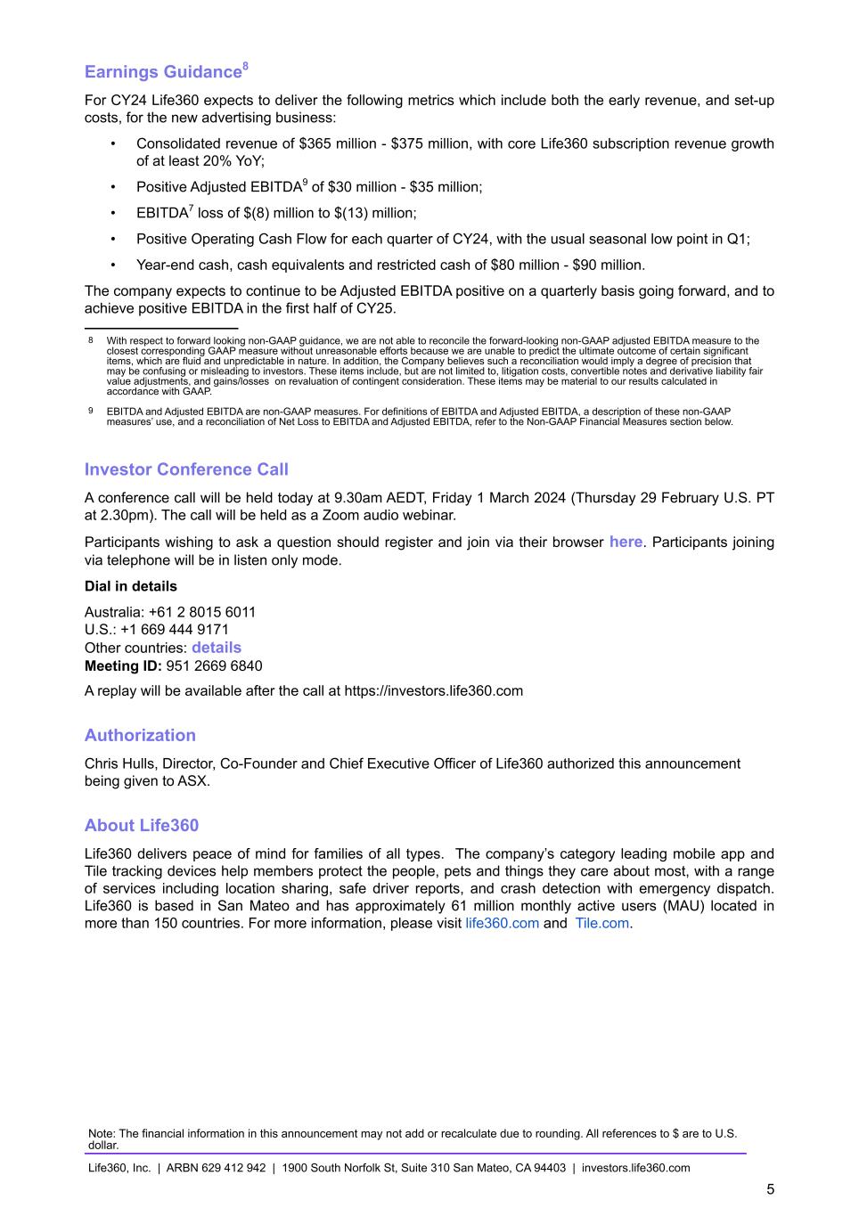 Earnings Guidance8 For CY24 Life360 expects to deliver the following metrics which include both the early revenue, and set-up costs, for the new advertising business: • Consolidated revenue of $365 million - $375 million, with core Life360 subscription revenue growth of at least 20% YoY; • Positive Adjusted EBITDA9 of $30 million - $35 million; • EBITDA7 loss of $(8) million to $(13) million; • Positive Operating Cash Flow for each quarter of CY24, with the usual seasonal low point in Q1; • Year-end cash, cash equivalents and restricted cash of $80 million - $90 million. The company expects to continue to be Adjusted EBITDA positive on a quarterly basis going forward, and to achieve positive EBITDA in the first half of CY25. 8 With respect to forward looking non-GAAP guidance, we are not able to reconcile the forward-looking non-GAAP adjusted EBITDA measure to the closest corresponding GAAP measure without unreasonable efforts because we are unable to predict the ultimate outcome of certain significant items, which are fluid and unpredictable in nature. In addition, the Company believes such a reconciliation would imply a degree of precision that may be confusing or misleading to investors. These items include, but are not limited to, litigation costs, convertible notes and derivative liability fair value adjustments, and gains/losses on revaluation of contingent consideration. These items may be material to our results calculated in accordance with GAAP. 9 EBITDA and Adjusted EBITDA are non-GAAP measures. For definitions of EBITDA and Adjusted EBITDA, a description of these non-GAAP measures’ use, and a reconciliation of Net Loss to EBITDA and Adjusted EBITDA, refer to the Non-GAAP Financial Measures section below. Investor Conference Call A conference call will be held today at 9.30am AEDT, Friday 1 March 2024 (Thursday 29 February U.S. PT at 2.30pm). The call will be held as a Zoom audio webinar. Participants wishing to ask a question should register and join via their browser here. Participants joining via telephone will be in listen only mode. Dial in details Australia: +61 2 8015 6011 U.S.: +1 669 444 9171 Other countries: details Meeting ID: 951 2669 6840 A replay will be available after the call at https://investors.life360.com Authorization Chris Hulls, Director, Co-Founder and Chief Executive Officer of Life360 authorized this announcement being given to ASX. About Life360 Life360 delivers peace of mind for families of all types. The company’s category leading mobile app and Tile tracking devices help members protect the people, pets and things they care about most, with a range of services including location sharing, safe driver reports, and crash detection with emergency dispatch. Life360 is based in San Mateo and has approximately 61 million monthly active users (MAU) located in more than 150 countries. For more information, please visit life360.com and Tile.com. Note: The financial information in this announcement may not add or recalculate due to rounding. All references to $ are to U.S. dollar. Life360, Inc. | ARBN 629 412 942 | 1900 South Norfolk St, Suite 310 San Mateo, CA 94403 | investors.life360.com 5