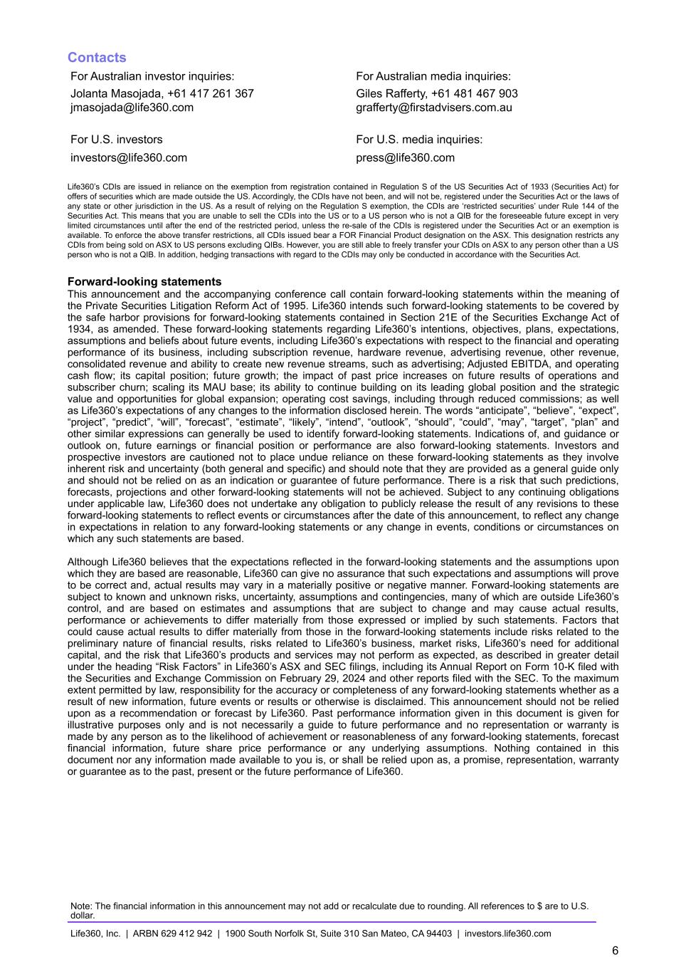 Contacts For Australian investor inquiries: For Australian media inquiries: Jolanta Masojada, +61 417 261 367 Giles Rafferty, +61 481 467 903 jmasojada@life360.com grafferty@firstadvisers.com.au For U.S. investors For U.S. media inquiries: investors@life360.com press@life360.com Life360’s CDIs are issued in reliance on the exemption from registration contained in Regulation S of the US Securities Act of 1933 (Securities Act) for offers of securities which are made outside the US. Accordingly, the CDIs have not been, and will not be, registered under the Securities Act or the laws of any state or other jurisdiction in the US. As a result of relying on the Regulation S exemption, the CDIs are ‘restricted securities’ under Rule 144 of the Securities Act. This means that you are unable to sell the CDIs into the US or to a US person who is not a QIB for the foreseeable future except in very limited circumstances until after the end of the restricted period, unless the re-sale of the CDIs is registered under the Securities Act or an exemption is available. To enforce the above transfer restrictions, all CDIs issued bear a FOR Financial Product designation on the ASX. This designation restricts any CDIs from being sold on ASX to US persons excluding QIBs. However, you are still able to freely transfer your CDIs on ASX to any person other than a US person who is not a QIB. In addition, hedging transactions with regard to the CDIs may only be conducted in accordance with the Securities Act. Forward-looking statements This announcement and the accompanying conference call contain forward-looking statements within the meaning of the Private Securities Litigation Reform Act of 1995. Life360 intends such forward-looking statements to be covered by the safe harbor provisions for forward-looking statements contained in Section 21E of the Securities Exchange Act of 1934, as amended. These forward-looking statements regarding Life360’s intentions, objectives, plans, expectations, assumptions and beliefs about future events, including Life360’s expectations with respect to the financial and operating performance of its business, including subscription revenue, hardware revenue, advertising revenue, other revenue, consolidated revenue and ability to create new revenue streams, such as advertising; Adjusted EBITDA, and operating cash flow; its capital position; future growth; the impact of past price increases on future results of operations and subscriber churn; scaling its MAU base; its ability to continue building on its leading global position and the strategic value and opportunities for global expansion; operating cost savings, including through reduced commissions; as well as Life360’s expectations of any changes to the information disclosed herein. The words “anticipate”, “believe”, “expect”, “project”, “predict”, “will”, “forecast”, “estimate”, “likely”, “intend”, “outlook”, “should”, “could”, “may”, “target”, “plan” and other similar expressions can generally be used to identify forward-looking statements. Indications of, and guidance or outlook on, future earnings or financial position or performance are also forward-looking statements. Investors and prospective investors are cautioned not to place undue reliance on these forward-looking statements as they involve inherent risk and uncertainty (both general and specific) and should note that they are provided as a general guide only and should not be relied on as an indication or guarantee of future performance. There is a risk that such predictions, forecasts, projections and other forward-looking statements will not be achieved. Subject to any continuing obligations under applicable law, Life360 does not undertake any obligation to publicly release the result of any revisions to these forward-looking statements to reflect events or circumstances after the date of this announcement, to reflect any change in expectations in relation to any forward-looking statements or any change in events, conditions or circumstances on which any such statements are based. Although Life360 believes that the expectations reflected in the forward-looking statements and the assumptions upon which they are based are reasonable, Life360 can give no assurance that such expectations and assumptions will prove to be correct and, actual results may vary in a materially positive or negative manner. Forward-looking statements are subject to known and unknown risks, uncertainty, assumptions and contingencies, many of which are outside Life360’s control, and are based on estimates and assumptions that are subject to change and may cause actual results, performance or achievements to differ materially from those expressed or implied by such statements. Factors that could cause actual results to differ materially from those in the forward-looking statements include risks related to the preliminary nature of financial results, risks related to Life360’s business, market risks, Life360’s need for additional capital, and the risk that Life360’s products and services may not perform as expected, as described in greater detail under the heading “Risk Factors” in Life360’s ASX and SEC filings, including its Annual Report on Form 10-K filed with the Securities and Exchange Commission on February 29, 2024 and other reports filed with the SEC. To the maximum extent permitted by law, responsibility for the accuracy or completeness of any forward-looking statements whether as a result of new information, future events or results or otherwise is disclaimed. This announcement should not be relied upon as a recommendation or forecast by Life360. Past performance information given in this document is given for illustrative purposes only and is not necessarily a guide to future performance and no representation or warranty is made by any person as to the likelihood of achievement or reasonableness of any
