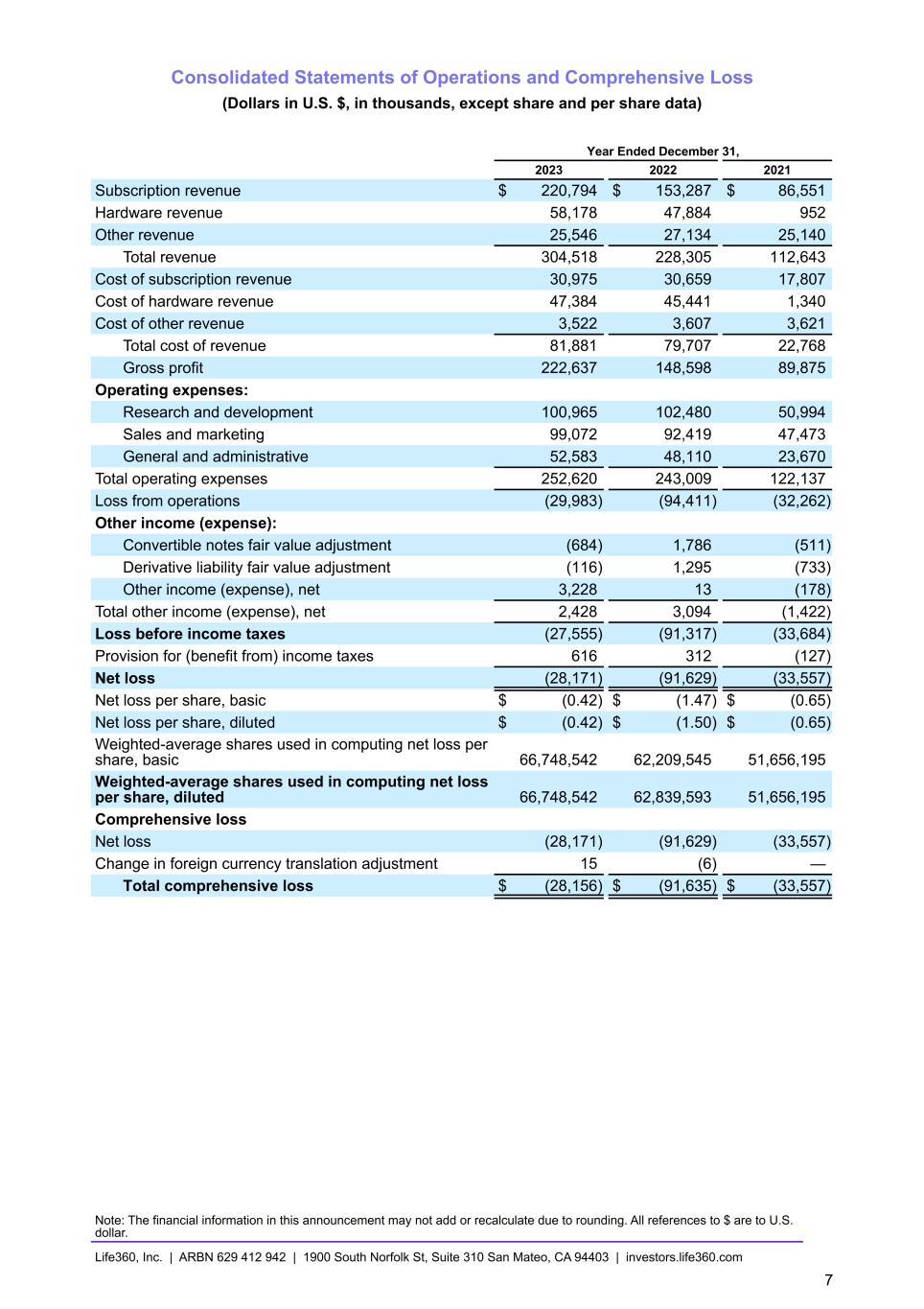 Consolidated Statements of Operations and Comprehensive Loss (Dollars in U.S. $, in thousands, except share and per share data) Year Ended December 31, 2023 2022 2021 Subscription revenue $ 220,794 $ 153,287 $ 86,551 Hardware revenue 58,178 47,884 952 Other revenue 25,546 27,134 25,140 Total revenue 304,518 228,305 112,643 Cost of subscription revenue 30,975 30,659 17,807 Cost of hardware revenue 47,384 45,441 1,340 Cost of other revenue 3,522 3,607 3,621 Total cost of revenue 81,881 79,707 22,768 Gross profit 222,637 148,598 89,875 Operating expenses: Research and development 100,965 102,480 50,994 Sales and marketing 99,072 92,419 47,473 General and administrative 52,583 48,110 23,670 Total operating expenses 252,620 243,009 122,137 Loss from operations (29,983) (94,411) (32,262) Other income (expense): Convertible notes fair value adjustment (684) 1,786 (511) Derivative liability fair value adjustment (116) 1,295 (733) Other income (expense), net 3,228 13 (178) Total other income (expense), net 2,428 3,094 (1,422) Loss before income taxes (27,555) (91,317) (33,684) Provision for (benefit from) income taxes 616 312 (127) Net loss (28,171) (91,629) (33,557) Net loss per share, basic $ (0.42) $ (1.47) $ (0.65) Net loss per share, diluted $ (0.42) $ (1.50) $ (0.65) Weighted-average shares used in computing net loss per share, basic 66,748,542 62,209,545 51,656,195 Weighted-average shares used in computing net loss per share, diluted 66,748,542 62,839,593 51,656,195 Comprehensive loss Net loss (28,171) (91,629) (33,557) Change in foreign currency translation adjustment 15 (6) — Total comprehensive loss $ (28,156) $ (91,635) $ (33,557) Note: The financial information in this announcement may not add or recalculate due to rounding. All references to $ are to U.S. dollar. Life360, Inc. | ARBN 629 412 942 | 1900 South Norfolk St, Suite 310 San Mateo, CA 94403 | investors.life360.com 7
