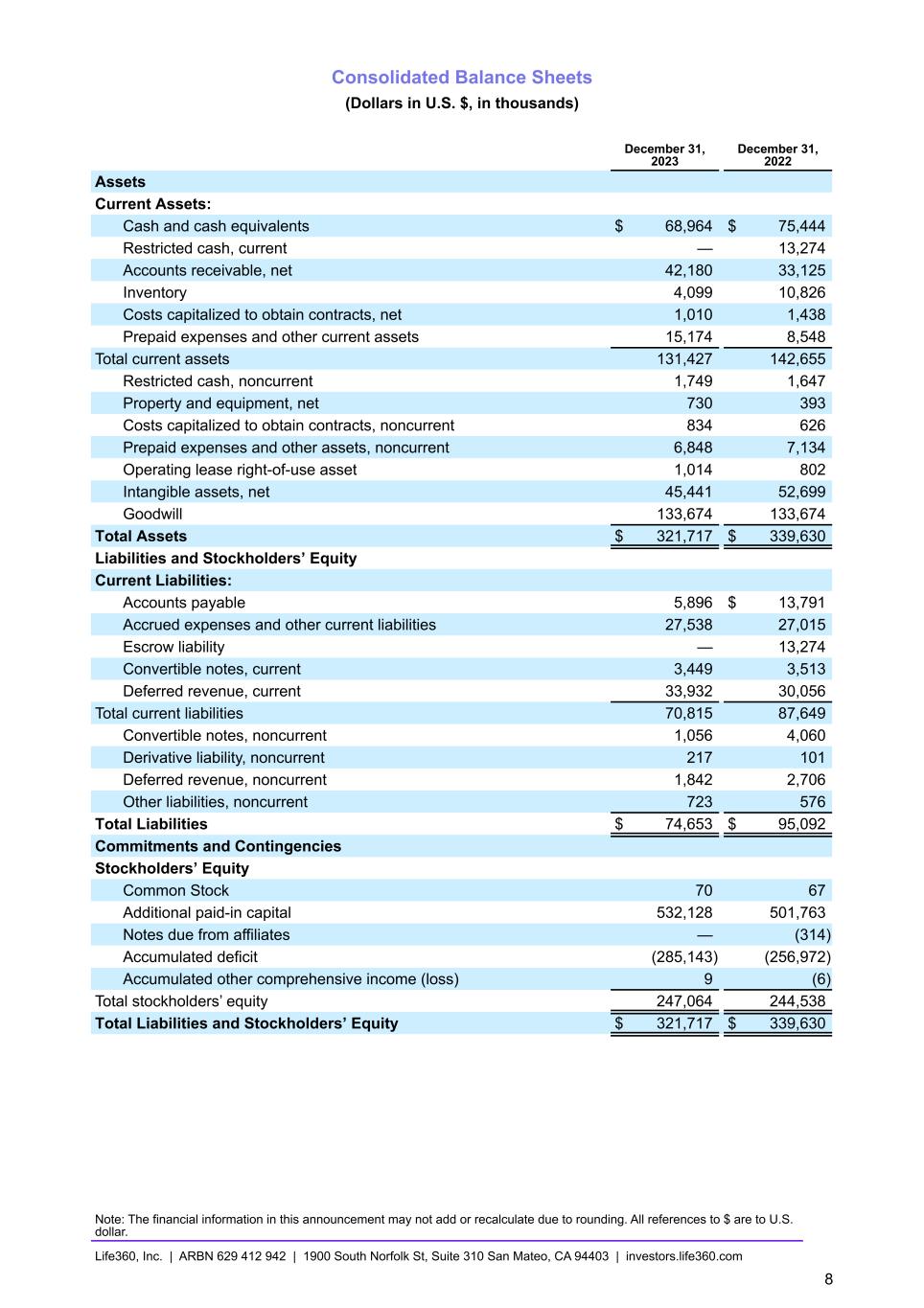 Consolidated Balance Sheets (Dollars in U.S. $, in thousands) December 31, 2023 December 31, 2022 Assets Current Assets: Cash and cash equivalents $ 68,964 $ 75,444 Restricted cash, current — 13,274 Accounts receivable, net 42,180 33,125 Inventory 4,099 10,826 Costs capitalized to obtain contracts, net 1,010 1,438 Prepaid expenses and other current assets 15,174 8,548 Total current assets 131,427 142,655 Restricted cash, noncurrent 1,749 1,647 Property and equipment, net 730 393 Costs capitalized to obtain contracts, noncurrent 834 626 Prepaid expenses and other assets, noncurrent 6,848 7,134 Operating lease right-of-use asset 1,014 802 Intangible assets, net 45,441 52,699 Goodwill 133,674 133,674 Total Assets $ 321,717 $ 339,630 Liabilities and Stockholders’ Equity Current Liabilities: Accounts payable 5,896 $ 13,791 Accrued expenses and other current liabilities 27,538 27,015 Escrow liability — 13,274 Convertible notes, current 3,449 3,513 Deferred revenue, current 33,932 30,056 Total current liabilities 70,815 87,649 Convertible notes, noncurrent 1,056 4,060 Derivative liability, noncurrent 217 101 Deferred revenue, noncurrent 1,842 2,706 Other liabilities, noncurrent 723 576 Total Liabilities $ 74,653 $ 95,092 Commitments and Contingencies Stockholders’ Equity Common Stock 70 67 Additional paid-in capital 532,128 501,763 Notes due from affiliates — (314) Accumulated deficit (285,143) (256,972) Accumulated other comprehensive income (loss) 9 (6) Total stockholders’ equity 247,064 244,538 Total Liabilities and Stockholders’ Equity $ 321,717 $ 339,630 Note: The financial information in this announcement may not add or recalculate due to rounding. All references to $ are to U.S. dollar. Life360, Inc. | ARBN 629 412 942 | 1900 South Norfolk St, Suite 310 San Mateo, CA 94403 | investors.life360.com 8