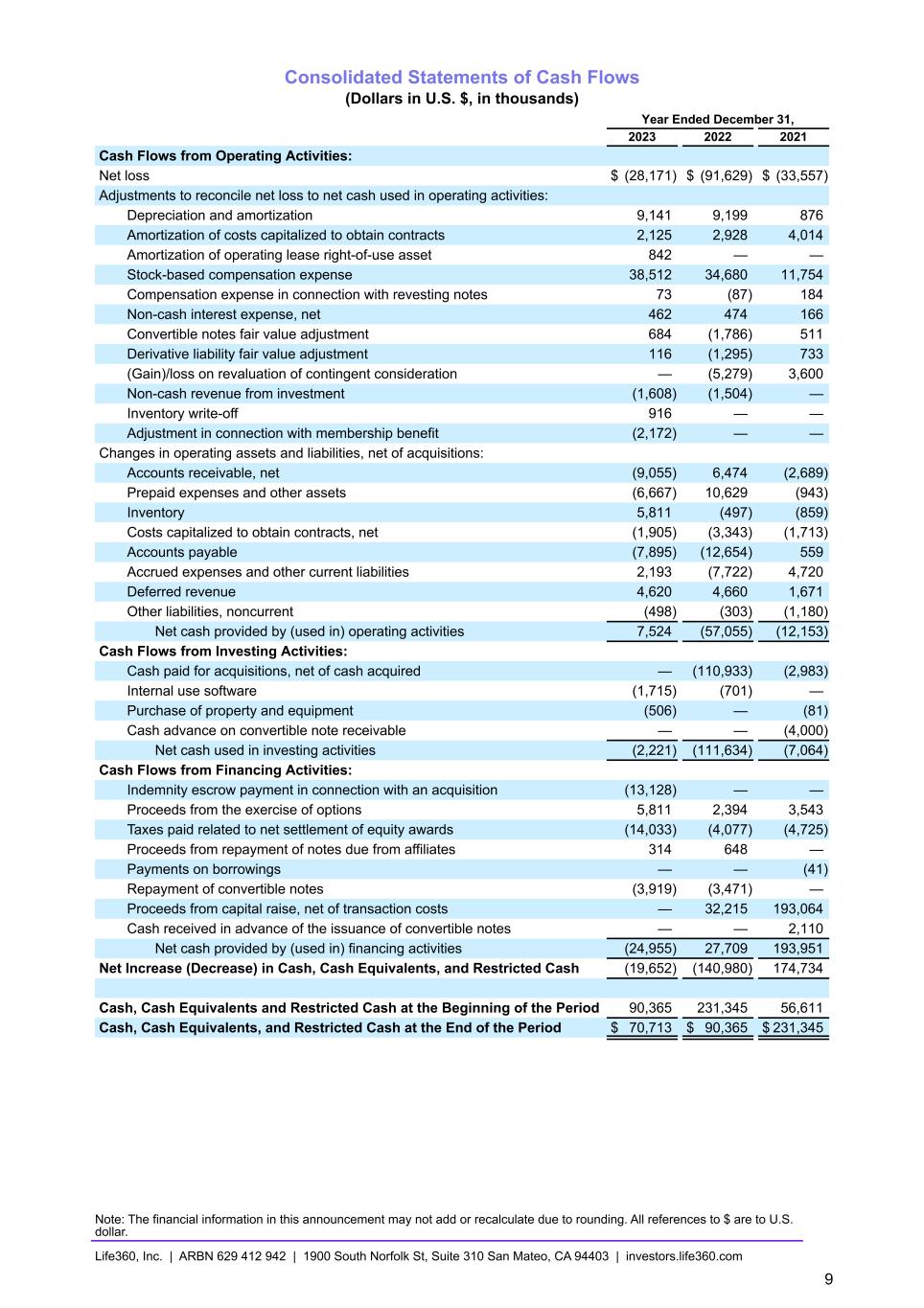 Consolidated Statements of Cash Flows (Dollars in U.S. $, in thousands) Year Ended December 31, 2023 2022 2021 Cash Flows from Operating Activities: Net loss $ (28,171) $ (91,629) $ (33,557) Adjustments to reconcile net loss to net cash used in operating activities: Depreciation and amortization 9,141 9,199 876 Amortization of costs capitalized to obtain contracts 2,125 2,928 4,014 Amortization of operating lease right-of-use asset 842 — — Stock-based compensation expense 38,512 34,680 11,754 Compensation expense in connection with revesting notes 73 (87) 184 Non-cash interest expense, net 462 474 166 Convertible notes fair value adjustment 684 (1,786) 511 Derivative liability fair value adjustment 116 (1,295) 733 (Gain)/loss on revaluation of contingent consideration — (5,279) 3,600 Non-cash revenue from investment (1,608) (1,504) — Inventory write-off 916 — — Adjustment in connection with membership benefit (2,172) — — Changes in operating assets and liabilities, net of acquisitions: Accounts receivable, net (9,055) 6,474 (2,689) Prepaid expenses and other assets (6,667) 10,629 (943) Inventory 5,811 (497) (859) Costs capitalized to obtain contracts, net (1,905) (3,343) (1,713) Accounts payable (7,895) (12,654) 559 Accrued expenses and other current liabilities 2,193 (7,722) 4,720 Deferred revenue 4,620 4,660 1,671 Other liabilities, noncurrent (498) (303) (1,180) Net cash provided by (used in) operating activities 7,524 (57,055) (12,153) Cash Flows from Investing Activities: Cash paid for acquisitions, net of cash acquired — (110,933) (2,983) Internal use software (1,715) (701) — Purchase of property and equipment (506) — (81) Cash advance on convertible note receivable — — (4,000) Net cash used in investing activities (2,221) (111,634) (7,064) Cash Flows from Financing Activities: Indemnity escrow payment in connection with an acquisition (13,128) — — Proceeds from the exercise of options 5,811 2,394 3,543 Taxes paid related to net settlement of equity awards (14,033) (4,077) (4,725) Proceeds from repayment of notes due from affiliates 314 648 — Payments on borrowings — — (41) Repayment of convertible notes (3,919) (3,471) — Proceeds from capital raise, net of transaction costs — 32,215 193,064 Cash received in advance of the issuance of convertible notes — — 2,110 Net cash provided by (used in) financing activities (24,955) 27,709 193,951 Net Increase (Decrease) in Cash, Cash Equivalents, and Restricted Cash (19,652) (140,980) 174,734 Cash, Cash Equivalents and Restricted Cash at the Beginning of the Period 90,365 231,345 56,611 Cash, Cash Equivalents, and Restricted Cash at the End of the Period $ 70,713 $ 90,365 $ 231,345 Note: The financial information in this announcement may not add or recalculate due to rounding. All references to $ are to U.S. dollar. Life360, Inc. | ARBN 629 412 942 | 1900 South Norfolk St, Suite 310 San Mateo, CA 94403 | investors.life360.com 9