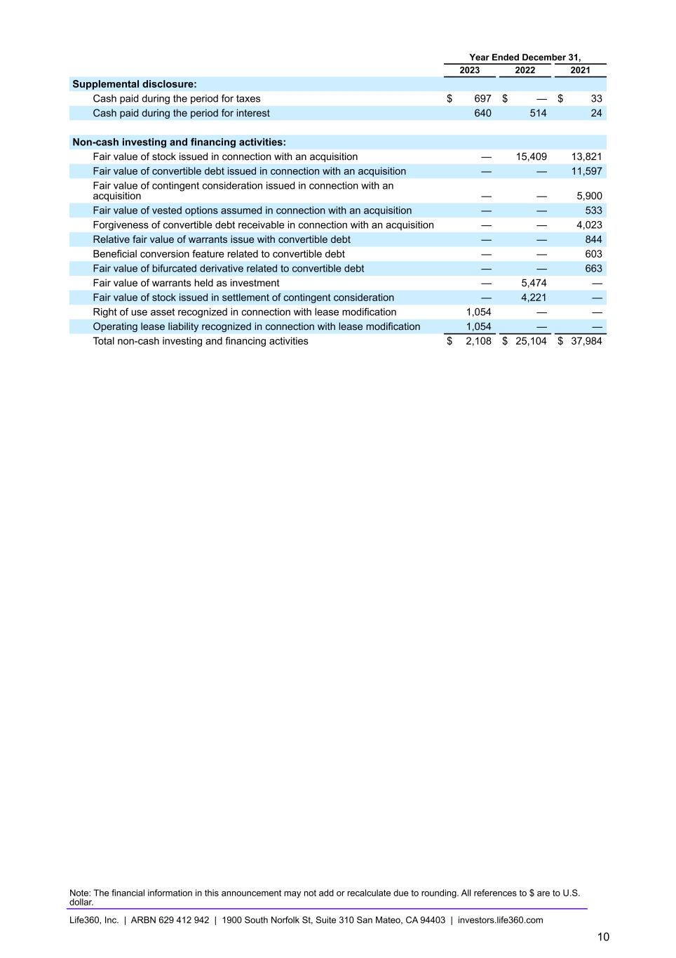 Year Ended December 31, 2023 2022 2021 Supplemental disclosure: Cash paid during the period for taxes $ 697 $ — $ 33 Cash paid during the period for interest 640 514 24 Non-cash investing and financing activities: Fair value of stock issued in connection with an acquisition — 15,409 13,821 Fair value of convertible debt issued in connection with an acquisition — — 11,597 Fair value of contingent consideration issued in connection with an acquisition — — 5,900 Fair value of vested options assumed in connection with an acquisition — — 533 Forgiveness of convertible debt receivable in connection with an acquisition — — 4,023 Relative fair value of warrants issue with convertible debt — — 844 Beneficial conversion feature related to convertible debt — — 603 Fair value of bifurcated derivative related to convertible debt — — 663 Fair value of warrants held as investment — 5,474 — Fair value of stock issued in settlement of contingent consideration — 4,221 — Right of use asset recognized in connection with lease modification 1,054 — — Operating lease liability recognized in connection with lease modification 1,054 — — Total non-cash investing and financing activities $ 2,108 $ 25,104 $ 37,984 Note: The financial information in this announcement may not add or recalculate due to rounding. All references to $ are to U.S. dollar. Life360, Inc. | ARBN 629 412 942 | 1900 South Norfolk St, Suite 310 San Mateo, CA 94403 | investors.life360.com 10