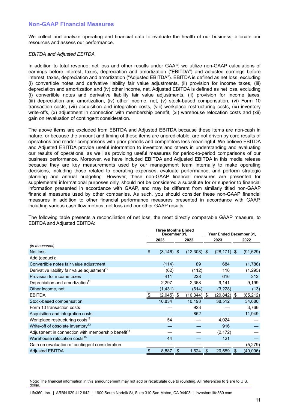 Non-GAAP Financial Measures We collect and analyze operating and financial data to evaluate the health of our business, allocate our resources and assess our performance. EBITDA and Adjusted EBITDA In addition to total revenue, net loss and other results under GAAP, we utilize non-GAAP calculations of earnings before interest, taxes, depreciation and amortization (“EBITDA”) and adjusted earnings before interest, taxes, depreciation and amortization (“Adjusted EBITDA”). EBITDA is defined as net loss, excluding (i) convertible notes and derivative liability fair value adjustments, (ii) provision for income taxes, (iii) depreciation and amortization and (iv) other income, net. Adjusted EBITDA is defined as net loss, excluding (i) convertible notes and derivative liability fair value adjustments, (ii) provision for income taxes, (iii) depreciation and amortization, (iv) other income, net, (v) stock-based compensation, (vi) Form 10 transaction costs, (vii) acquisition and integration costs, (viii) workplace restructuring costs, (ix) inventory write-offs, (x) adjustment in connection with membership benefit, (xi) warehouse relocation costs and (xii) gain on revaluation of contingent consideration. The above items are excluded from EBITDA and Adjusted EBITDA because these items are non-cash in nature, or because the amount and timing of these items are unpredictable, are not driven by core results of operations and render comparisons with prior periods and competitors less meaningful. We believe EBITDA and Adjusted EBITDA provide useful information to investors and others in understanding and evaluating our results of operations, as well as providing useful measures for period-to-period comparisons of our business performance. Moreover, we have included EBITDA and Adjusted EBITDA in this media release because they are key measurements used by our management team internally to make operating decisions, including those related to operating expenses, evaluate performance, and perform strategic planning and annual budgeting. However, these non-GAAP financial measures are presented for supplemental informational purposes only, should not be considered a substitute for or superior to financial information presented in accordance with GAAP, and may be different from similarly titled non-GAAP financial measures used by other companies. As such, you should consider these non-GAAP financial measures in addition to other financial performance measures presented in accordance with GAAP, including various cash flow metrics, net loss and our other GAAP results. The following table presents a reconciliation of net loss, the most directly comparable GAAP measure, to EBITDA and Adjusted EBITDA: Three Months Ended December 31, Year Ended December 31, 2023 2022 2023 2022 (in thousands) Net loss $ (3,146) $ (12,303) $ (28,171) $ (91,629) Add (deduct): Convertible notes fair value adjustment (114) 89 684 (1,786) Derivative liability fair value adjustment10 (62) (112) 116 (1,295) Provision for income taxes 411 228 616 312 Depreciation and amortization11 2,297 2,368 9,141 9,199 Other income, net (1,431) (614) (3,228) (13) EBITDA $ (2,045) $ (10,344) $ (20,842) $ (85,212) Stock-based compensation 10,834 10,193 38,512 34,680 Form 10 transaction costs — 923 — 3,766 Acquisition and integration costs — 852 — 11,949 Workplace restructuring costs12 54 — 4,024 — Write-off of obsolete inventory13 — — 916 — Adjustment in connection with membership benefit14 — — (2,172) — Warehouse relocation costs15 44 — 121 — Gain on revaluation of contingent consideration — — — (5,279) Adjusted EBITDA $ 8,887 $ 1,624 $ 20,559 $ (40,096) Note: The financial information in this announcement may not add or recalculate due to rounding. All references to $ are to U.S. dollar. Life360, Inc. | ARBN 629 412 942 | 1900 South Norfolk St, Suite 310 San Mateo, CA 94403 | investors.life360.com 11