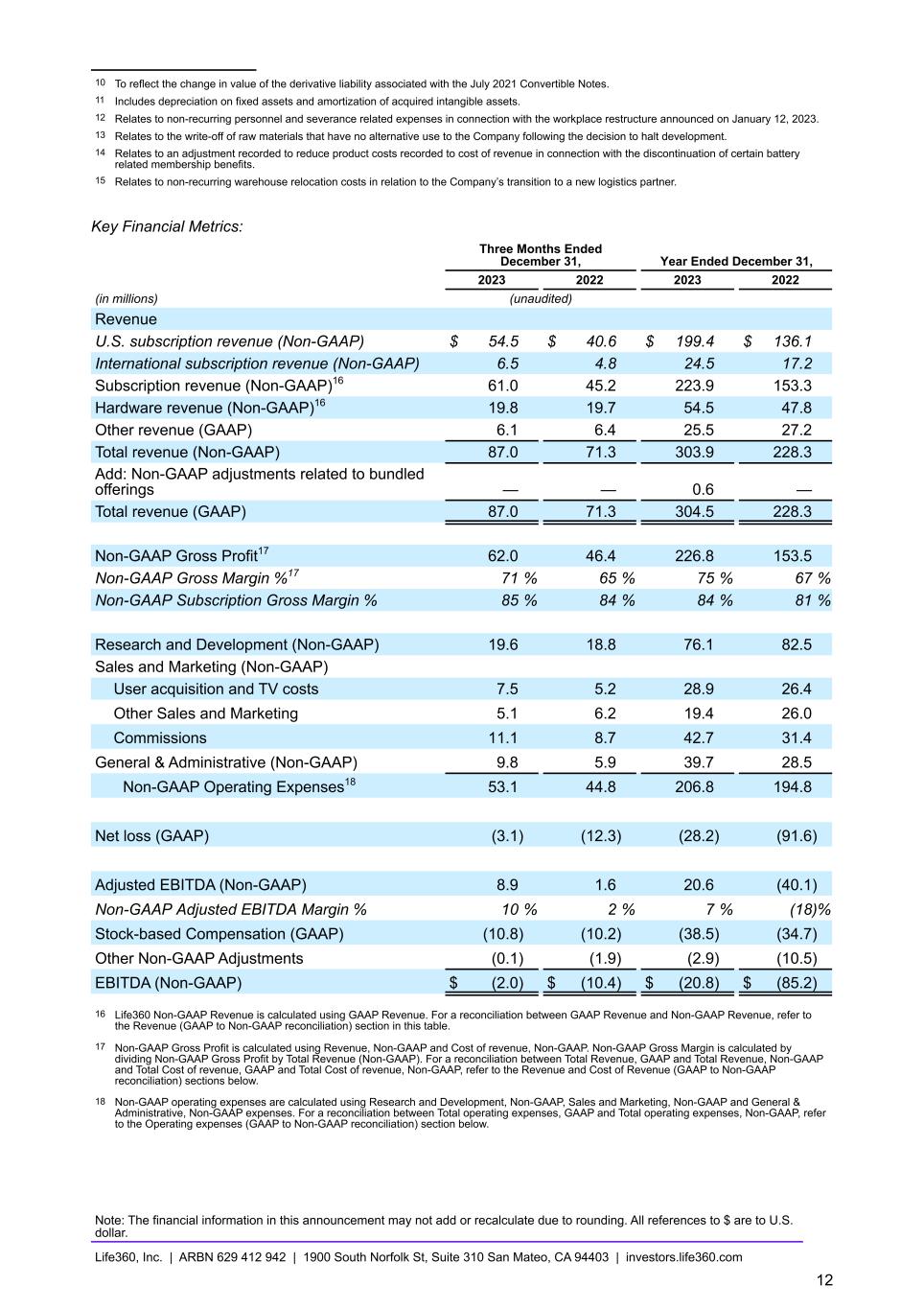 10 To reflect the change in value of the derivative liability associated with the July 2021 Convertible Notes. 11 Includes depreciation on fixed assets and amortization of acquired intangible assets. 12 Relates to non-recurring personnel and severance related expenses in connection with the workplace restructure announced on January 12, 2023. 13 Relates to the write-off of raw materials that have no alternative use to the Company following the decision to halt development. 14 Relates to an adjustment recorded to reduce product costs recorded to cost of revenue in connection with the discontinuation of certain battery related membership benefits. 15 Relates to non-recurring warehouse relocation costs in relation to the Company’s transition to a new logistics partner. Key Financial Metrics: Three Months Ended December 31, Year Ended December 31, 2023 2022 2023 2022 (in millions) (unaudited) Revenue U.S. subscription revenue (Non-GAAP) $ 54.5 $ 40.6 $ 199.4 $ 136.1 International subscription revenue (Non-GAAP) 6.5 4.8 24.5 17.2 Subscription revenue (Non-GAAP)16 61.0 45.2 223.9 153.3 Hardware revenue (Non-GAAP)16 19.8 19.7 54.5 47.8 Other revenue (GAAP) 6.1 6.4 25.5 27.2 Total revenue (Non-GAAP) 87.0 71.3 303.9 228.3 Add: Non-GAAP adjustments related to bundled offerings — — 0.6 — Total revenue (GAAP) 87.0 71.3 304.5 228.3 Non-GAAP Gross Profit17 62.0 46.4 226.8 153.5 Non-GAAP Gross Margin %17 71 % 65 % 75 % 67 % Non-GAAP Subscription Gross Margin % 85 % 84 % 84 % 81 % Research and Development (Non-GAAP) 19.6 18.8 76.1 82.5 Sales and Marketing (Non-GAAP) User acquisition and TV costs 7.5 5.2 28.9 26.4 Other Sales and Marketing 5.1 6.2 19.4 26.0 Commissions 11.1 8.7 42.7 31.4 General & Administrative (Non-GAAP) 9.8 5.9 39.7 28.5 Non-GAAP Operating Expenses18 53.1 44.8 206.8 194.8 Net loss (GAAP) (3.1) (12.3) (28.2) (91.6) Adjusted EBITDA (Non-GAAP) 8.9 1.6 20.6 (40.1) Non-GAAP Adjusted EBITDA Margin % 10 % 2 % 7 % (18) % Stock-based Compensation (GAAP) (10.8) (10.2) (38.5) (34.7) Other Non-GAAP Adjustments (0.1) (1.9) (2.9) (10.5) EBITDA (Non-GAAP) $ (2.0) $ (10.4) $ (20.8) $ (85.2) 16 Life360 Non-GAAP Revenue is calculated using GAAP Revenue. For a reconciliation between GAAP Revenue and Non-GAAP Revenue, refer to the Revenue (GAAP to Non-GAAP reconciliation) section in this table. 17 Non-GAAP Gross Profit is calculated using Revenue, Non-GAAP and Cost of revenue, Non-GAAP. Non-GAAP Gross Margin is calculated by dividing Non-GAAP Gross Profit by Total Revenue (Non-GAAP). For a reconciliation between Total Revenue, GAAP and Total Revenue, Non-GAAP and Total Cost of revenue, GAAP and Total Cost of revenue, Non-GAAP, refer to the Revenue and Cost of Revenue (GAAP to Non-GAAP reconciliation) sections below. 18 Non-GAAP operating expenses are calculated using Research and Development, Non-GAAP, Sales and Marketing, Non-GAAP and General & Administrative, Non-GAAP expenses. For a reconciliation between Total operating expenses, GAAP and Total operating expenses, Non-GAAP, refer to the Operating expenses (GAAP to Non-GAAP reconciliation) section below. Note: The financial information in this announcement may not add or recalculate due to rounding. All references to $ are to U.S. dollar. Life360, Inc. | ARBN 629 412 942 | 1900 South Norfolk St, Suite 310 San Mateo, CA 94403 | investors.life360.com 12