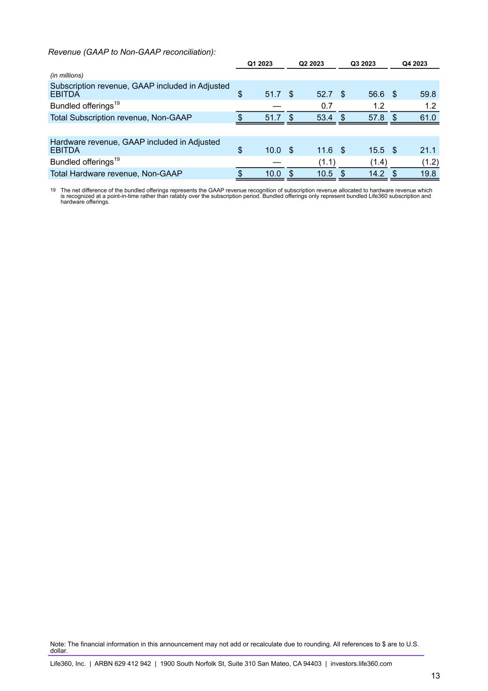 Revenue (GAAP to Non-GAAP reconciliation): Q1 2023 Q2 2023 Q3 2023 Q4 2023 (in millions) Subscription revenue, GAAP included in Adjusted EBITDA $ 51.7 $ 52.7 $ 56.6 $ 59.8 Bundled offerings19 — 0.7 1.2 1.2 Total Subscription revenue, Non-GAAP $ 51.7 $ 53.4 $ 57.8 $ 61.0 Hardware revenue, GAAP included in Adjusted EBITDA $ 10.0 $ 11.6 $ 15.5 $ 21.1 Bundled offerings19 — (1.1) (1.4) (1.2) Total Hardware revenue, Non-GAAP $ 10.0 $ 10.5 $ 14.2 $ 19.8 19 The net difference of the bundled offerings represents the GAAP revenue recognition of subscription revenue allocated to hardware revenue which is recognized at a point-in-time rather than ratably over the subscription period. Bundled offerings only represent bundled Life360 subscription and hardware offerings. Note: The financial information in this announcement may not add or recalculate due to rounding. All references to $ are to U.S. dollar. Life360, Inc. | ARBN 629 412 942 | 1900 South Norfolk St, Suite 310 San Mateo, CA 94403 | investors.life360.com 13