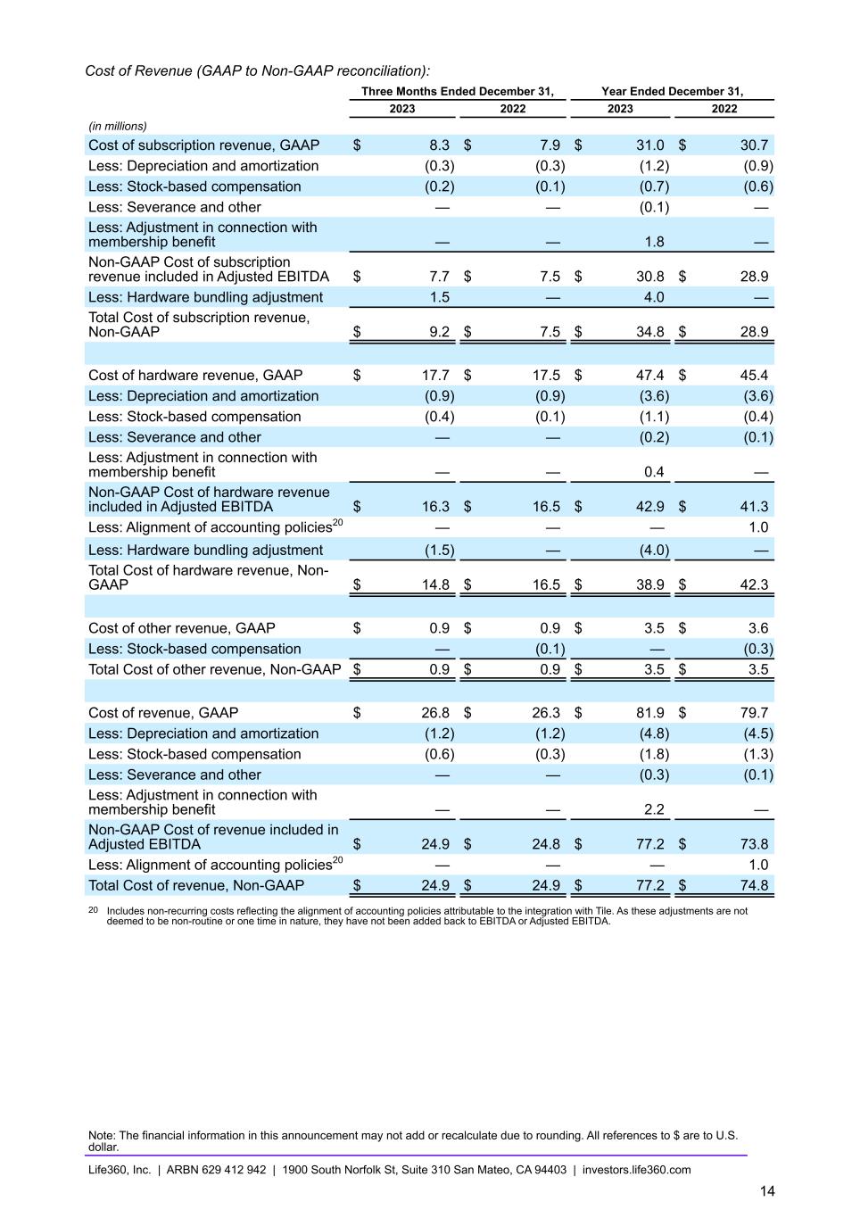 Cost of Revenue (GAAP to Non-GAAP reconciliation): Three Months Ended December 31, Year Ended December 31, 2023 2022 2023 2022 (in millions) Cost of subscription revenue, GAAP $ 8.3 $ 7.9 $ 31.0 $ 30.7 Less: Depreciation and amortization (0.3) (0.3) (1.2) (0.9) Less: Stock-based compensation (0.2) (0.1) (0.7) (0.6) Less: Severance and other — — (0.1) — Less: Adjustment in connection with membership benefit — — 1.8 — Non-GAAP Cost of subscription revenue included in Adjusted EBITDA $ 7.7 $ 7.5 $ 30.8 $ 28.9 Less: Hardware bundling adjustment 1.5 — 4.0 — Total Cost of subscription revenue, Non-GAAP $ 9.2 $ 7.5 $ 34.8 $ 28.9 Cost of hardware revenue, GAAP $ 17.7 $ 17.5 $ 47.4 $ 45.4 Less: Depreciation and amortization (0.9) (0.9) (3.6) (3.6) Less: Stock-based compensation (0.4) (0.1) (1.1) (0.4) Less: Severance and other — — (0.2) (0.1) Less: Adjustment in connection with membership benefit — — 0.4 — Non-GAAP Cost of hardware revenue included in Adjusted EBITDA $ 16.3 $ 16.5 $ 42.9 $ 41.3 Less: Alignment of accounting policies20 — — — 1.0 Less: Hardware bundling adjustment (1.5) — (4.0) — Total Cost of hardware revenue, Non- GAAP $ 14.8 $ 16.5 $ 38.9 $ 42.3 Cost of other revenue, GAAP $ 0.9 $ 0.9 $ 3.5 $ 3.6 Less: Stock-based compensation — (0.1) — (0.3) Total Cost of other revenue, Non-GAAP $ 0.9 $ 0.9 $ 3.5 $ 3.5 Cost of revenue, GAAP $ 26.8 $ 26.3 $ 81.9 $ 79.7 Less: Depreciation and amortization (1.2) (1.2) (4.8) (4.5) Less: Stock-based compensation (0.6) (0.3) (1.8) (1.3) Less: Severance and other — — (0.3) (0.1) Less: Adjustment in connection with membership benefit — — 2.2 — Non-GAAP Cost of revenue included in Adjusted EBITDA $ 24.9 $ 24.8 $ 77.2 $ 73.8 Less: Alignment of accounting policies20 — — — 1.0 Total Cost of revenue, Non-GAAP $ 24.9 $ 24.9 $ 77.2 $ 74.8 20 Includes non-recurring costs reflecting the alignment of accounting policies attributable to the integration with Tile. As these adjustments are not deemed to be non-routine or one time in nature, they have not been added back to EBITDA or Adjusted EBITDA. Note: The financial information in this announcement may not add or recalculate due to rounding. All references to $ are to U.S. dollar. Life360, Inc. | ARBN 629 412 942 | 1900 South Norfolk St, Suite 310 San Mateo, CA 94403 | investors.life360.com 14