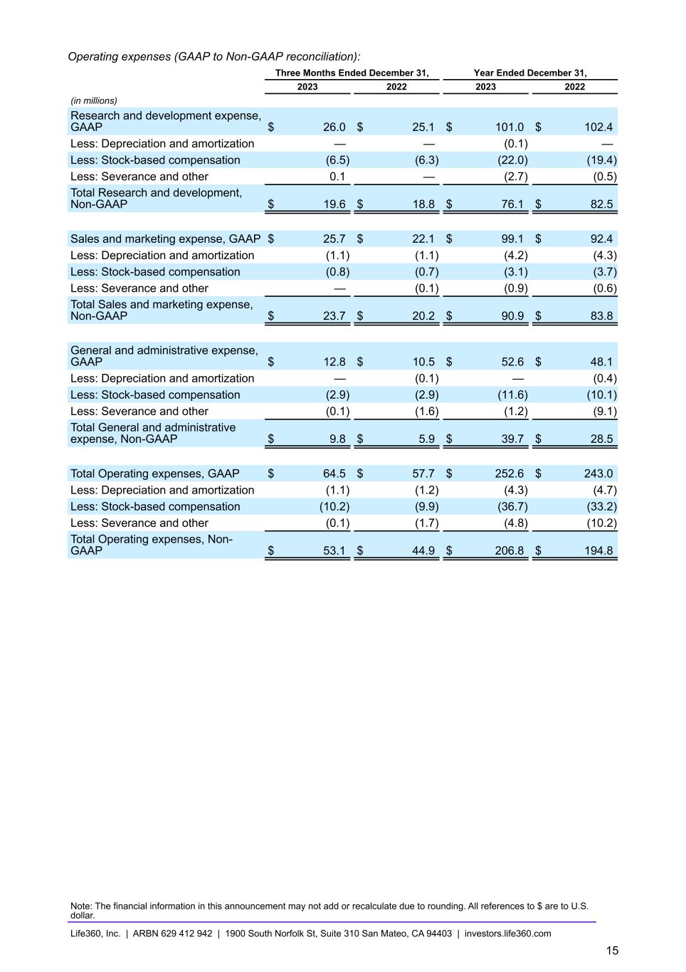 Operating expenses (GAAP to Non-GAAP reconciliation): Three Months Ended December 31, Year Ended December 31, 2023 2022 2023 2022 (in millions) Research and development expense, GAAP $ 26.0 $ 25.1 $ 101.0 $ 102.4 Less: Depreciation and amortization — — (0.1) — Less: Stock-based compensation (6.5) (6.3) (22.0) (19.4) Less: Severance and other 0.1 — (2.7) (0.5) Total Research and development, Non-GAAP $ 19.6 $ 18.8 $ 76.1 $ 82.5 Sales and marketing expense, GAAP $ 25.7 $ 22.1 $ 99.1 $ 92.4 Less: Depreciation and amortization (1.1) (1.1) (4.2) (4.3) Less: Stock-based compensation (0.8) (0.7) (3.1) (3.7) Less: Severance and other — (0.1) (0.9) (0.6) Total Sales and marketing expense, Non-GAAP $ 23.7 $ 20.2 $ 90.9 $ 83.8 General and administrative expense, GAAP $ 12.8 $ 10.5 $ 52.6 $ 48.1 Less: Depreciation and amortization — (0.1) — (0.4) Less: Stock-based compensation (2.9) (2.9) (11.6) (10.1) Less: Severance and other (0.1) (1.6) (1.2) (9.1) Total General and administrative expense, Non-GAAP $ 9.8 $ 5.9 $ 39.7 $ 28.5 Total Operating expenses, GAAP $ 64.5 $ 57.7 $ 252.6 $ 243.0 Less: Depreciation and amortization (1.1) (1.2) (4.3) (4.7) Less: Stock-based compensation (10.2) (9.9) (36.7) (33.2) Less: Severance and other (0.1) (1.7) (4.8) (10.2) Total Operating expenses, Non- GAAP $ 53.1 $ 44.9 $ 206.8 $ 194.8 Note: The financial information in this announcement may not add or recalculate due to rounding. All references to $ are to U.S. dollar. Life360, Inc. | ARBN 629 412 942 | 1900 South Norfolk St, Suite 310 San Mateo, CA 94403 | investors.life360.com 15