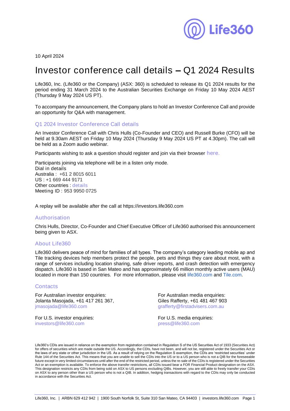 Life360, Inc. | ARBN 629 412 942 | 1900 South Norfolk St, Suite 310 San Mateo, CA 94403 | investors.life360.com Page 1 10 April 2024 Investor conference call details – Q1 2024 Results Life360, Inc. (Life360 or the Company) (ASX: 360) is scheduled to release its Q1 2024 results for the period ending 31 March 2024 to the Australian Securities Exchange on Friday 10 May 2024 AEST (Thursday 9 May 2024 US PT). To accompany the announcement, the Company plans to hold an Investor Conference Call and provide an opportunity for Q&A with management. Q1 2024 Investor Conference Call details An Investor Conference Call with Chris Hulls (Co-Founder and CEO) and Russell Burke (CFO) will be held at 9.30am AEST on Friday 10 May 2024 (Thursday 9 May 2024 US PT at 4.30pm). The call will be held as a Zoom audio webinar. Participants wishing to ask a question should register and join via their browser here. Participants joining via telephone will be in a listen only mode. Dial in details Australia : +61 2 8015 6011 US : +1 669 444 9171 Other countries : details Meeting ID : 953 9950 0725 A replay will be available after the call at https://investors.life360.com Authorisation Chris Hulls, Director, Co-Founder and Chief Executive Officer of Life360 authorised this announcement being given to ASX. About Life360 Life360 delivers peace of mind for families of all types. The company’s category leading mobile ap and Tile tracking devices help members protect the people, pets and things they care about most, with a range of services including location sharing, safe driver reports, and crash detection with emergency dispatch. Life360 is based in San Mateo and has approximately 66 million monthly active users (MAU) located in more than 150 countries. For more information, please visit life360.com and Tile.com. Contacts For Australian investor enquiries: For Australian media enquiries: Jolanta Masojada, +61 417 261 367, Giles Rafferty, +61 481 467 903 jmasojada@life360.com grafferty@firstadvisers.com.au For U.S. investor enquiries: For U.S. media enquiries: investors@life360.com press@life360.com Life360’s CDIs are issued in reliance on the exemption from registration contained in Regulation S of the US Securities Act of 1933 (Securities Act) for offers of securities which are made outside the US. Accordingly, the CDIs, have not been, and will not be, registered under the Securities Act or the laws of any state or other jurisdiction in the US. As a result of relying on the Regulation S exemption, the CDIs are ‘restricted securities’ under Rule 144 of the Securities Act. This means that you are unable to sell the CDIs into the US or to a US person who is not a QIB for the foreseeable future except in very limited circumstances until after the end of the restricted period, unless the re-sale of the CDIs is registered under the Securities Act or an exemption is available. To enforce the above transfer restrictions, all CDIs issued bear a FOR Financial Product designation on the ASX. This designation restricts any CDIs from being sold on ASX to US persons excluding QIBs. However, you are still able to freely transfer your CDIs on ASX to any person other than a US person who is not a QIB. In addition, hedging transactions with regard to the CDIs may only be conducted in accordance with the Securities Act.
