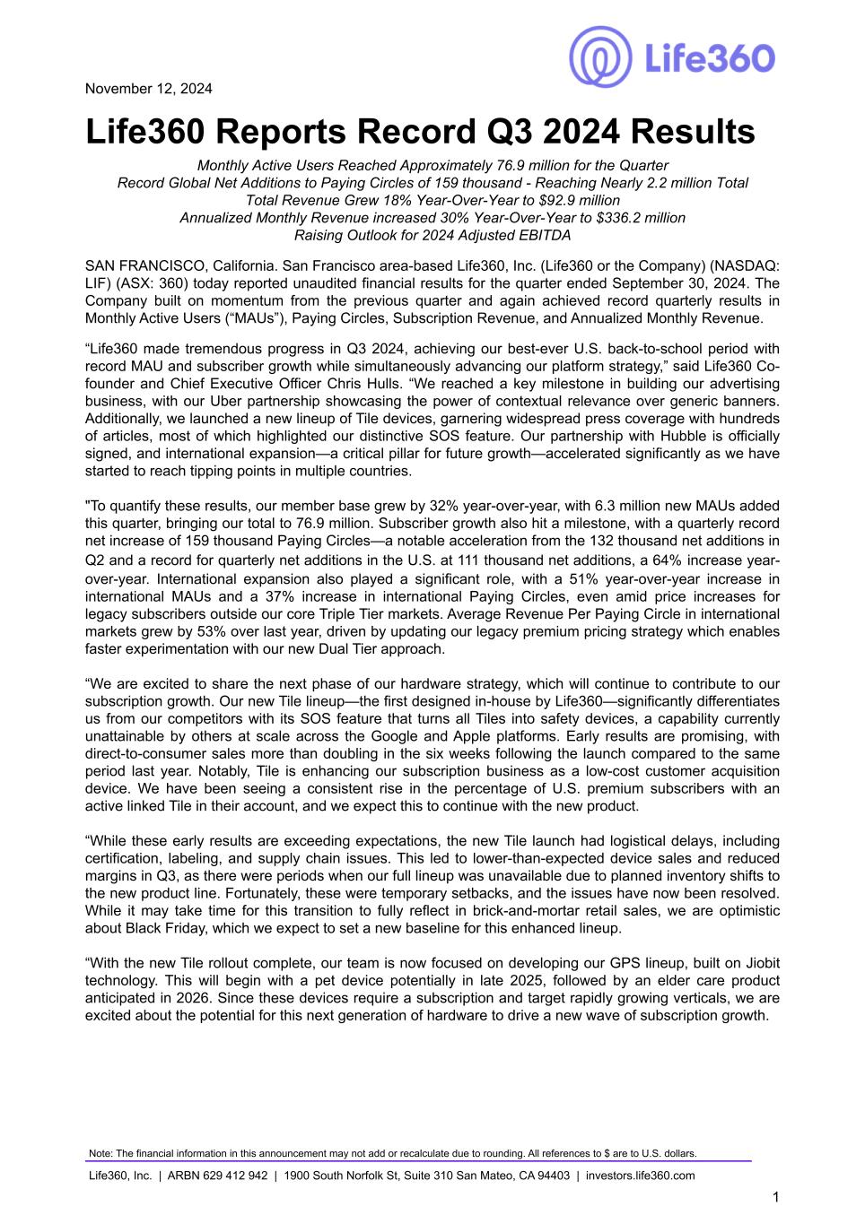 November 12, 2024 Life360 Reports Record Q3 2024 Results Monthly Active Users Reached Approximately 76.9 million for the Quarter Record Global Net Additions to Paying Circles of 159 thousand - Reaching Nearly 2.2 million Total Total Revenue Grew 18% Year-Over-Year to $92.9 million Annualized Monthly Revenue increased 30% Year-Over-Year to $336.2 million Raising Outlook for 2024 Adjusted EBITDA SAN FRANCISCO, California. San Francisco area-based Life360, Inc. (Life360 or the Company) (NASDAQ: LIF) (ASX: 360) today reported unaudited financial results for the quarter ended September 30, 2024. The Company built on momentum from the previous quarter and again achieved record quarterly results in Monthly Active Users (“MAUs”), Paying Circles, Subscription Revenue, and Annualized Monthly Revenue. “Life360 made tremendous progress in Q3 2024, achieving our best-ever U.S. back-to-school period with record MAU and subscriber growth while simultaneously advancing our platform strategy,” said Life360 Co- founder and Chief Executive Officer Chris Hulls. “We reached a key milestone in building our advertising business, with our Uber partnership showcasing the power of contextual relevance over generic banners. Additionally, we launched a new lineup of Tile devices, garnering widespread press coverage with hundreds of articles, most of which highlighted our distinctive SOS feature. Our partnership with Hubble is officially signed, and international expansion—a critical pillar for future growth—accelerated significantly as we have started to reach tipping points in multiple countries. "To quantify these results, our member base grew by 32% year-over-year, with 6.3 million new MAUs added this quarter, bringing our total to 76.9 million. Subscriber growth also hit a milestone, with a quarterly record net increase of 159 thousand Paying Circles—a notable acceleration from the 132 thousand net additions in Q2 and a record for quarterly net additions in the U.S. at 111 thousand net additions, a 64% increase year- over-year. International expansion also played a significant role, with a 51% year-over-year increase in international MAUs and a 37% increase in international Paying Circles, even amid price increases for legacy subscribers outside our core Triple Tier markets. Average Revenue Per Paying Circle in international markets grew by 53% over last year, driven by updating our legacy premium pricing strategy which enables faster experimentation with our new Dual Tier approach. “We are excited to share the next phase of our hardware strategy, which will continue to contribute to our subscription growth. Our new Tile lineup—the first designed in-house by Life360—significantly differentiates us from our competitors with its SOS feature that turns all Tiles into safety devices, a capability currently unattainable by others at scale across the Google and Apple platforms. Early results are promising, with direct-to-consumer sales more than doubling in the six weeks following the launch compared to the same period last year. Notably, Tile is enhancing our subscription business as a low-cost customer acquisition device. We have been seeing a consistent rise in the percentage of U.S. premium subscribers with an active linked Tile in their account, and we expect this to continue with the new product. “While these early results are exceeding expectations, the new Tile launch had logistical delays, including certification, labeling, and supply chain issues. This led to lower-than-expected device sales and reduced margins in Q3, as there were periods when our full lineup was unavailable due to planned inventory shifts to the new product line. Fortunately, these were temporary setbacks, and the issues have now been resolved. While it may take time for this transition to fully reflect in brick-and-mortar retail sales, we are optimistic about Black Friday, which we expect to set a new baseline for this enhanced lineup. “With the new Tile rollout complete, our team is now focused on developing our GPS lineup, built on Jiobit technology. This will begin with a pet device potentially in late 2025, followed by an elder care product anticipated in 2026. Since these devices require a subscription and target rapidly growing verticals, we are excited about the potential for this next generation of hardware to drive a new wave of subscription growth. Note: The financial information in this announcement may not add or recalculate due to rounding. All references to $ are to U.S. dollars. Life360, Inc. | ARBN 629 412 942 | 1900 South Norfolk St, Suite 310 San Mateo, CA 94403 | investors.life360.com 1