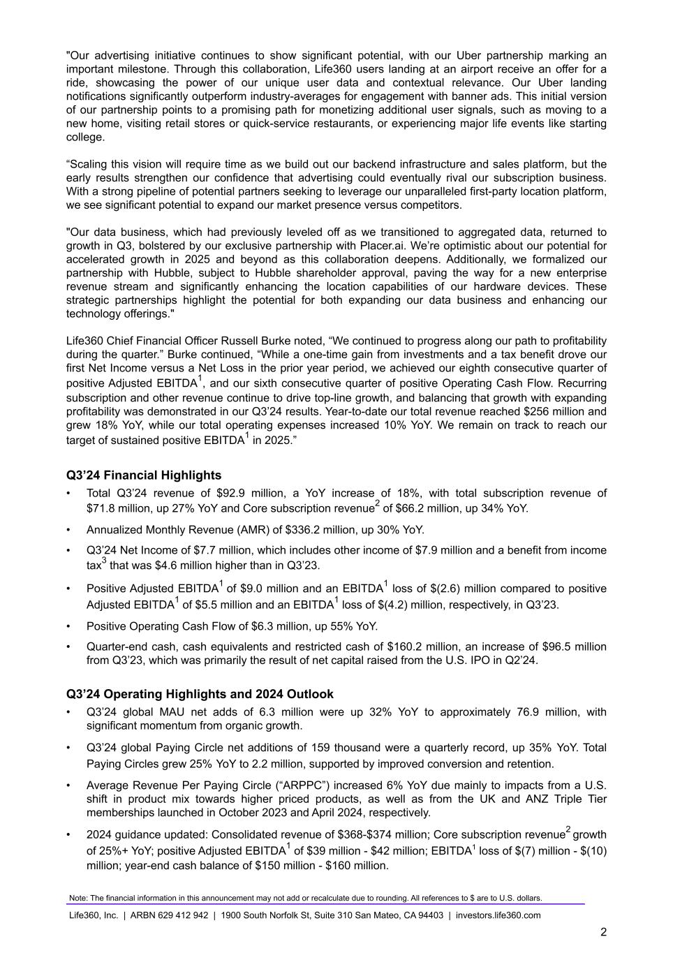 "Our advertising initiative continues to show significant potential, with our Uber partnership marking an important milestone. Through this collaboration, Life360 users landing at an airport receive an offer for a ride, showcasing the power of our unique user data and contextual relevance. Our Uber landing notifications significantly outperform industry-averages for engagement with banner ads. This initial version of our partnership points to a promising path for monetizing additional user signals, such as moving to a new home, visiting retail stores or quick-service restaurants, or experiencing major life events like starting college. “Scaling this vision will require time as we build out our backend infrastructure and sales platform, but the early results strengthen our confidence that advertising could eventually rival our subscription business. With a strong pipeline of potential partners seeking to leverage our unparalleled first-party location platform, we see significant potential to expand our market presence versus competitors. "Our data business, which had previously leveled off as we transitioned to aggregated data, returned to growth in Q3, bolstered by our exclusive partnership with Placer.ai. We’re optimistic about our potential for accelerated growth in 2025 and beyond as this collaboration deepens. Additionally, we formalized our partnership with Hubble, subject to Hubble shareholder approval, paving the way for a new enterprise revenue stream and significantly enhancing the location capabilities of our hardware devices. These strategic partnerships highlight the potential for both expanding our data business and enhancing our technology offerings." Life360 Chief Financial Officer Russell Burke noted, “We continued to progress along our path to profitability during the quarter.” Burke continued, “While a one-time gain from investments and a tax benefit drove our first Net Income versus a Net Loss in the prior year period, we achieved our eighth consecutive quarter of positive Adjusted EBITDA1, and our sixth consecutive quarter of positive Operating Cash Flow. Recurring subscription and other revenue continue to drive top-line growth, and balancing that growth with expanding profitability was demonstrated in our Q3’24 results. Year-to-date our total revenue reached $256 million and grew 18% YoY, while our total operating expenses increased 10% YoY. We remain on track to reach our target of sustained positive EBITDA1 in 2025.” Q3’24 Financial Highlights • Total Q3’24 revenue of $92.9 million, a YoY increase of 18%, with total subscription revenue of $71.8 million, up 27% YoY and Core subscription revenue2 of $66.2 million, up 34% YoY. • Annualized Monthly Revenue (AMR) of $336.2 million, up 30% YoY. • Q3’24 Net Income of $7.7 million, which includes other income of $7.9 million and a benefit from income tax3 that was $4.6 million higher than in Q3’23. • Positive Adjusted EBITDA1 of $9.0 million and an EBITDA1 loss of $(2.6) million compared to positive Adjusted EBITDA1 of $5.5 million and an EBITDA1 loss of $(4.2) million, respectively, in Q3’23. • Positive Operating Cash Flow of $6.3 million, up 55% YoY. • Quarter-end cash, cash equivalents and restricted cash of $160.2 million, an increase of $96.5 million from Q3’23, which was primarily the result of net capital raised from the U.S. IPO in Q2’24. Q3’24 Operating Highlights and 2024 Outlook • Q3’24 global MAU net adds of 6.3 million were up 32% YoY to approximately 76.9 million, with significant momentum from organic growth. • Q3’24 global Paying Circle net additions of 159 thousand were a quarterly record, up 35% YoY. Total Paying Circles grew 25% YoY to 2.2 million, supported by improved conversion and retention. • Average Revenue Per Paying Circle (“ARPPC”) increased 6% YoY due mainly to impacts from a U.S. shift in product mix towards higher priced products, as well as from the UK and ANZ Triple Tier memberships launched in October 2023 and April 2024, respectively. • 2024 guidance updated: Consolidated revenue of $368-$374 million; Core subscription revenue2 growth of 25%+ YoY; positive Adjusted EBITDA1 of $39 million - $42 million; EBITDA1 loss of $(7) million - $(10) million; year-end cash balance of $150 million - $160 million. Note: The financial information in this announcement may not add or recalculate due to rounding. All references to $ are to U.S. dollars. Life360, Inc. | ARBN 629 412 942 | 1900 South Norfolk St, Suite 310 San Mateo, CA 94403 | investors.life360.com 2
