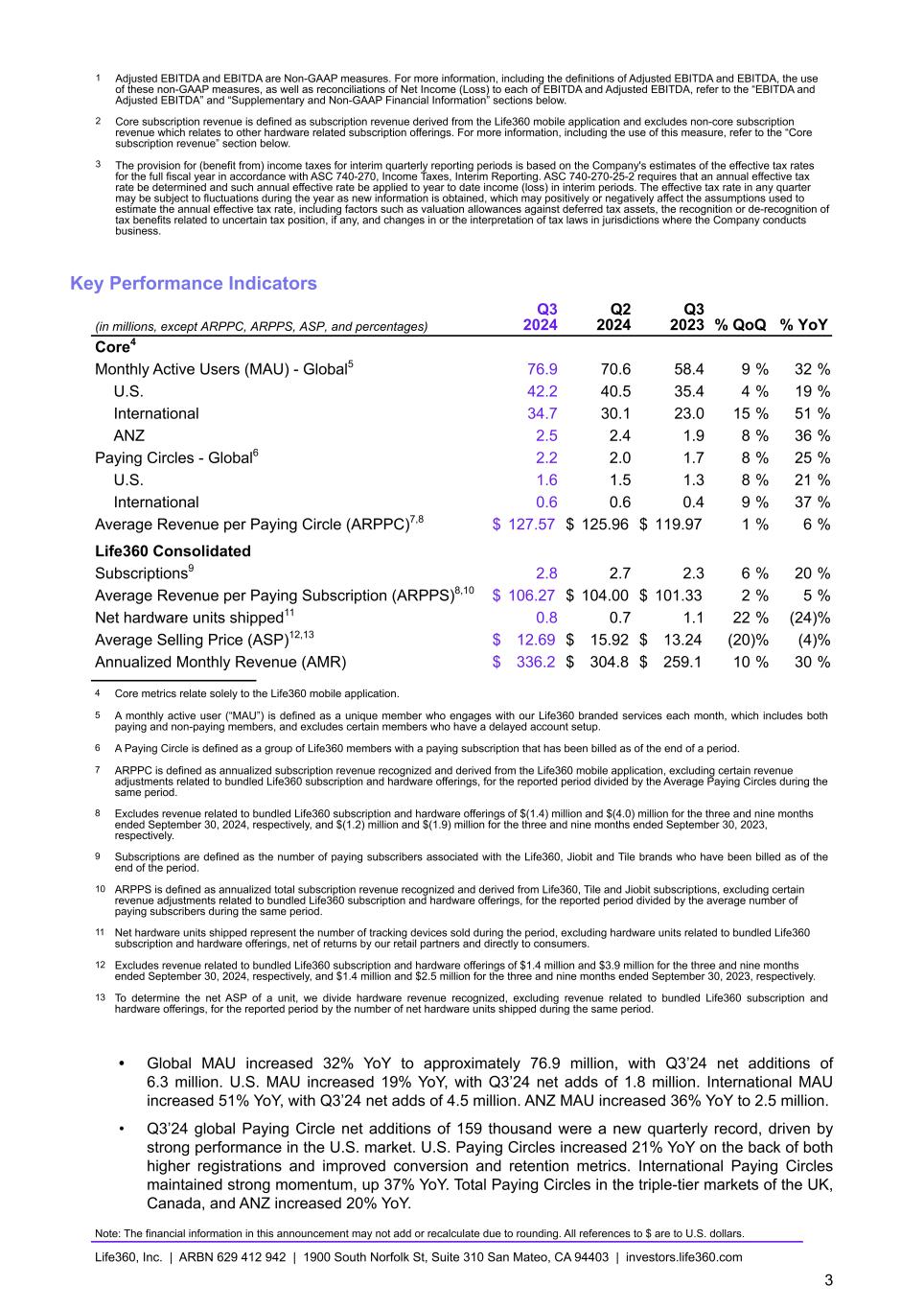 1 Adjusted EBITDA and EBITDA are Non-GAAP measures. For more information, including the definitions of Adjusted EBITDA and EBITDA, the use of these non-GAAP measures, as well as reconciliations of Net Income (Loss) to each of EBITDA and Adjusted EBITDA, refer to the “EBITDA and Adjusted EBITDA” and “Supplementary and Non-GAAP Financial Information” sections below. 2 Core subscription revenue is defined as subscription revenue derived from the Life360 mobile application and excludes non-core subscription revenue which relates to other hardware related subscription offerings. For more information, including the use of this measure, refer to the “Core subscription revenue” section below. 3 The provision for (benefit from) income taxes for interim quarterly reporting periods is based on the Company's estimates of the effective tax rates for the full fiscal year in accordance with ASC 740-270, Income Taxes, Interim Reporting. ASC 740-270-25-2 requires that an annual effective tax rate be determined and such annual effective rate be applied to year to date income (loss) in interim periods. The effective tax rate in any quarter may be subject to fluctuations during the year as new information is obtained, which may positively or negatively affect the assumptions used to estimate the annual effective tax rate, including factors such as valuation allowances against deferred tax assets, the recognition or de-recognition of tax benefits related to uncertain tax position, if any, and changes in or the interpretation of tax laws in jurisdictions where the Company conducts business. Key Performance Indicators (in millions, except ARPPC, ARPPS, ASP, and percentages) Q3 2024 Q2 2024 Q3 2023 % QoQ % YoY Core4 Monthly Active Users (MAU) - Global5 76.9 70.6 58.4 9 % 32 % U.S. 42.2 40.5 35.4 4 % 19 % International 34.7 30.1 23.0 15 % 51 % ANZ 2.5 2.4 1.9 8 % 36 % Paying Circles - Global6 2.2 2.0 1.7 8 % 25 % U.S. 1.6 1.5 1.3 8 % 21 % International 0.6 0.6 0.4 9 % 37 % Average Revenue per Paying Circle (ARPPC)7,8 $ 127.57 $ 125.96 $ 119.97 1 % 6 % Life360 Consolidated Subscriptions9 2.8 2.7 2.3 6 % 20 % Average Revenue per Paying Subscription (ARPPS)8,10 $ 106.27 $ 104.00 $ 101.33 2 % 5 % Net hardware units shipped11 0.8 0.7 1.1 22 % (24) % Average Selling Price (ASP)12,13 $ 12.69 $ 15.92 $ 13.24 (20) % (4) % Annualized Monthly Revenue (AMR) $ 336.2 $ 304.8 $ 259.1 10 % 30 % 4 Core metrics relate solely to the Life360 mobile application. 5 A monthly active user (“MAU”) is defined as a unique member who engages with our Life360 branded services each month, which includes both paying and non-paying members, and excludes certain members who have a delayed account setup. 6 A Paying Circle is defined as a group of Life360 members with a paying subscription that has been billed as of the end of a period. 7 ARPPC is defined as annualized subscription revenue recognized and derived from the Life360 mobile application, excluding certain revenue adjustments related to bundled Life360 subscription and hardware offerings, for the reported period divided by the Average Paying Circles during the same period. 8 Excludes revenue related to bundled Life360 subscription and hardware offerings of $(1.4) million and $(4.0) million for the three and nine months ended September 30, 2024, respectively, and $(1.2) million and $(1.9) million for the three and nine months ended September 30, 2023, respectively. 9 Subscriptions are defined as the number of paying subscribers associated with the Life360, Jiobit and Tile brands who have been billed as of the end of the period. 10 ARPPS is defined as annualized total subscription revenue recognized and derived from Life360, Tile and Jiobit subscriptions, excluding certain revenue adjustments related to bundled Life360 subscription and hardware offerings, for the reported period divided by the average number of paying subscribers during the same period. 11 Net hardware units shipped represent the number of tracking devices sold during the period, excluding hardware units related to bundled Life360 subscription and hardware offerings, net of returns by our retail partners and directly to consumers. 12 Excludes revenue related to bundled Life360 subscription and hardware offerings of $1.4 million and $3.9 million for the three and nine months ended September 30, 2024, respectively, and $1.4 million and $2.5 million for the three and nine months ended September 30, 2023, respectively. 13 To determine the net ASP of a unit, we divide hardware revenue recognized, excluding revenue related to bundled Life360 subscription and hardware offerings, for the reported period by the number of net hardware units shipped during the same period. • Global MAU increased 32% YoY to approximately 76.9 million, with Q3’24 net additions of 6.3 million. U.S. MAU increased 19% YoY, with Q3’24 net adds of 1.8 million. International MAU increased 51% YoY, with Q3’24 net adds of 4.5 million. ANZ MAU increased 36% YoY to 2.5 million. • Q3’24 global Paying Circle net additions of 159 thousand were a new quarterly record, driven by strong performance in the U.S. market. U.S. Paying Circles increased 21% YoY on the back of both higher registrations and improved conversion and retention metrics. International Paying Circles maintained strong momentum, up 37% YoY. Total Paying Circles in the triple-tier markets of the UK, Canada, and ANZ increased 20% YoY. Note: The financial information in this announcement may not add or recalculate due to rounding. All references to $ are to U.S. dollars. Life360, Inc. | ARBN 629 412 942 | 1900 South Norfolk St, Suite 310 San Mateo, CA 94403 | investors.life360.com 3