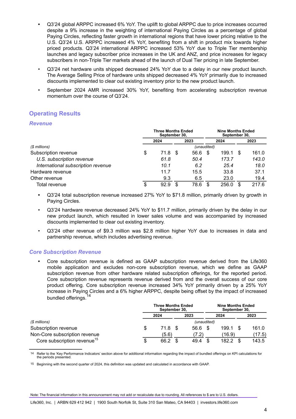 • Q3’24 global ARPPC increased 6% YoY. The uplift to global ARPPC due to price increases occurred despite a 9% increase in the weighting of international Paying Circles as a percentage of global Paying Circles, reflecting faster growth in international regions that have lower pricing relative to the U.S. Q3’24 U.S. ARPPC increased 4% YoY, benefiting from a shift in product mix towards higher priced products. Q3’24 international ARPPC increased 53% YoY due to Triple Tier membership launches and legacy subscriber price increases in the UK and ANZ, and price increases for legacy subscribers in non-Triple Tier markets ahead of the launch of Dual Tier pricing in late September. • Q3’24 net hardware units shipped decreased 24% YoY due to a delay in our new product launch. The Average Selling Price of hardware units shipped decreased 4% YoY primarily due to increased discounts implemented to clear out existing inventory prior to the new product launch. • September 2024 AMR increased 30% YoY, benefiting from accelerating subscription revenue momentum over the course of Q3’24. Operating Results Revenue Three Months Ended September 30, Nine Months Ended September 30, 2024 2023 2024 2023 ($ millions) (unaudited) Subscription revenue $ 71.8 $ 56.6 $ 199.1 $ 161.0 U.S. subscription revenue 61.8 50.4 173.7 143.0 International subscription revenue 10.1 6.2 25.4 18.0 Hardware revenue 11.7 15.5 33.8 37.1 Other revenue 9.3 6.5 23.0 19.4 Total revenue $ 92.9 $ 78.6 $ 256.0 $ 217.6 • Q3’24 total subscription revenue increased 27% YoY to $71.8 million, primarily driven by growth in Paying Circles. • Q3’24 hardware revenue decreased 24% YoY to $11.7 million, primarily driven by the delay in our new product launch, which resulted in lower sales volume and was accompanied by increased discounts implemented to clear out existing inventory. • Q3’24 other revenue of $9.3 million was $2.8 million higher YoY due to increases in data and partnership revenue, which includes advertising revenue. Core Subscription Revenue • Core subscription revenue is defined as GAAP subscription revenue derived from the Life360 mobile application and excludes non-core subscription revenue, which we define as GAAP subscription revenue from other hardware related subscription offerings, for the reported period. Core subscription revenue represents revenue derived from and the overall success of our core product offering. Core subscription revenue increased 34% YoY primarily driven by a 25% YoY increase in Paying Circles and a 6% higher ARPPC, despite being offset by the impact of increased bundled offerings.14 Three Months Ended September 30, Nine Months Ended September 30, 2024 2023 2024 2023 ($ millions) (unaudited) Subscription revenue $ 71.8 $ 56.6 $ 199.1 $ 161.0 Non-Core subscription revenue (5.6) (7.2) (16.9) (17.5) Core subscription revenue15 $ 66.2 $ 49.4 $ 182.2 $ 143.5 14 Refer to the ‘Key Performance Indicators’ section above for additional information regarding the impact of bundled offerings on KPI calculations for the periods presented. 15 Beginning with the second quarter of 2024, this definition was updated and calculated in accordance with GAAP. Note: The financial information in this announcement may not add or recalculate due to rounding. All references to $ are to U.S. dollars. Life360, Inc. | ARBN 629 412 942 | 1900 South Norfolk St, Suite 310 San Mateo, CA 94403 | investors.life360.com 4