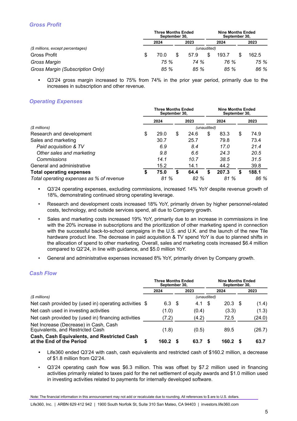 Gross Profit Three Months Ended September 30, Nine Months Ended September 30, 2024 2023 2024 2023 ($ millions, except percentages) (unaudited) Gross Profit $ 70.0 $ 57.9 $ 193.7 $ 162.5 Gross Margin 75 % 74 % 76 % 75 % Gross Margin (Subscription Only) 85 % 85 % 85 % 86 % • Q3’24 gross margin increased to 75% from 74% in the prior year period, primarily due to the increases in subscription and other revenue. Operating Expenses Three Months Ended September 30, Nine Months Ended September 30, 2024 2023 2024 2023 ($ millions) (unaudited) Research and development $ 29.0 $ 24.6 $ 83.3 $ 74.9 Sales and marketing 30.7 25.7 79.8 73.4 Paid acquisition & TV 6.9 8.4 17.0 21.4 Other sales and marketing 9.8 6.6 24.3 20.5 Commissions 14.1 10.7 38.5 31.5 General and administrative 15.2 14.1 44.2 39.8 Total operating expenses $ 75.0 $ 64.4 $ 207.3 $ 188.1 Total operating expenses as % of revenue 81 % 82 % 81 % 86 % • Q3’24 operating expenses, excluding commissions, increased 14% YoY despite revenue growth of 18%, demonstrating continued strong operating leverage. • Research and development costs increased 18% YoY, primarily driven by higher personnel-related costs, technology, and outside services spend, all due to Company growth. • Sales and marketing costs increased 19% YoY, primarily due to an increase in commissions in line with the 20% increase in subscriptions and the prioritization of other marketing spend in connection with the successful back-to-school campaigns in the U.S. and U.K. and the launch of the new Tile hardware product line. The decrease in paid acquisition & TV spend YoY is due to planned shifts in the allocation of spend to other marketing. Overall, sales and marketing costs increased $6.4 million compared to Q2’24, in line with guidance, and $5.0 million YoY. • General and administrative expenses increased 8% YoY, primarily driven by Company growth. Cash Flow Three Months Ended September 30, Nine Months Ended September 30, 2024 2023 2024 2023 ($ millions) (unaudited) Net cash provided by (used in) operating activities $ 6.3 $ 4.1 $ 20.3 $ (1.4) Net cash used in investing activities (1.0) (0.4) (3.3) (1.3) Net cash provided by (used in) financing activities (7.2) (4.2) 72.5 (24.0) Net Increase (Decrease) in Cash, Cash Equivalents, and Restricted Cash (1.8) (0.5) 89.5 (26.7) Cash, Cash Equivalents, and Restricted Cash at the End of the Period $ 160.2 $ 63.7 $ 160.2 $ 63.7 • Life360 ended Q3’24 with cash, cash equivalents and restricted cash of $160.2 million, a decrease of $1.8 million from Q2’24. • Q3’24 operating cash flow was $6.3 million. This was offset by $7.2 million used in financing activities primarily related to taxes paid for the net settlement of equity awards and $1.0 million used in investing activities related to payments for internally developed software. Note: The financial information in this announcement may not add or recalculate due to rounding. All references to $ are to U.S. dollars. Life360, Inc. | ARBN 629 412 942 | 1900 South Norfolk St, Suite 310 San Mateo, CA 94403 | investors.life360.com 5