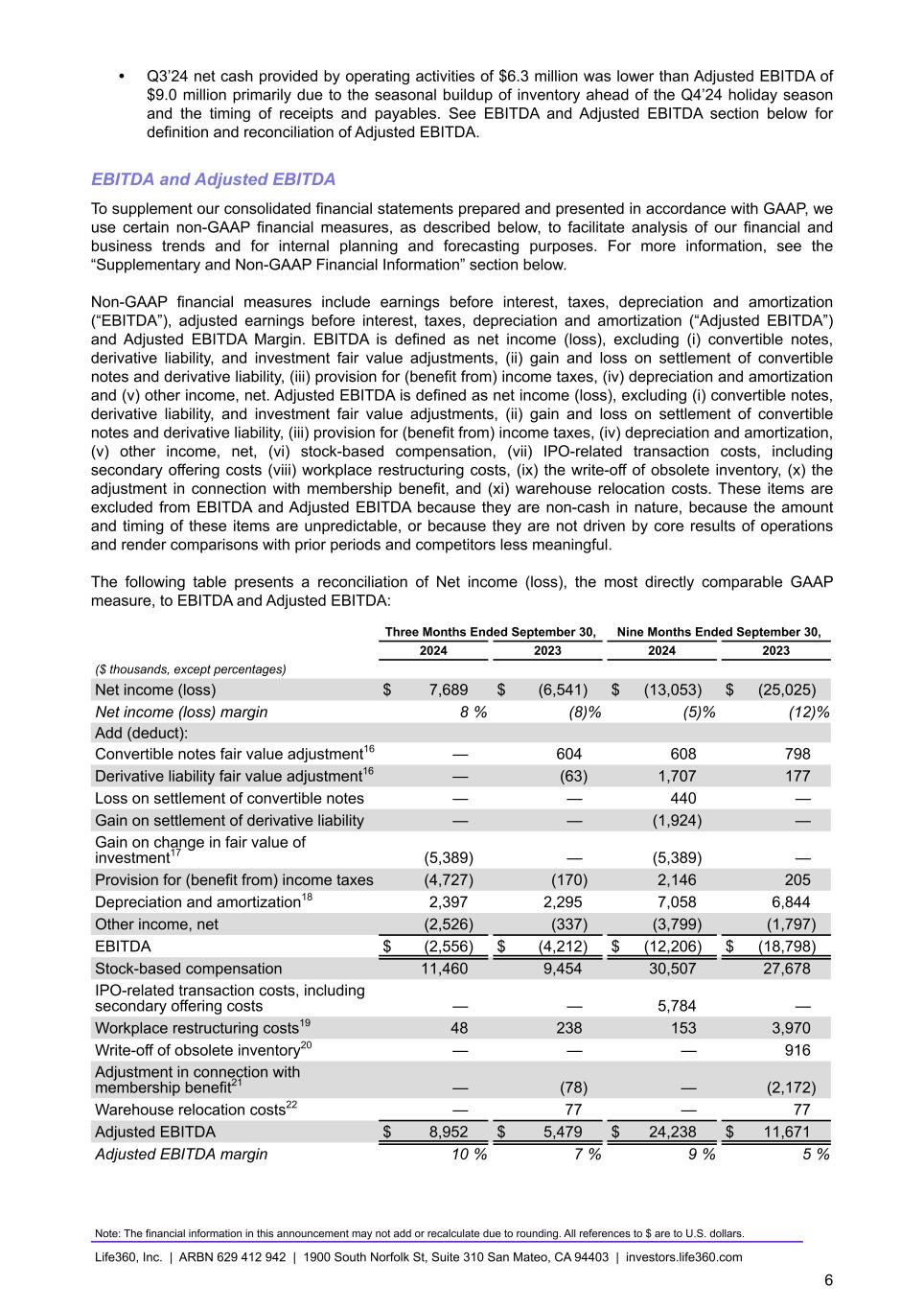 • Q3’24 net cash provided by operating activities of $6.3 million was lower than Adjusted EBITDA of $9.0 million primarily due to the seasonal buildup of inventory ahead of the Q4’24 holiday season and the timing of receipts and payables. See EBITDA and Adjusted EBITDA section below for definition and reconciliation of Adjusted EBITDA. EBITDA and Adjusted EBITDA To supplement our consolidated financial statements prepared and presented in accordance with GAAP, we use certain non-GAAP financial measures, as described below, to facilitate analysis of our financial and business trends and for internal planning and forecasting purposes. For more information, see the “Supplementary and Non-GAAP Financial Information” section below. Non-GAAP financial measures include earnings before interest, taxes, depreciation and amortization (“EBITDA”), adjusted earnings before interest, taxes, depreciation and amortization (“Adjusted EBITDA”) and Adjusted EBITDA Margin. EBITDA is defined as net income (loss), excluding (i) convertible notes, derivative liability, and investment fair value adjustments, (ii) gain and loss on settlement of convertible notes and derivative liability, (iii) provision for (benefit from) income taxes, (iv) depreciation and amortization and (v) other income, net. Adjusted EBITDA is defined as net income (loss), excluding (i) convertible notes, derivative liability, and investment fair value adjustments, (ii) gain and loss on settlement of convertible notes and derivative liability, (iii) provision for (benefit from) income taxes, (iv) depreciation and amortization, (v) other income, net, (vi) stock-based compensation, (vii) IPO-related transaction costs, including secondary offering costs (viii) workplace restructuring costs, (ix) the write-off of obsolete inventory, (x) the adjustment in connection with membership benefit, and (xi) warehouse relocation costs. These items are excluded from EBITDA and Adjusted EBITDA because they are non-cash in nature, because the amount and timing of these items are unpredictable, or because they are not driven by core results of operations and render comparisons with prior periods and competitors less meaningful. The following table presents a reconciliation of Net income (loss), the most directly comparable GAAP measure, to EBITDA and Adjusted EBITDA: Three Months Ended September 30, Nine Months Ended September 30, 2024 2023 2024 2023 ($ thousands, except percentages) Net income (loss) $ 7,689 $ (6,541) $ (13,053) $ (25,025) Net income (loss) margin 8 % (8) % (5) % (12) % Add (deduct): Convertible notes fair value adjustment16 — 604 608 798 Derivative liability fair value adjustment16 — (63) 1,707 177 Loss on settlement of convertible notes — — 440 — Gain on settlement of derivative liability — — (1,924) — Gain on change in fair value of investment17 (5,389) — (5,389) — Provision for (benefit from) income taxes (4,727) (170) 2,146 205 Depreciation and amortization18 2,397 2,295 7,058 6,844 Other income, net (2,526) (337) (3,799) (1,797) EBITDA $ (2,556) $ (4,212) $ (12,206) $ (18,798) Stock-based compensation 11,460 9,454 30,507 27,678 IPO-related transaction costs, including secondary offering costs — — 5,784 — Workplace restructuring costs19 48 238 153 3,970 Write-off of obsolete inventory20 — — — 916 Adjustment in connection with membership benefit21 — (78) — (2,172) Warehouse relocation costs22 — 77 — 77 Adjusted EBITDA $ 8,952 $ 5,479 $ 24,238 $ 11,671 Adjusted EBITDA margin 10 % 7 % 9 % 5 % Note: The financial information in this announcement may not add or recalculate due to rounding. All references to $ are to U.S. dollars. Life360, Inc. | ARBN 629 412 942 | 1900 South Norfolk St, Suite 310 San Mateo, CA 94403 | investors.life360.com 6