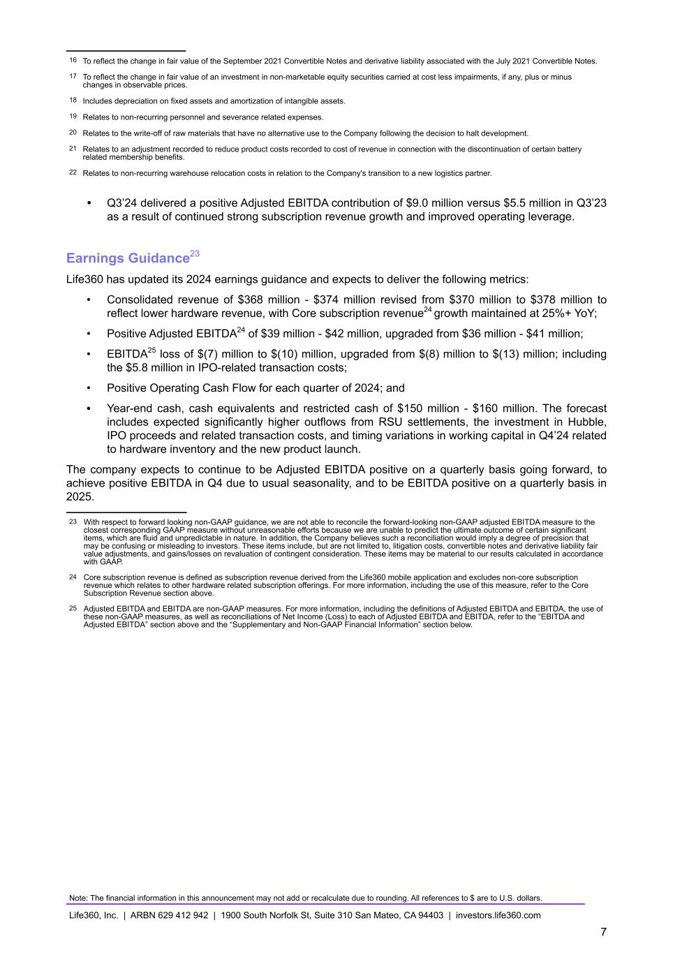 16 To reflect the change in fair value of the September 2021 Convertible Notes and derivative liability associated with the July 2021 Convertible Notes. 17 To reflect the change in fair value of an investment in non-marketable equity securities carried at cost less impairments, if any, plus or minus changes in observable prices. 18 Includes depreciation on fixed assets and amortization of intangible assets. 19 Relates to non-recurring personnel and severance related expenses. 20 Relates to the write-off of raw materials that have no alternative use to the Company following the decision to halt development. 21 Relates to an adjustment recorded to reduce product costs recorded to cost of revenue in connection with the discontinuation of certain battery related membership benefits. 22 Relates to non-recurring warehouse relocation costs in relation to the Company's transition to a new logistics partner. • Q3’24 delivered a positive Adjusted EBITDA contribution of $9.0 million versus $5.5 million in Q3’23 as a result of continued strong subscription revenue growth and improved operating leverage. Earnings Guidance23 Life360 has updated its 2024 earnings guidance and expects to deliver the following metrics: • Consolidated revenue of $368 million - $374 million revised from $370 million to $378 million to reflect lower hardware revenue, with Core subscription revenue24 growth maintained at 25%+ YoY; • Positive Adjusted EBITDA24 of $39 million - $42 million, upgraded from $36 million - $41 million; • EBITDA25 loss of $(7) million to $(10) million, upgraded from $(8) million to $(13) million; including the $5.8 million in IPO-related transaction costs; • Positive Operating Cash Flow for each quarter of 2024; and • Year-end cash, cash equivalents and restricted cash of $150 million - $160 million. The forecast includes expected significantly higher outflows from RSU settlements, the investment in Hubble, IPO proceeds and related transaction costs, and timing variations in working capital in Q4’24 related to hardware inventory and the new product launch. The company expects to continue to be Adjusted EBITDA positive on a quarterly basis going forward, to achieve positive EBITDA in Q4 due to usual seasonality, and to be EBITDA positive on a quarterly basis in 2025. 23 With respect to forward looking non-GAAP guidance, we are not able to reconcile the forward-looking non-GAAP adjusted EBITDA measure to the closest corresponding GAAP measure without unreasonable efforts because we are unable to predict the ultimate outcome of certain significant items, which are fluid and unpredictable in nature. In addition, the Company believes such a reconciliation would imply a degree of precision that may be confusing or misleading to investors. These items include, but are not limited to, litigation costs, convertible notes and derivative liability fair value adjustments, and gains/losses on revaluation of contingent consideration. These items may be material to our results calculated in accordance with GAAP. 24 Core subscription revenue is defined as subscription revenue derived from the Life360 mobile application and excludes non-core subscription revenue which relates to other hardware related subscription offerings. For more information, including the use of this measure, refer to the Core Subscription Revenue section above. 25 Adjusted EBITDA and EBITDA are non-GAAP measures. For more information, including the definitions of Adjusted EBITDA and EBITDA, the use of these non-GAAP measures, as well as reconciliations of Net Income (Loss) to each of Adjusted EBITDA and EBITDA, refer to the “EBITDA and Adjusted EBITDA” section above and the “Supplementary and Non-GAAP Financial Information” section below. Note: The financial information in this announcement may not add or recalculate due to rounding. All references to $ are to U.S. dollars. Life360, Inc. | ARBN 629 412 942 | 1900 South Norfolk St, Suite 310 San Mateo, CA 94403 | investors.life360.com 7