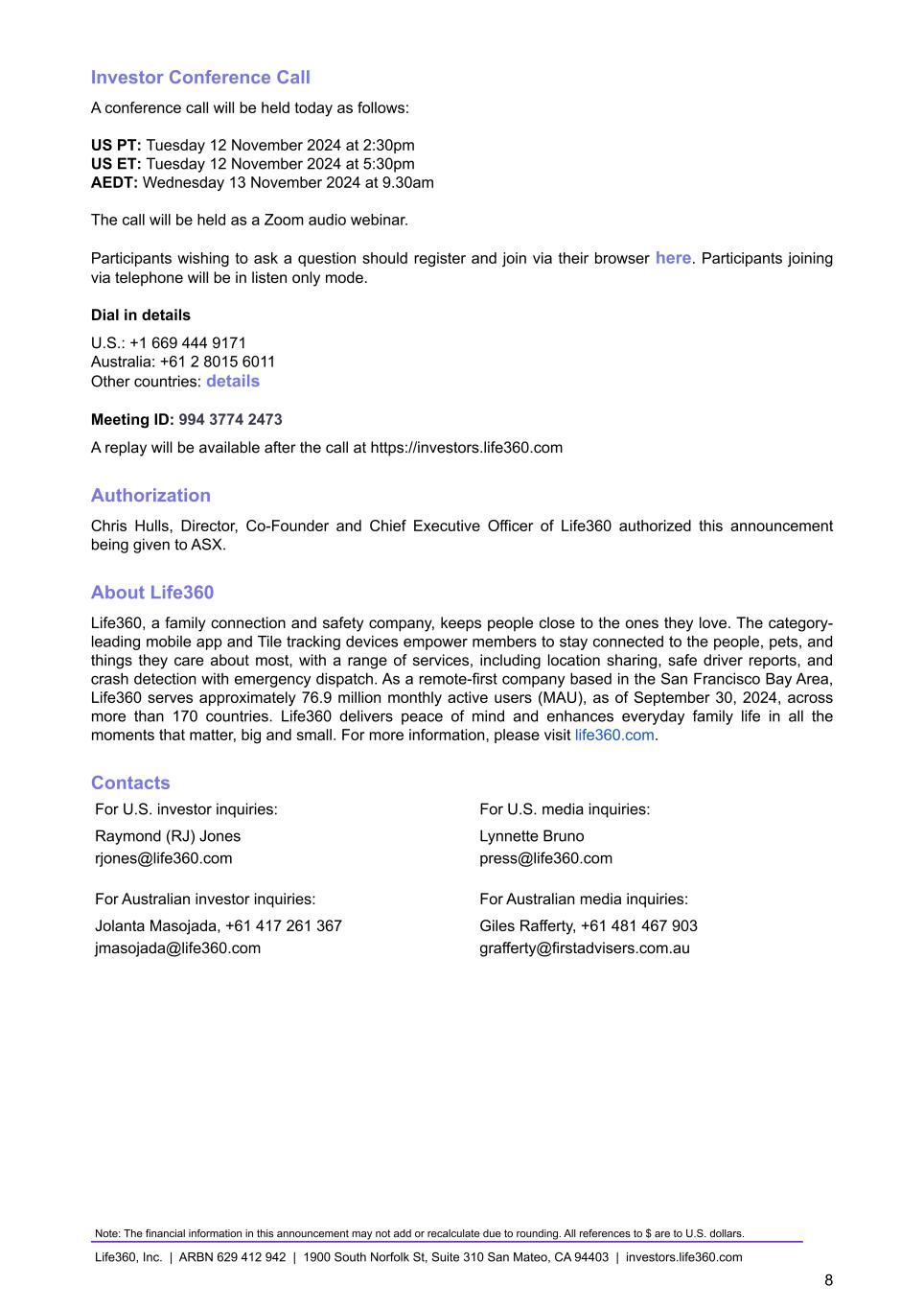 Investor Conference Call A conference call will be held today as follows: US PT: Tuesday 12 November 2024 at 2:30pm US ET: Tuesday 12 November 2024 at 5:30pm AEDT: Wednesday 13 November 2024 at 9.30am The call will be held as a Zoom audio webinar. Participants wishing to ask a question should register and join via their browser here. Participants joining via telephone will be in listen only mode. Dial in details U.S.: +1 669 444 9171 Australia: +61 2 8015 6011 Other countries: details Meeting ID: 994 3774 2473 A replay will be available after the call at https://investors.life360.com Authorization Chris Hulls, Director, Co-Founder and Chief Executive Officer of Life360 authorized this announcement being given to ASX. About Life360 Life360, a family connection and safety company, keeps people close to the ones they love. The category- leading mobile app and Tile tracking devices empower members to stay connected to the people, pets, and things they care about most, with a range of services, including location sharing, safe driver reports, and crash detection with emergency dispatch. As a remote-first company based in the San Francisco Bay Area, Life360 serves approximately 76.9 million monthly active users (MAU), as of September 30, 2024, across more than 170 countries. Life360 delivers peace of mind and enhances everyday family life in all the moments that matter, big and small. For more information, please visit life360.com. Contacts For U.S. investor inquiries: For U.S. media inquiries: Raymond (RJ) Jones Lynnette Bruno rjones@life360.com press@life360.com For Australian investor inquiries: For Australian media inquiries: Jolanta Masojada, +61 417 261 367 Giles Rafferty, +61 481 467 903 jmasojada@life360.com grafferty@firstadvisers.com.au Note: The financial information in this announcement may not add or recalculate due to rounding. All references to $ are to U.S. dollars. Life360, Inc. | ARBN 629 412 942 | 1900 South Norfolk St, Suite 310 San Mateo, CA 94403 | investors.life360.com 8