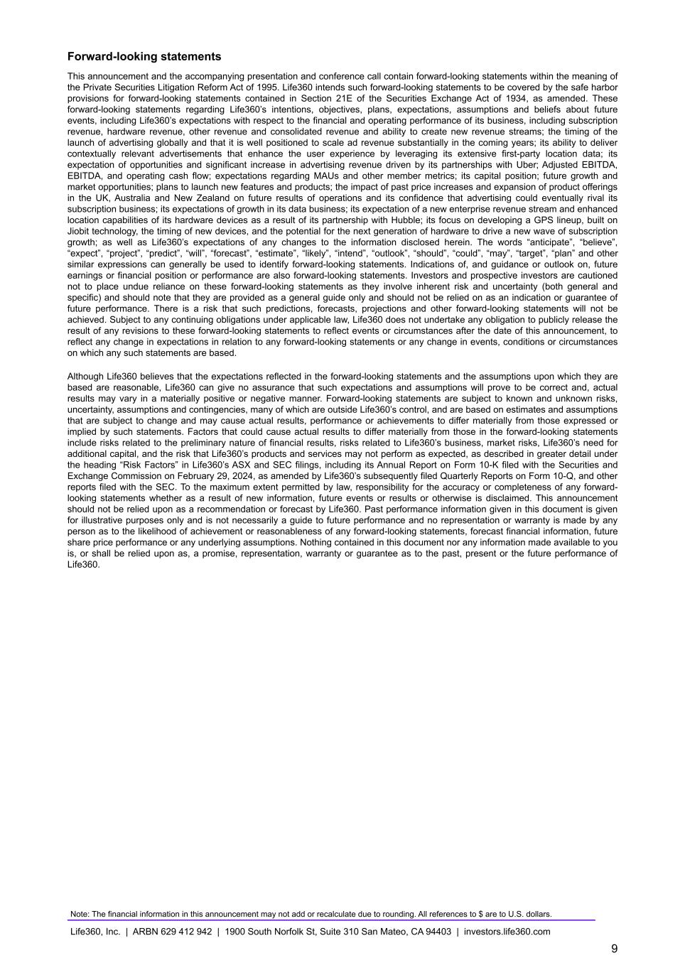 Forward-looking statements This announcement and the accompanying presentation and conference call contain forward-looking statements within the meaning of the Private Securities Litigation Reform Act of 1995. Life360 intends such forward-looking statements to be covered by the safe harbor provisions for forward-looking statements contained in Section 21E of the Securities Exchange Act of 1934, as amended. These forward-looking statements regarding Life360’s intentions, objectives, plans, expectations, assumptions and beliefs about future events, including Life360’s expectations with respect to the financial and operating performance of its business, including subscription revenue, hardware revenue, other revenue and consolidated revenue and ability to create new revenue streams; the timing of the launch of advertising globally and that it is well positioned to scale ad revenue substantially in the coming years; its ability to deliver contextually relevant advertisements that enhance the user experience by leveraging its extensive first-party location data; its expectation of opportunities and significant increase in advertising revenue driven by its partnerships with Uber; Adjusted EBITDA, EBITDA, and operating cash flow; expectations regarding MAUs and other member metrics; its capital position; future growth and market opportunities; plans to launch new features and products; the impact of past price increases and expansion of product offerings in the UK, Australia and New Zealand on future results of operations and its confidence that advertising could eventually rival its subscription business; its expectations of growth in its data business; its expectation of a new enterprise revenue stream and enhanced location capabilities of its hardware devices as a result of its partnership with Hubble; its focus on developing a GPS lineup, built on Jiobit technology, the timing of new devices, and the potential for the next generation of hardware to drive a new wave of subscription growth; as well as Life360’s expectations of any changes to the information disclosed herein. The words “anticipate”, “believe”, “expect”, “project”, “predict”, “will”, “forecast”, “estimate”, “likely”, “intend”, “outlook”, “should”, “could”, “may”, “target”, “plan” and other similar expressions can generally be used to identify forward-looking statements. Indications of, and guidance or outlook on, future earnings or financial position or performance are also forward-looking statements. Investors and prospective investors are cautioned not to place undue reliance on these forward-looking statements as they involve inherent risk and uncertainty (both general and specific) and should note that they are provided as a general guide only and should not be relied on as an indication or guarantee of future performance. There is a risk that such predictions, forecasts, projections and other forward-looking statements will not be achieved. Subject to any continuing obligations under applicable law, Life360 does not undertake any obligation to publicly release the result of any revisions to these forward-looking statements to reflect events or circumstances after the date of this announcement, to reflect any change in expectations in relation to any forward-looking statements or any change in events, conditions or circumstances on which any such statements are based. Although Life360 believes that the expectations reflected in the forward-looking statements and the assumptions upon which they are based are reasonable, Life360 can give no assurance that such expectations and assumptions will prove to be correct and, actual results may vary in a materially positive or negative manner. Forward-looking statements are subject to known and unknown risks, uncertainty, assumptions and contingencies, many of which are outside Life360’s control, and are based on estimates and assumptions that are subject to change and may cause actual results, performance or achievements to differ materially from those expressed or implied by such statements. Factors that could cause actual results to differ materially from those in the forward-looking statements include risks related to the preliminary nature of financial results, risks related to Life360’s business, market risks, Life360’s need for additional capital, and the risk that Life360’s products and services may not perform as expected, as described in greater detail under the heading “Risk Factors” in Life360’s ASX and SEC filings, including its Annual Report on Form 10-K filed with the Securities and Exchange Commission on February 29, 2024, as amended by Life360’s subsequently filed Quarterly Reports on Form 10-Q, and other reports filed with the SEC. To the maximum extent permitted by law, responsibility for the accuracy or completeness of any forward- looking statements whether as a result of new information, future events or results or otherwise is disclaimed. This announcement should not be relied upon as a recommendation or forecast by Life360. Past performance information given in this document is given for illustrative purposes only and is not necessarily a guide to future performance and no representation or warranty is made by any person as to the likelihood of achievement or reasonableness of any forward-looking statements, forecast financial information, future share price performance or any underlying assumptions. Nothing contained in this document nor any information made available to you is, or shall be relied upon as, a promise, representation, warranty or guarantee as to the past, present or the future performance of Life360. Note: The financial information in this announcement may not add or recalculate due to rounding. All references to $ are to U.S. dollars. Life360, Inc. | ARBN 629 412 942 | 1900 South Norfolk St, Suite 310 San Mateo, CA 94403 | investors.life360.com 9