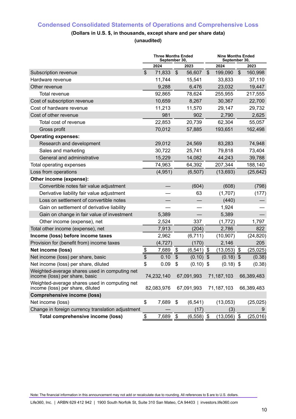 Condensed Consolidated Statements of Operations and Comprehensive Loss (Dollars in U.S. $, in thousands, except share and per share data) (unaudited) Three Months Ended September 30, Nine Months Ended September 30, 2024 2023 2024 2023 Subscription revenue $ 71,833 $ 56,607 $ 199,090 $ 160,998 Hardware revenue 11,744 15,541 33,833 37,110 Other revenue 9,288 6,476 23,032 19,447 Total revenue 92,865 78,624 255,955 217,555 Cost of subscription revenue 10,659 8,267 30,367 22,700 Cost of hardware revenue 11,213 11,570 29,147 29,732 Cost of other revenue 981 902 2,790 2,625 Total cost of revenue 22,853 20,739 62,304 55,057 Gross profit 70,012 57,885 193,651 162,498 Operating expenses: Research and development 29,012 24,569 83,283 74,948 Sales and marketing 30,722 25,741 79,818 73,404 General and administrative 15,229 14,082 44,243 39,788 Total operating expenses 74,963 64,392 207,344 188,140 Loss from operations (4,951) (6,507) (13,693) (25,642) Other income (expense): Convertible notes fair value adjustment — (604) (608) (798) Derivative liability fair value adjustment — 63 (1,707) (177) Loss on settlement of convertible notes — — (440) — Gain on settlement of derivative liability — — 1,924 — Gain on change in fair value of investment 5,389 — 5,389 — Other income (expense), net 2,524 337 (1,772) 1,797 Total other income (expense), net 7,913 (204) 2,786 822 Income (loss) before income taxes 2,962 (6,711) (10,907) (24,820) Provision for (benefit from) income taxes (4,727) (170) 2,146 205 Net income (loss) $ 7,689 — $ (6,541) $ (13,053) $ (25,025) Net income (loss) per share, basic $ 0.10 $ (0.10) $ (0.18) $ (0.38) Net income (loss) per share, diluted $ 0.09 $ (0.10) $ (0.18) $ (0.38) Weighted-average shares used in computing net income (loss) per share, basic 74,232,140 67,091,993 71,187,103 66,389,483 Weighted-average shares used in computing net income (loss) per share, diluted 82,083,976 67,091,993 71,187,103 66,389,483 Comprehensive income (loss) Net income (loss) $ 7,689 $ (6,541) (13,053) (25,025) Change in foreign currency translation adjustment — (17) (3) 9 Total comprehensive income (loss) $ 7,689 $ (6,558) $ (13,056) $ (25,016) Note: The financial information in this announcement may not add or recalculate due to rounding. All references to $ are to U.S. dollars. Life360, Inc. | ARBN 629 412 942 | 1900 South Norfolk St, Suite 310 San Mateo, CA 94403 | investors.life360.com 10