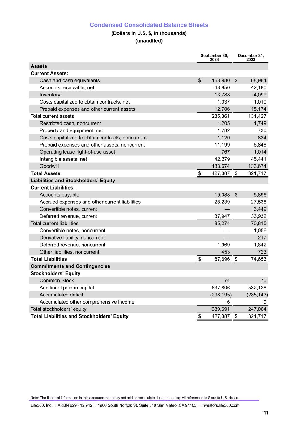 Condensed Consolidated Balance Sheets (Dollars in U.S. $, in thousands) (unaudited) September 30, 2024 December 31, 2023 Assets Current Assets: Cash and cash equivalents $ 158,980 $ 68,964 Accounts receivable, net 48,850 42,180 Inventory 13,788 4,099 Costs capitalized to obtain contracts, net 1,037 1,010 Prepaid expenses and other current assets 12,706 15,174 Total current assets 235,361 131,427 Restricted cash, noncurrent 1,205 1,749 Property and equipment, net 1,782 730 Costs capitalized to obtain contracts, noncurrent 1,120 834 Prepaid expenses and other assets, noncurrent 11,199 6,848 Operating lease right-of-use asset 767 1,014 Intangible assets, net 42,279 45,441 Goodwill 133,674 133,674 Total Assets $ 427,387 $ 321,717 Liabilities and Stockholders’ Equity Current Liabilities: Accounts payable 19,088 $ 5,896 Accrued expenses and other current liabilities 28,239 27,538 Convertible notes, current — 3,449 Deferred revenue, current 37,947 33,932 Total current liabilities 85,274 70,815 Convertible notes, noncurrent — 1,056 Derivative liability, noncurrent — 217 Deferred revenue, noncurrent 1,969 1,842 Other liabilities, noncurrent 453 723 Total Liabilities $ 87,696 $ 74,653 Commitments and Contingencies Stockholders’ Equity Common Stock 74 70 Additional paid-in capital 637,806 532,128 Accumulated deficit (298,195) (285,143) Accumulated other comprehensive income 6 9 Total stockholders’ equity 339,691 247,064 Total Liabilities and Stockholders’ Equity $ 427,387 $ 321,717 Note: The financial information in this announcement may not add or recalculate due to rounding. All references to $ are to U.S. dollars. Life360, Inc. | ARBN 629 412 942 | 1900 South Norfolk St, Suite 310 San Mateo, CA 94403 | investors.life360.com 11