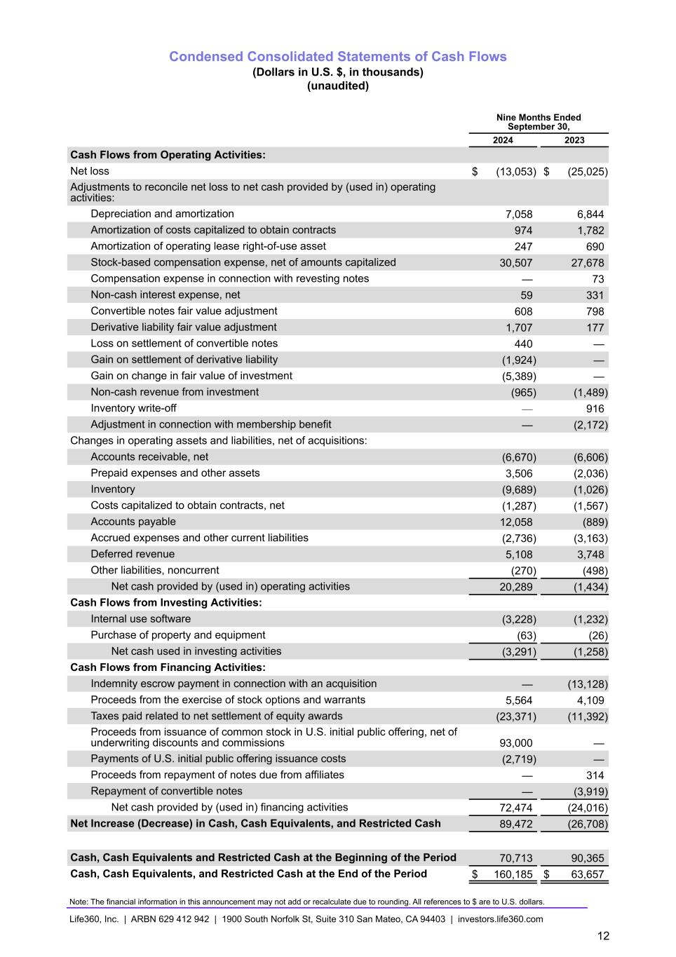 Condensed Consolidated Statements of Cash Flows (Dollars in U.S. $, in thousands) (unaudited) Nine Months Ended September 30, 2024 2023 Cash Flows from Operating Activities: Net loss $ (13,053) $ (25,025) Adjustments to reconcile net loss to net cash provided by (used in) operating activities: Depreciation and amortization 7,058 6,844 Amortization of costs capitalized to obtain contracts 974 1,782 Amortization of operating lease right-of-use asset 247 690 Stock-based compensation expense, net of amounts capitalized 30,507 27,678 Compensation expense in connection with revesting notes — 73 Non-cash interest expense, net 59 331 Convertible notes fair value adjustment 608 798 Derivative liability fair value adjustment 1,707 177 Loss on settlement of convertible notes 440 — Gain on settlement of derivative liability (1,924) — Gain on change in fair value of investment (5,389) — Non-cash revenue from investment (965) (1,489) Inventory write-off — 916 Adjustment in connection with membership benefit — (2,172) Changes in operating assets and liabilities, net of acquisitions: Accounts receivable, net (6,670) (6,606) Prepaid expenses and other assets 3,506 (2,036) Inventory (9,689) (1,026) Costs capitalized to obtain contracts, net (1,287) (1,567) Accounts payable 12,058 (889) Accrued expenses and other current liabilities (2,736) (3,163) Deferred revenue 5,108 3,748 Other liabilities, noncurrent (270) (498) Net cash provided by (used in) operating activities 20,289 (1,434) Cash Flows from Investing Activities: Internal use software (3,228) (1,232) Purchase of property and equipment (63) (26) Net cash used in investing activities (3,291) (1,258) Cash Flows from Financing Activities: Indemnity escrow payment in connection with an acquisition — (13,128) Proceeds from the exercise of stock options and warrants 5,564 4,109 Taxes paid related to net settlement of equity awards (23,371) (11,392) Proceeds from issuance of common stock in U.S. initial public offering, net of underwriting discounts and commissions 93,000 — Payments of U.S. initial public offering issuance costs (2,719) — Proceeds from repayment of notes due from affiliates — 314 Repayment of convertible notes — (3,919) Net cash provided by (used in) financing activities 72,474 (24,016) Net Increase (Decrease) in Cash, Cash Equivalents, and Restricted Cash 89,472 (26,708) Cash, Cash Equivalents and Restricted Cash at the Beginning of the Period 70,713 90,365 Cash, Cash Equivalents, and Restricted Cash at the End of the Period $ 160,185 $ 63,657 Note: The financial information in this announcement may not add or recalculate due to rounding. All references to $ are to U.S. dollars. Life360, Inc. | ARBN 629 412 942 | 1900 South Norfolk St, Suite 310 San Mateo, CA 94403 | investors.life360.com 12