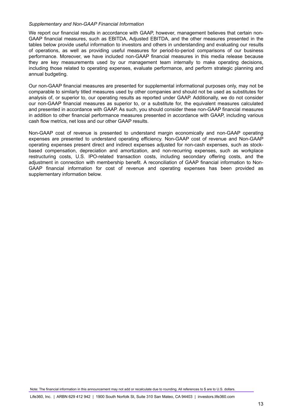 Supplementary and Non-GAAP Financial Information We report our financial results in accordance with GAAP, however, management believes that certain non- GAAP financial measures, such as EBITDA, Adjusted EBITDA, and the other measures presented in the tables below provide useful information to investors and others in understanding and evaluating our results of operations, as well as providing useful measures for period-to-period comparisons of our business performance. Moreover, we have included non-GAAP financial measures in this media release because they are key measurements used by our management team internally to make operating decisions, including those related to operating expenses, evaluate performance, and perform strategic planning and annual budgeting. Our non-GAAP financial measures are presented for supplemental informational purposes only, may not be comparable to similarly titled measures used by other companies and should not be used as substitutes for analysis of, or superior to, our operating results as reported under GAAP. Additionally, we do not consider our non-GAAP financial measures as superior to, or a substitute for, the equivalent measures calculated and presented in accordance with GAAP. As such, you should consider these non-GAAP financial measures in addition to other financial performance measures presented in accordance with GAAP, including various cash flow metrics, net loss and our other GAAP results. Non-GAAP cost of revenue is presented to understand margin economically and non-GAAP operating expenses are presented to understand operating efficiency. Non-GAAP cost of revenue and Non-GAAP operating expenses present direct and indirect expenses adjusted for non-cash expenses, such as stock- based compensation, depreciation and amortization, and non-recurring expenses, such as workplace restructuring costs, U.S. IPO-related transaction costs, including secondary offering costs, and the adjustment in connection with membership benefit. A reconciliation of GAAP financial information to Non- GAAP financial information for cost of revenue and operating expenses has been provided as supplementary information below. Note: The financial information in this announcement may not add or recalculate due to rounding. All references to $ are to U.S. dollars. Life360, Inc. | ARBN 629 412 942 | 1900 South Norfolk St, Suite 310 San Mateo, CA 94403 | investors.life360.com 13