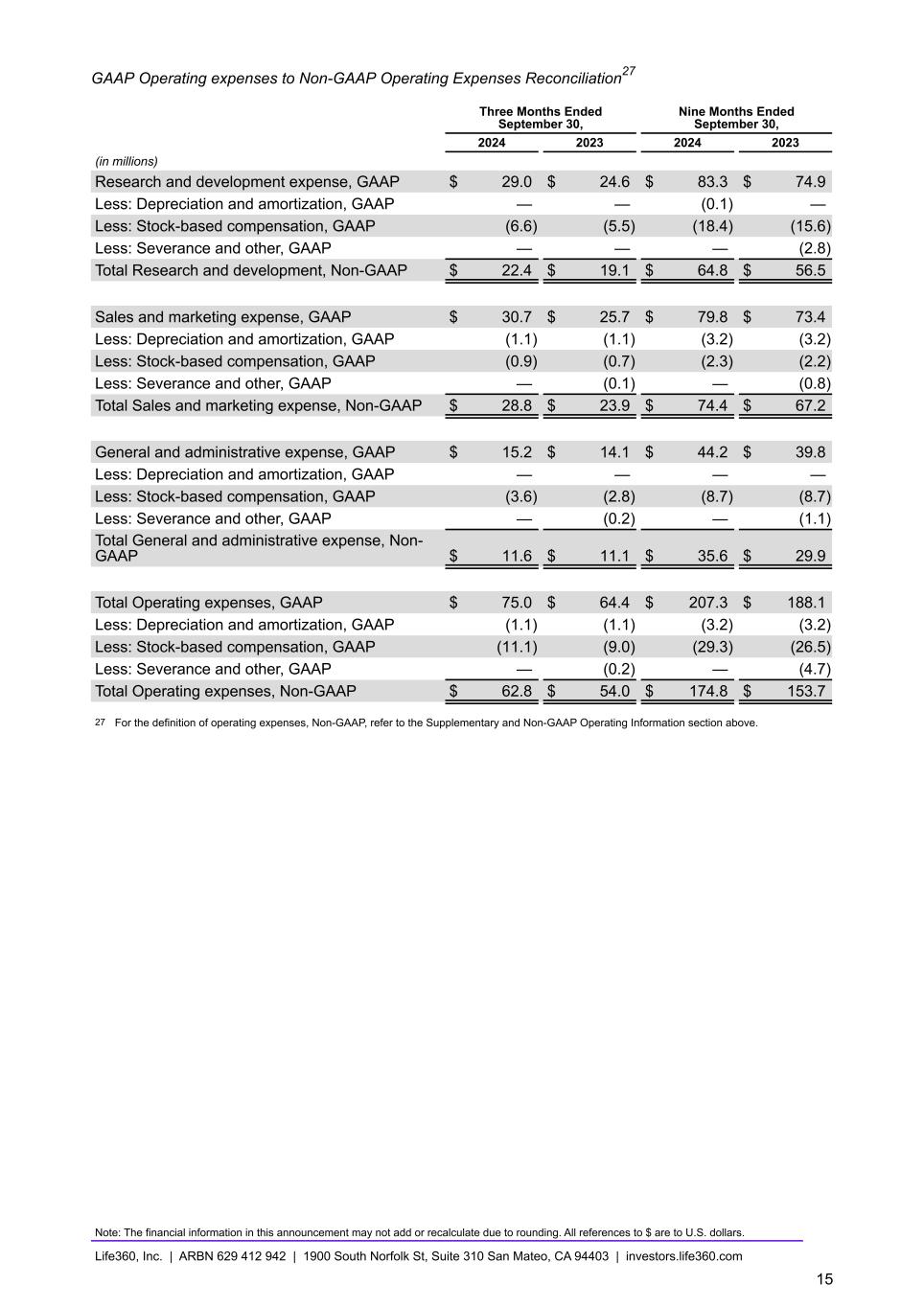 GAAP Operating expenses to Non-GAAP Operating Expenses Reconciliation27 Three Months Ended September 30, Nine Months Ended September 30, 2024 2023 2024 2023 (in millions) Research and development expense, GAAP $ 29.0 $ 24.6 $ 83.3 $ 74.9 Less: Depreciation and amortization, GAAP — — (0.1) — Less: Stock-based compensation, GAAP (6.6) (5.5) (18.4) (15.6) Less: Severance and other, GAAP — — — (2.8) Total Research and development, Non-GAAP $ 22.4 $ 19.1 $ 64.8 $ 56.5 Sales and marketing expense, GAAP $ 30.7 $ 25.7 $ 79.8 $ 73.4 Less: Depreciation and amortization, GAAP (1.1) (1.1) (3.2) (3.2) Less: Stock-based compensation, GAAP (0.9) (0.7) (2.3) (2.2) Less: Severance and other, GAAP — (0.1) — (0.8) Total Sales and marketing expense, Non-GAAP $ 28.8 $ 23.9 $ 74.4 $ 67.2 General and administrative expense, GAAP $ 15.2 $ 14.1 $ 44.2 $ 39.8 Less: Depreciation and amortization, GAAP — — — — Less: Stock-based compensation, GAAP (3.6) (2.8) (8.7) (8.7) Less: Severance and other, GAAP — (0.2) — (1.1) Total General and administrative expense, Non- GAAP $ 11.6 $ 11.1 $ 35.6 $ 29.9 Total Operating expenses, GAAP $ 75.0 $ 64.4 $ 207.3 $ 188.1 Less: Depreciation and amortization, GAAP (1.1) (1.1) (3.2) (3.2) Less: Stock-based compensation, GAAP (11.1) (9.0) (29.3) (26.5) Less: Severance and other, GAAP — (0.2) — (4.7) Total Operating expenses, Non-GAAP $ 62.8 $ 54.0 $ — $ 174.8 $ 153.7 27 For the definition of operating expenses, Non-GAAP, refer to the Supplementary and Non-GAAP Operating Information section above. Note: The financial information in this announcement may not add or recalculate due to rounding. All references to $ are to U.S. dollars. Life360, Inc. | ARBN 629 412 942 | 1900 South Norfolk St, Suite 310 San Mateo, CA 94403 | investors.life360.com 15